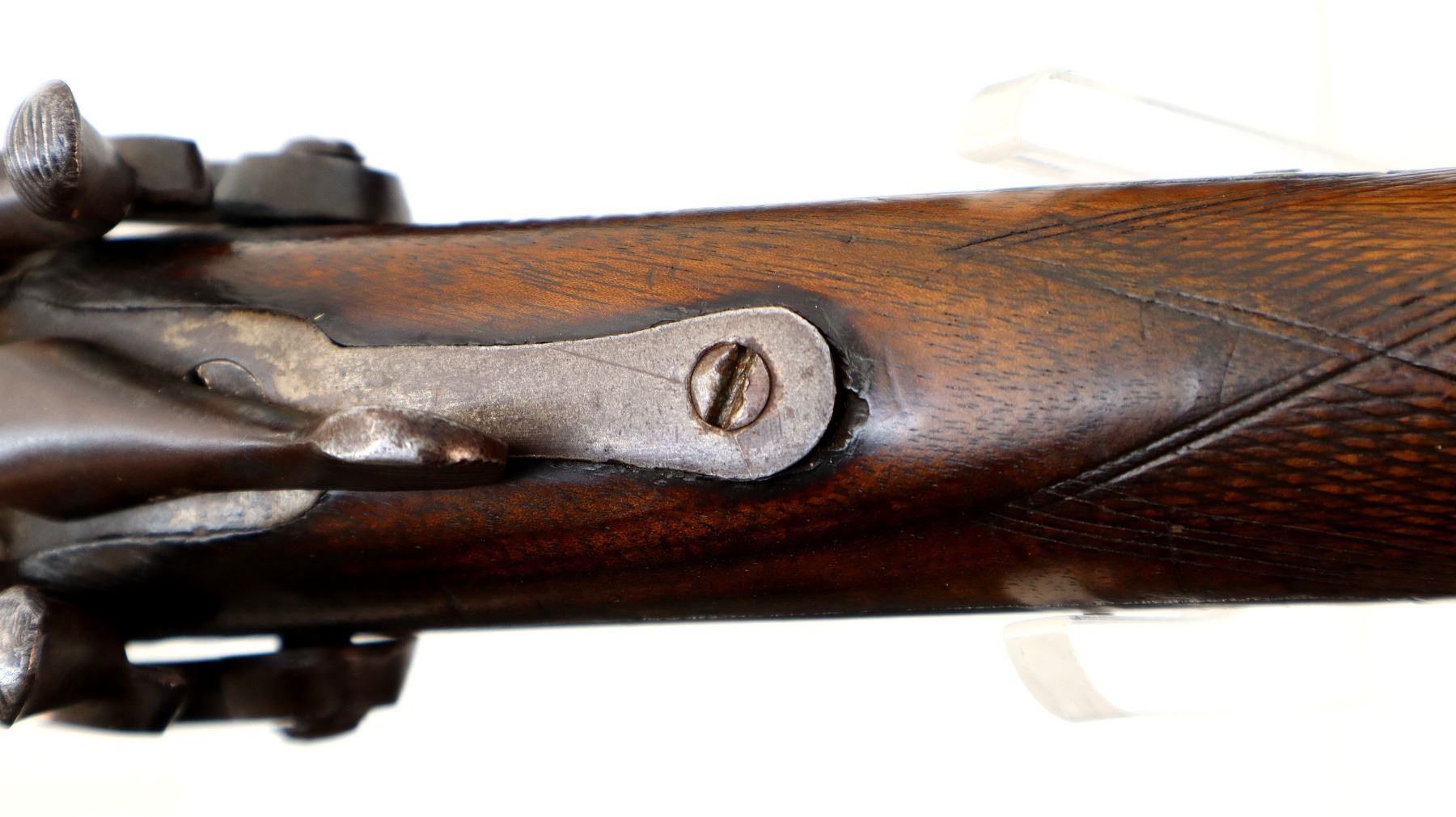 Main Description: Brass bead, grooved rib, barrels are loose on face, back action locks with grooved spur hammers that require repair, extractor, double triggers. Two piece wood stocks, checkered forearm and pistol grip, chipped and cracked behind receiver and locks, groove steel butt plate
