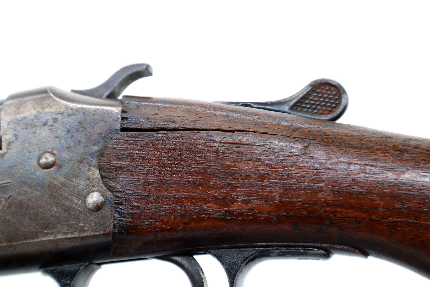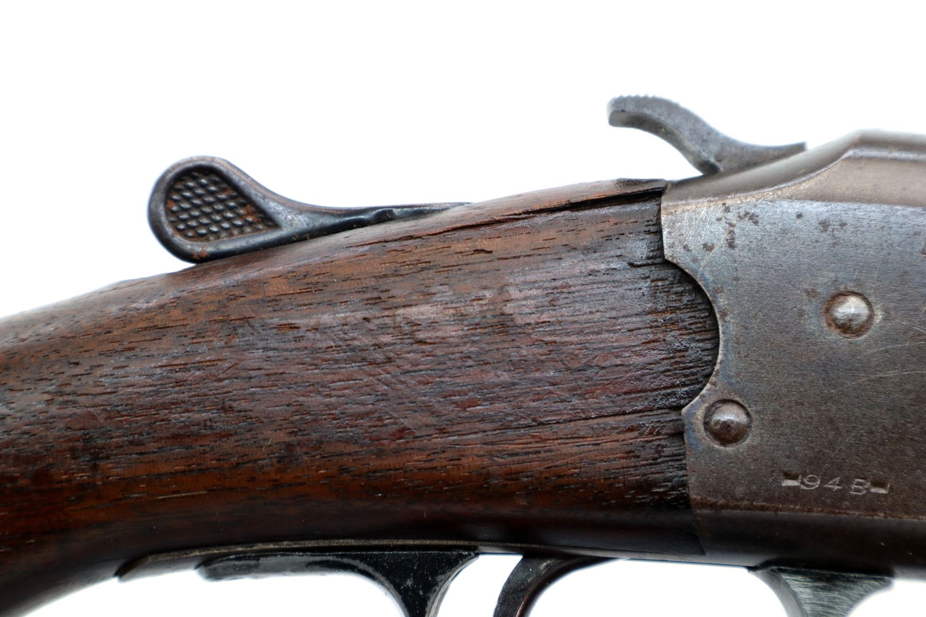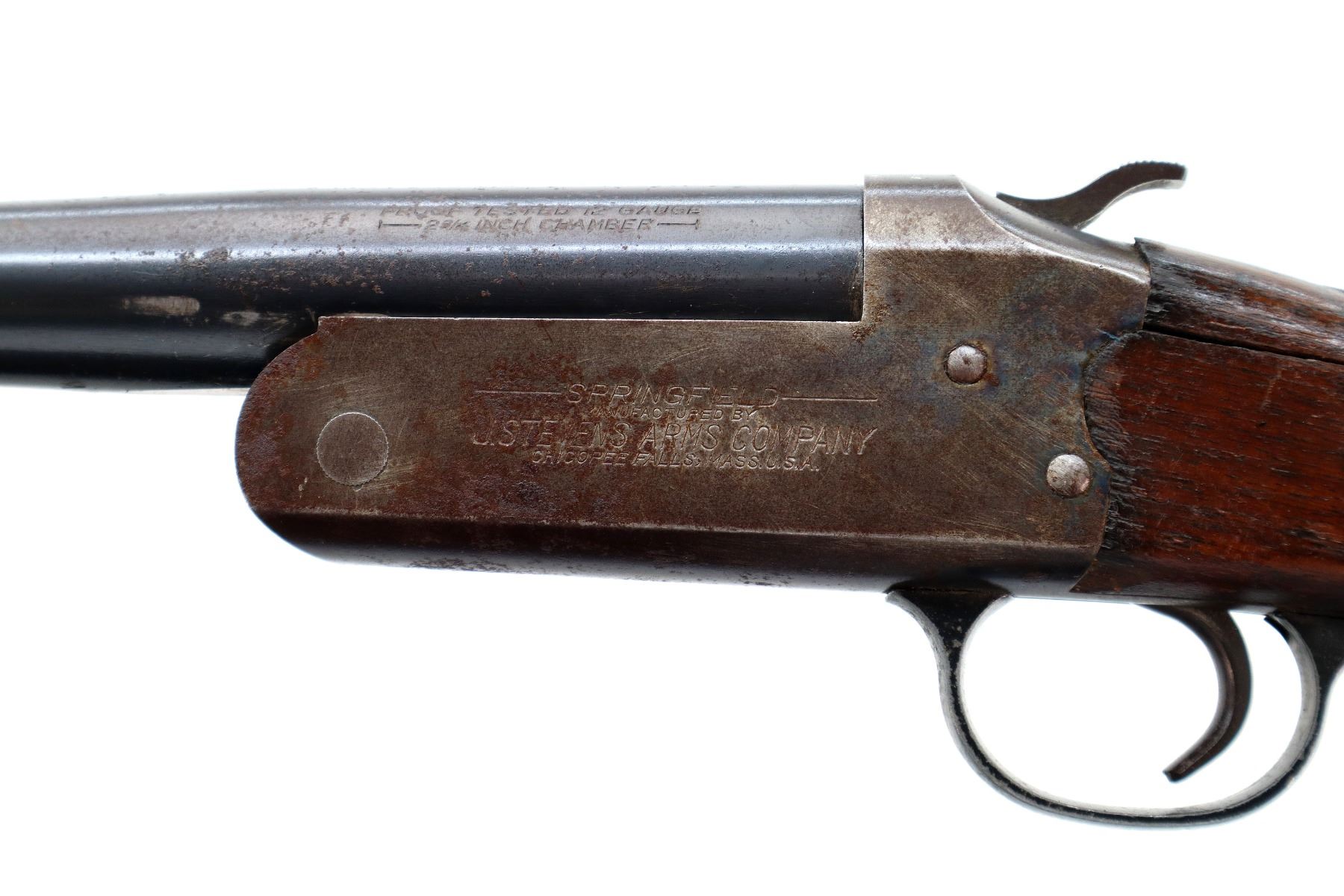 Main Description: Silver bead, blued finish, round barrel, grooved spur hammer, extractor, missing forearm assembly. One piece wood stock, pistol grip, chipped, cracked and broken behind receiver, red vented rubber recoil pad.