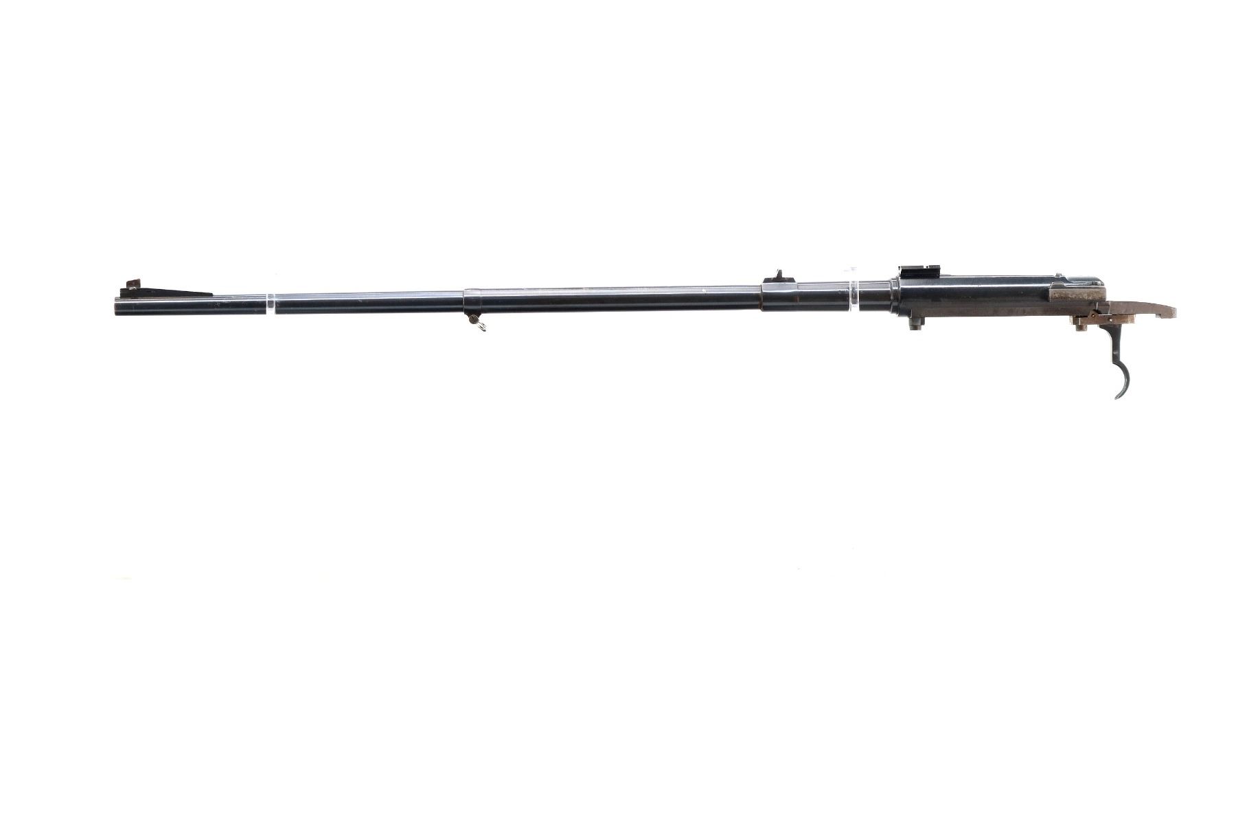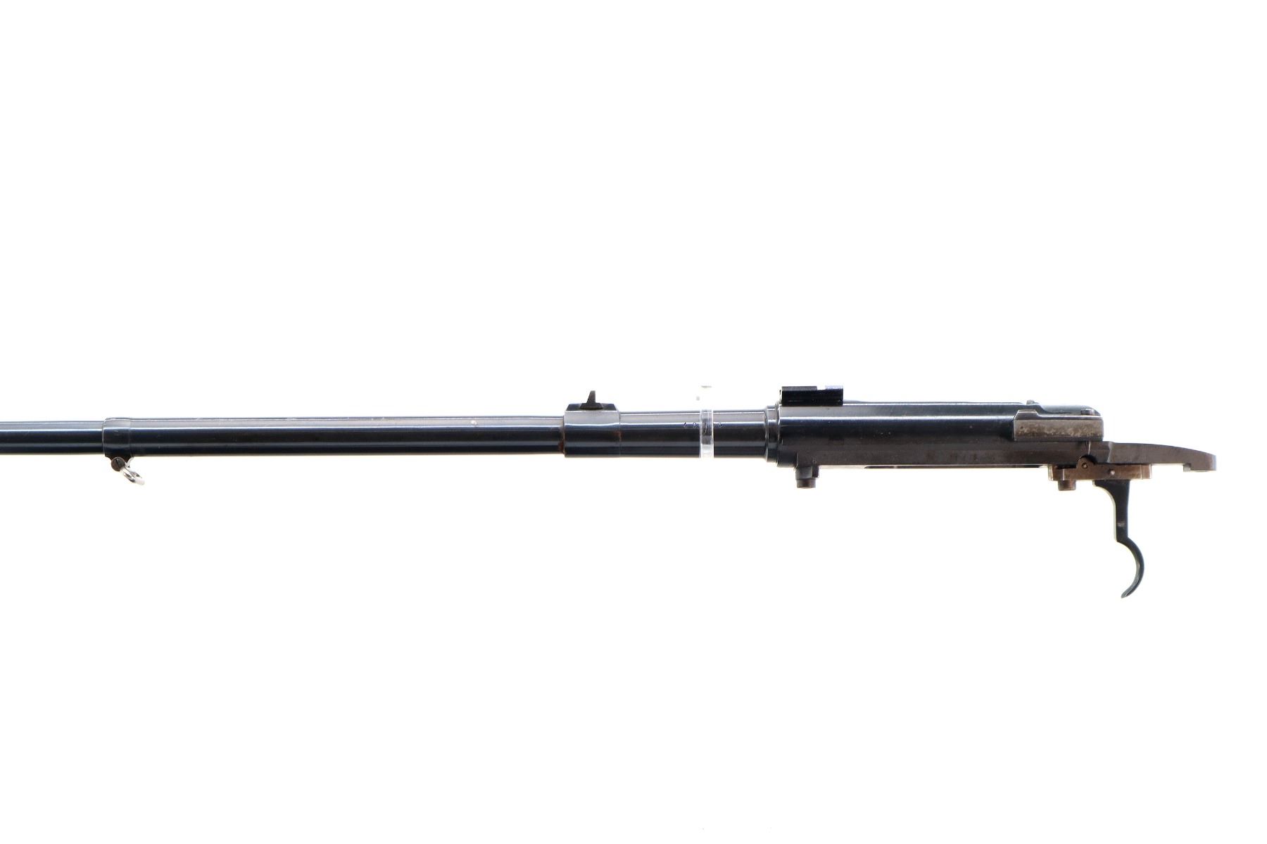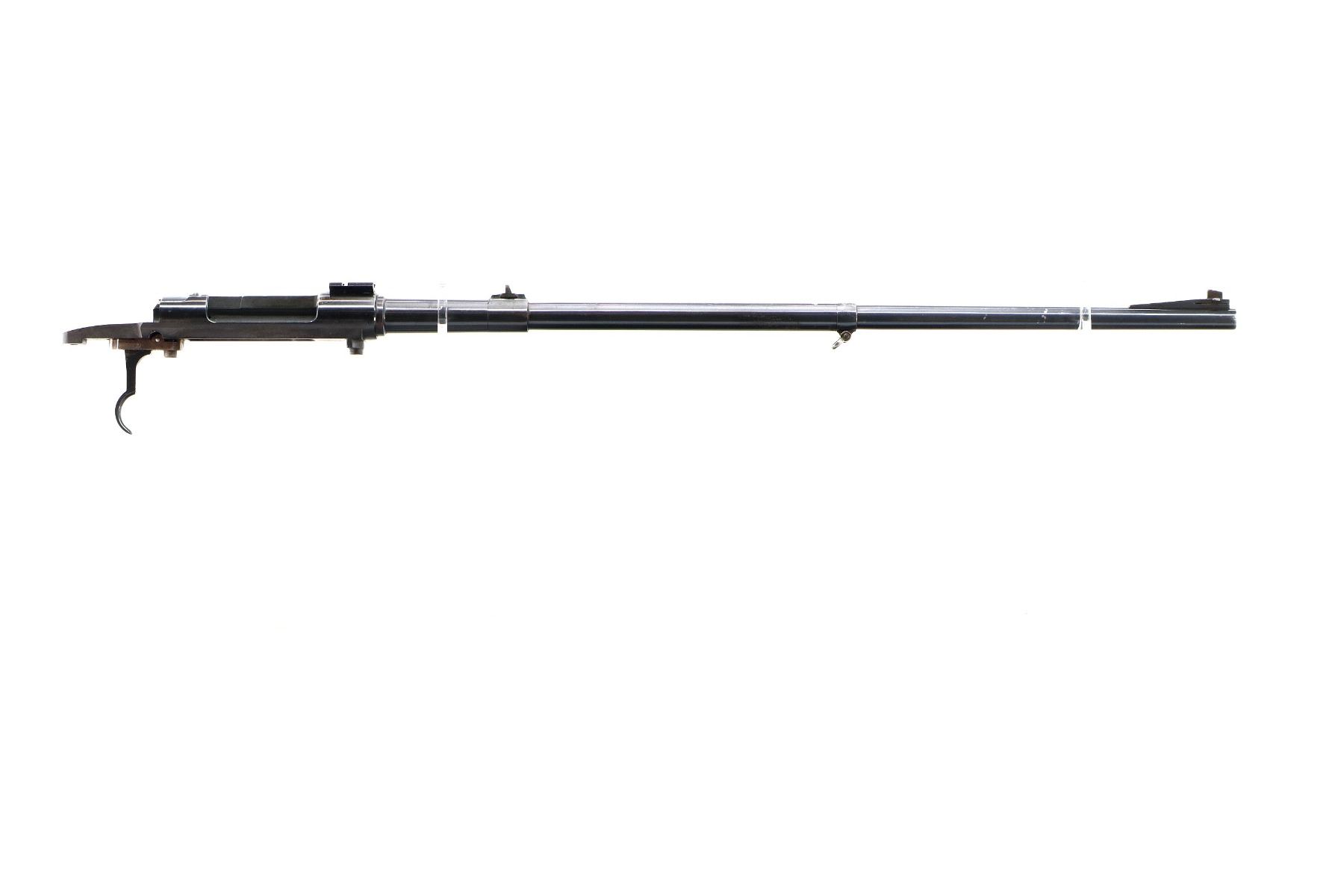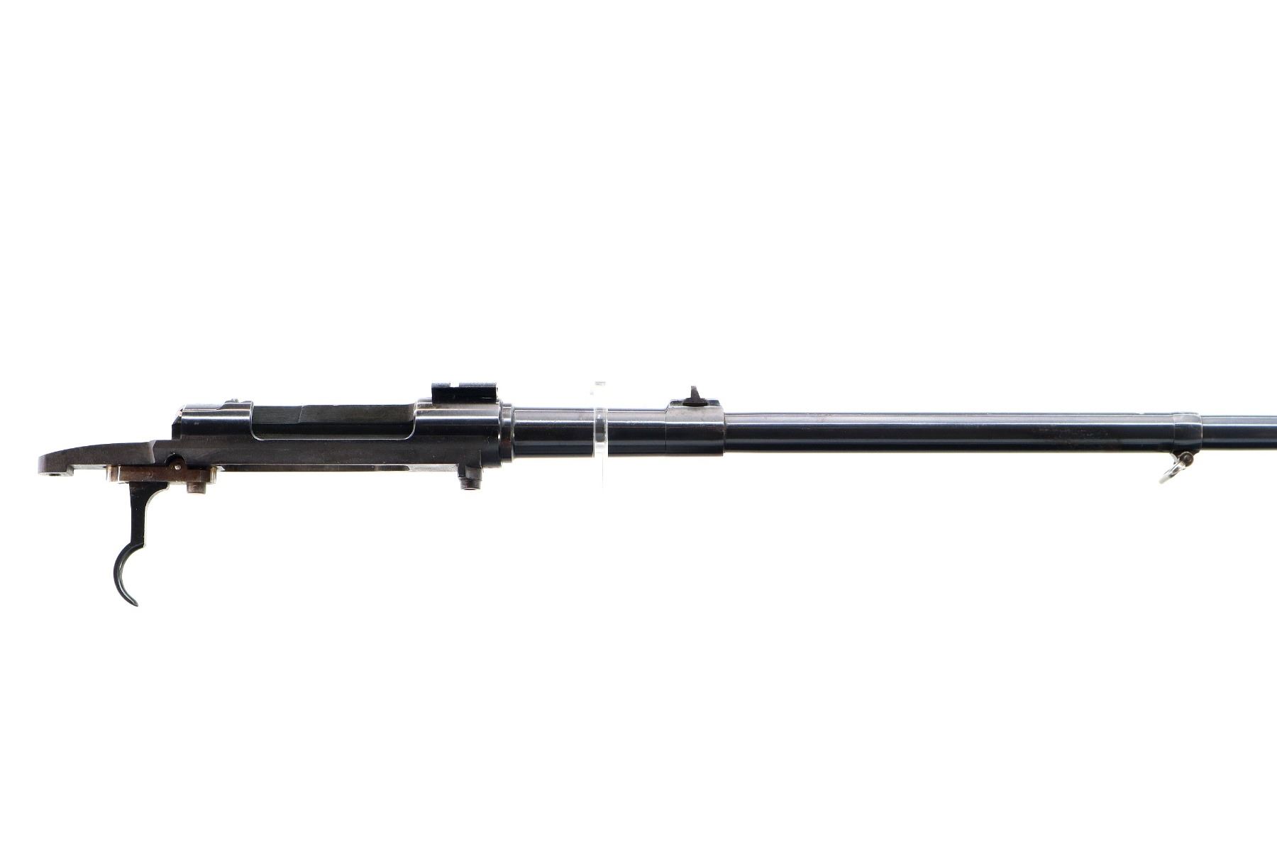 Main Description: Blade front sight with ramp, u notched rear sight with ramp, blued finish, receiver drilled and tapped with One piece base on the front ring, rear bridge has been modified, includes bolt stop and trigger mech assembly, front sling swivel, no other parts or stock included.