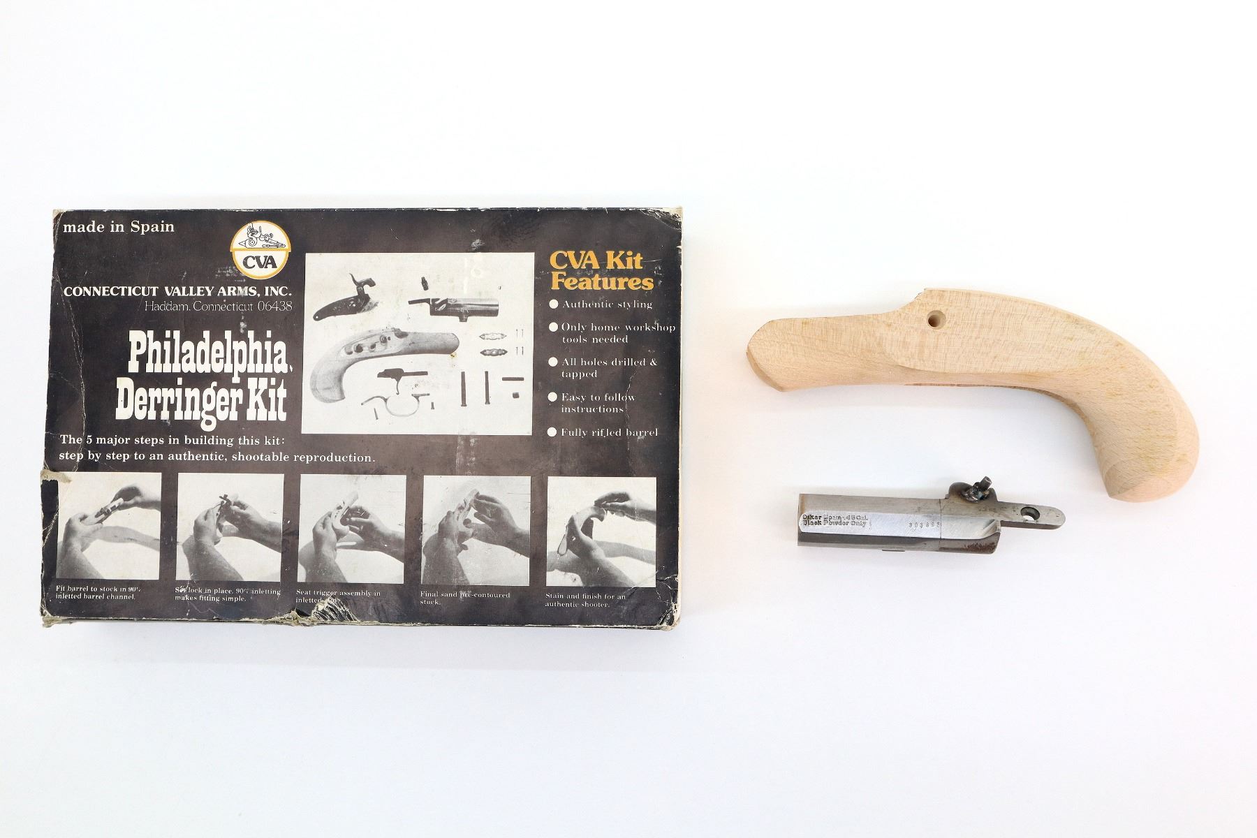 Main Description: This deactivation has four visible welds, action does not function, note: this is a kit gun requires final fitting and assembly. No sights, stainless barrel, smooth lock with grooved spur hammer. One piece wood grip, brass trigger guard and fittings, includes screws and pins may not be complete.