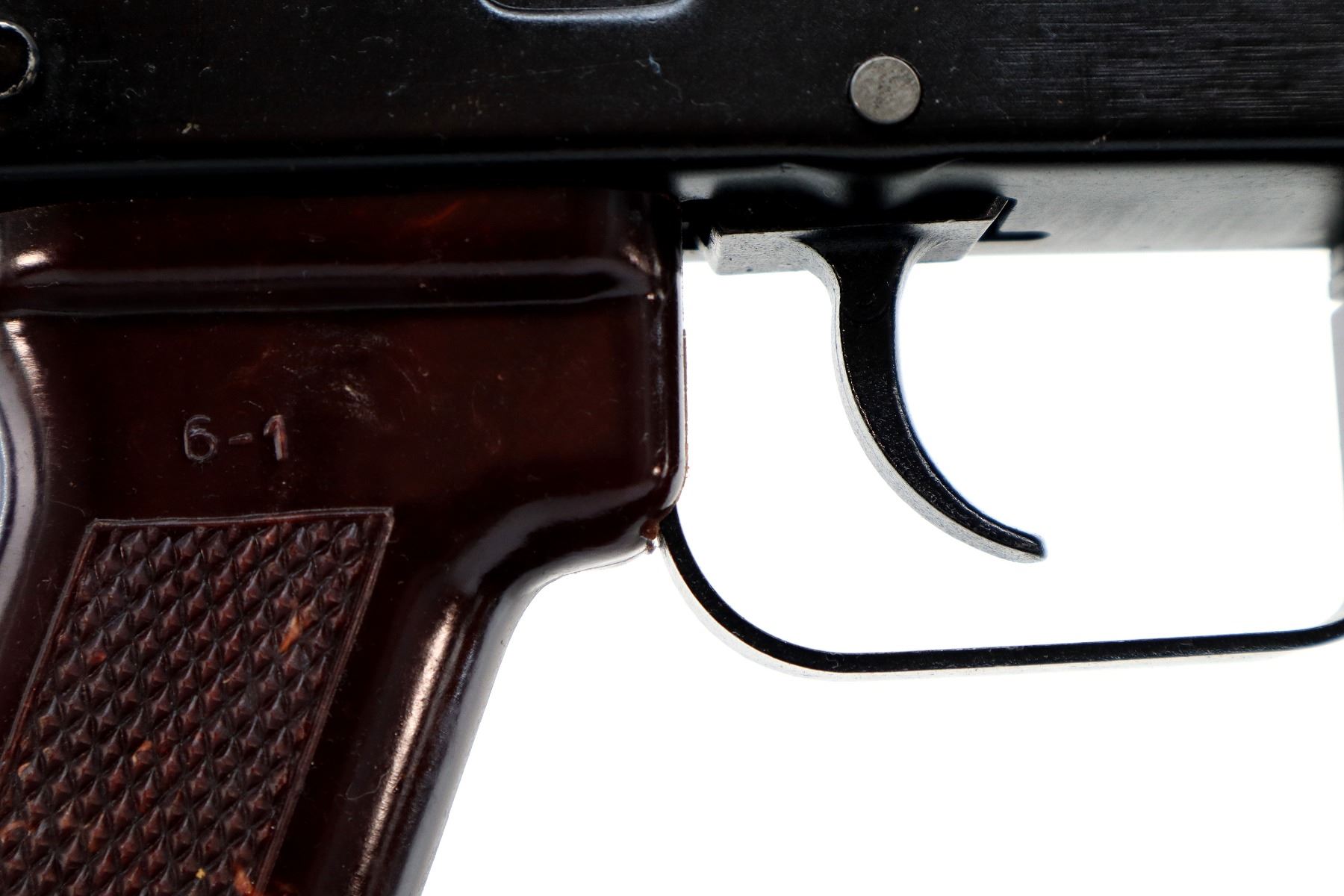 Main Description: This deactivation has no visible welds, bolt does not move, top cover can be opened, magazine is removable, cannot be disassembled. Manufactured by Tula 1990, visible serial numbers match. Post front sight with ears and ramp, adjustable L-flip u notched rear sight, black painted metal finish, ribbed top cover, smooth cocking handle, folding stamped steel stock with grooved butt. Three piece full military wood stocks, laminated handguards, checkered brown polymer pistol grip, sling swivels, extended mag release, attached muzzle brake.