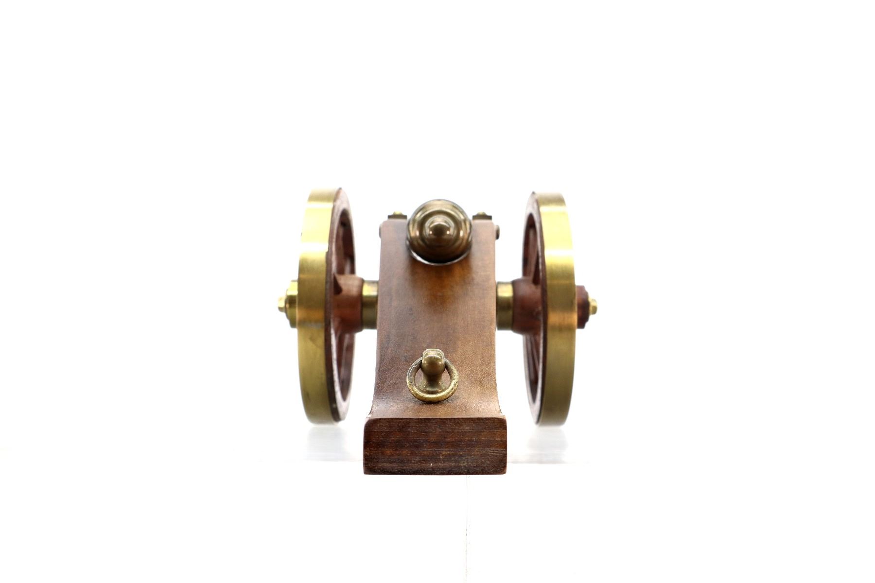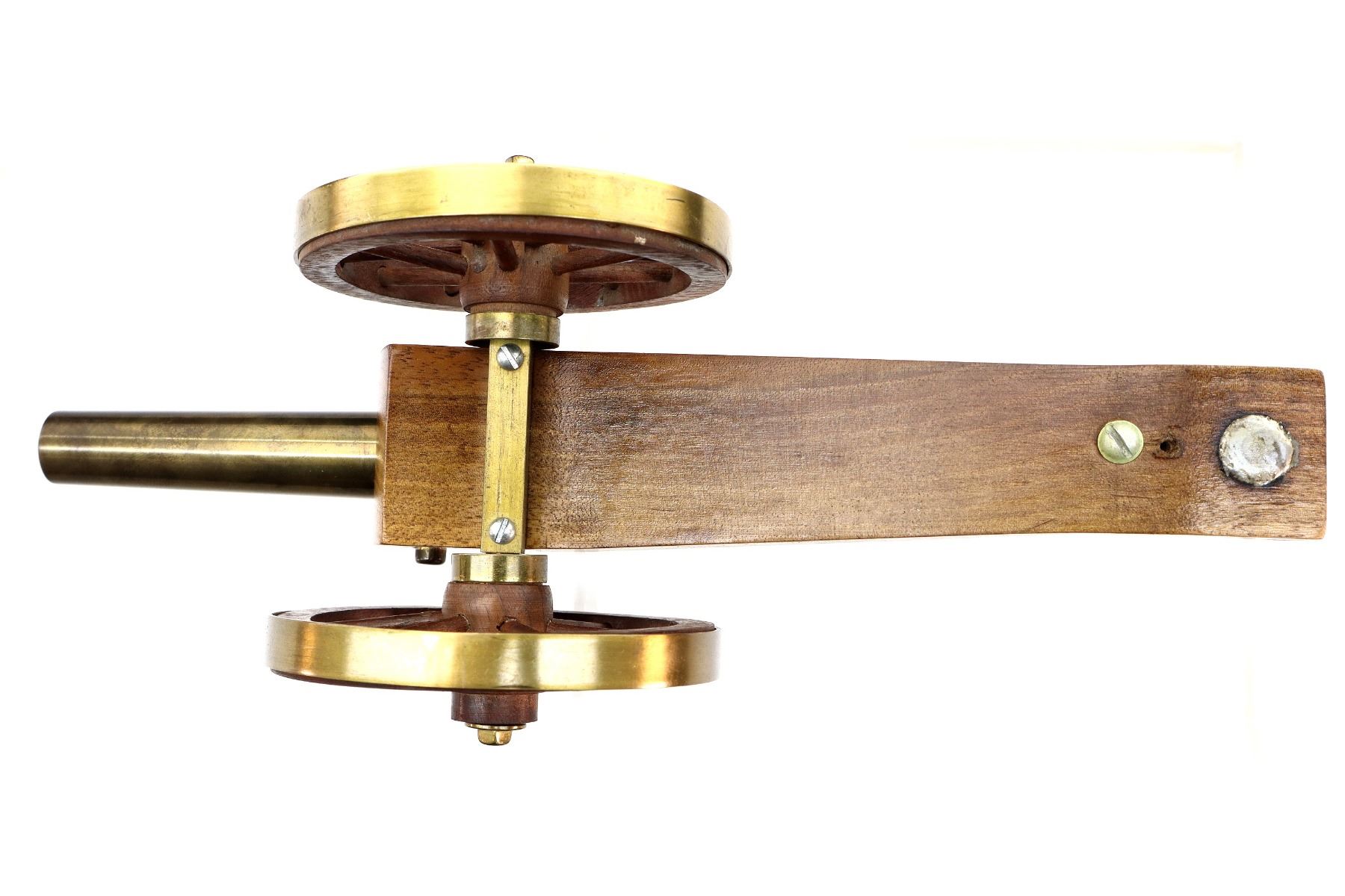 Main Description: No sights, brass construction with flashole, has a wood carriage with spoked wood wheels and brass rimmed wheels which are loose. OAL Length Approx. 12", OAL Height Approx. 4", OAL width Approx. 5.5".