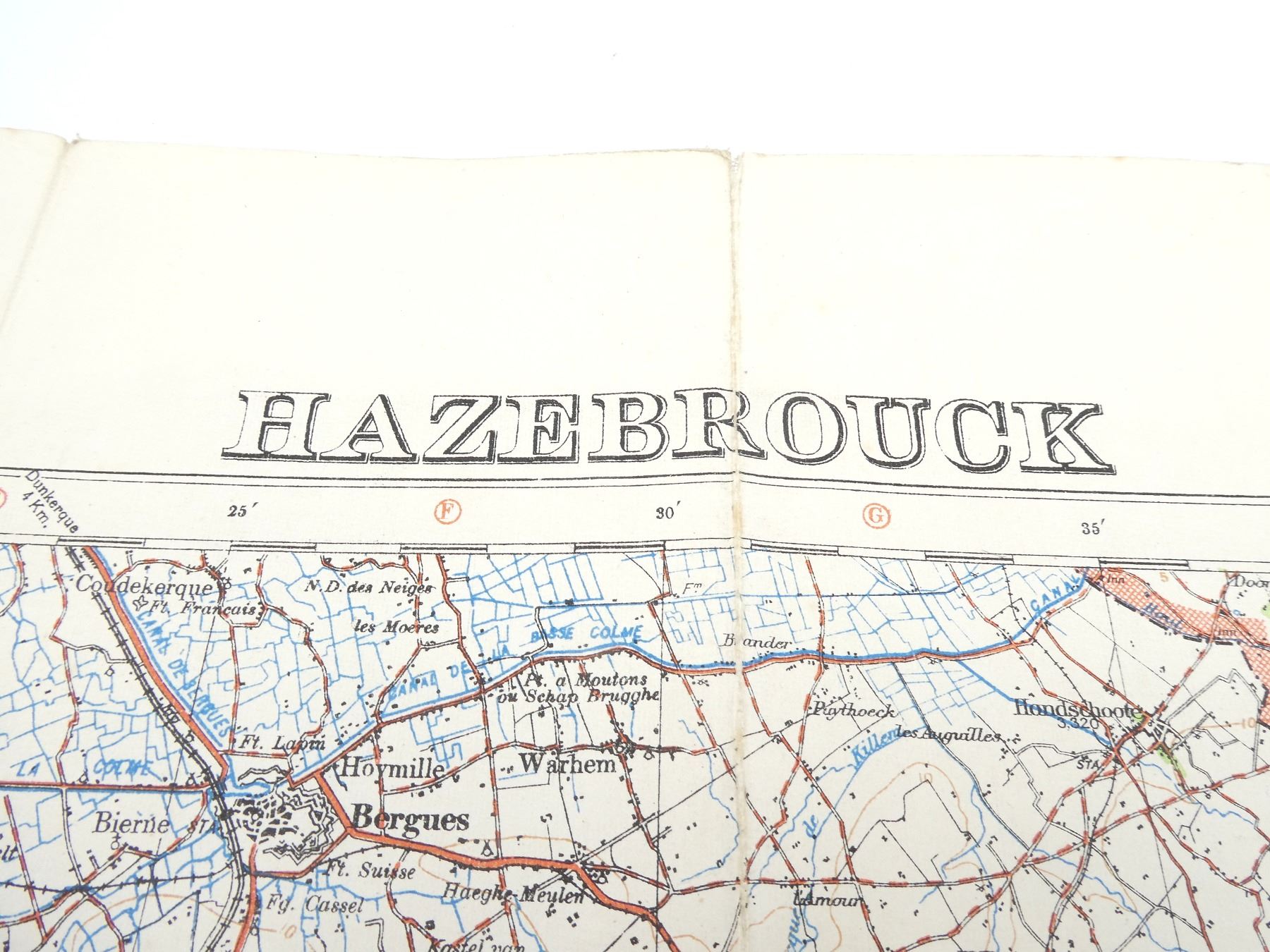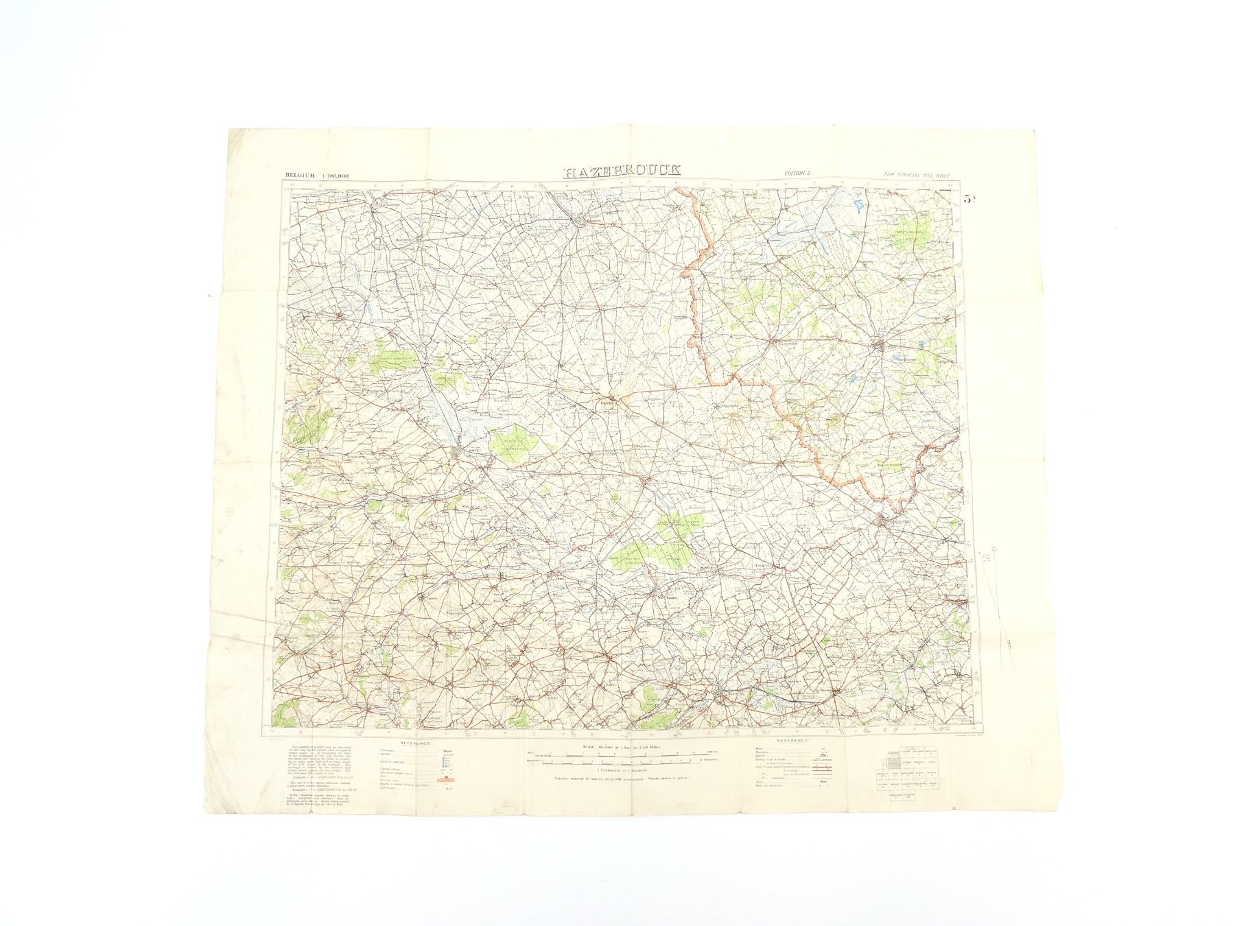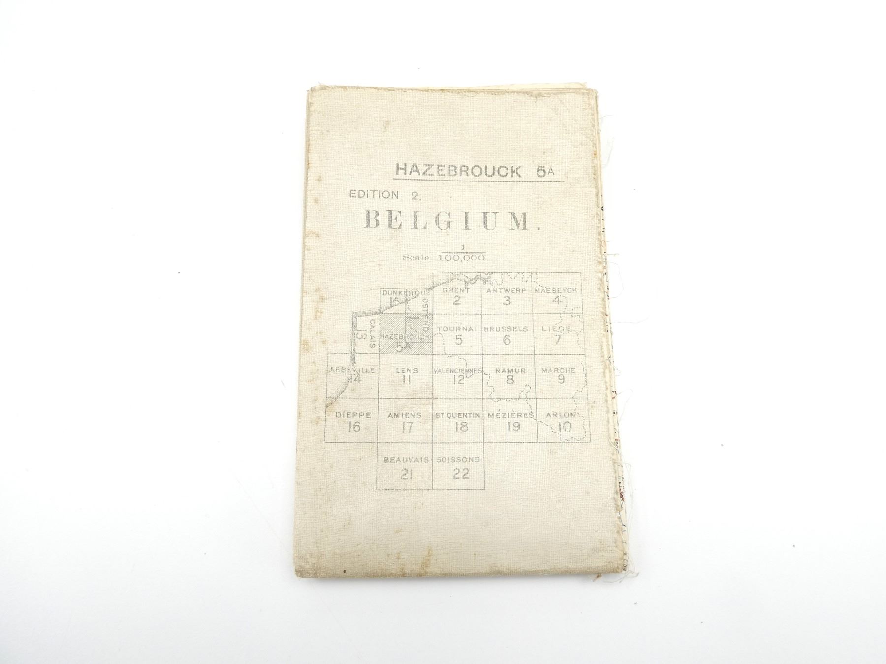 (1) 1916 MAP OF HAZEBROUCK, BELGIUM, MARKED: "BELGIUM 1:100, 000, HAZEBROUCK, EDITION 2" & "G.S. G.S. 2364, ORDNANCE SURVEY 1916" & VARIOUS OTHER MARKINGS, COLOURED MAP, SCALE 1:100, 000 OR 1" TO 1.58 MILES, APPROX. 33.75" X 27.75". SEE PHOTOS.