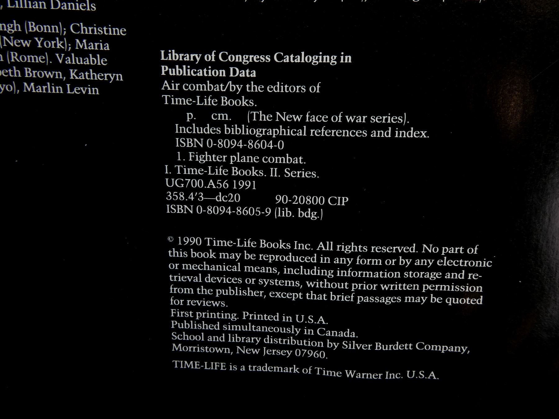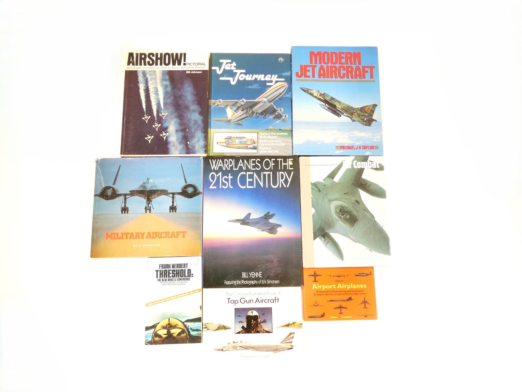LOT INCLUDES; (1) "AIR COMBAT" BOOK BY TIME-LIFE BOOKS, HARD COVER, ISBN: 0-8094-8604-0, (1) "MILITARY AIRCRAFT" BOOK BY BILL GUNSTON, HARD COVER WITH DUST COVER, ISBN: 0-49-5303-6, (1) "MODERN JET AIRCRAFT" BOOK BY MICHAEL J. H. TAYLOR, HARD COVER WITH DUST COVER, ISBN: 0-86124-170-3, (1) "WARPLANES OF THE 21ST CENTURY" BOOK BY BILL YENNE, HARD COVER WITH DUST COVER, ISBN: 0-86124-665-9, (1) "AIRSHOW! PICTORIAL, BLUE ANGELS, THUNDERBIRDS, RENO AIR RACES, ABBOTSFORD AIRSHOW" BOOK BY BILL JOHNSTON, HARD COVER WITH DUST COVER, COPYRIGHT 1971, (1) "JET JOURNEY" BOOK BY MIKE WILSON, HARD COVER, ISBN: 0-85685-336-4, (1) "THE CONCISE ILLUSTRATED BOOK OF TOP GUN AIRCRAFT" BOOK BY CHRISTOPHER CHANT, HARD COVER WITH DUST COVER, ISBN: 0-8317-1677-0, (1) "GUIDE TO AIRPORT AIRPLANES" BOOK BY WILLIAM & FRANK BERK, SOFT COVER, ISBN: 1-882663-00-4 & (1) "THRESHOLD: THE BLUE ANGELS EXPERIENCE" BOOK BY FRANK HERBERT, SOFT COVER, SBN: 345-23424-3-200. SEE PHOTOS.