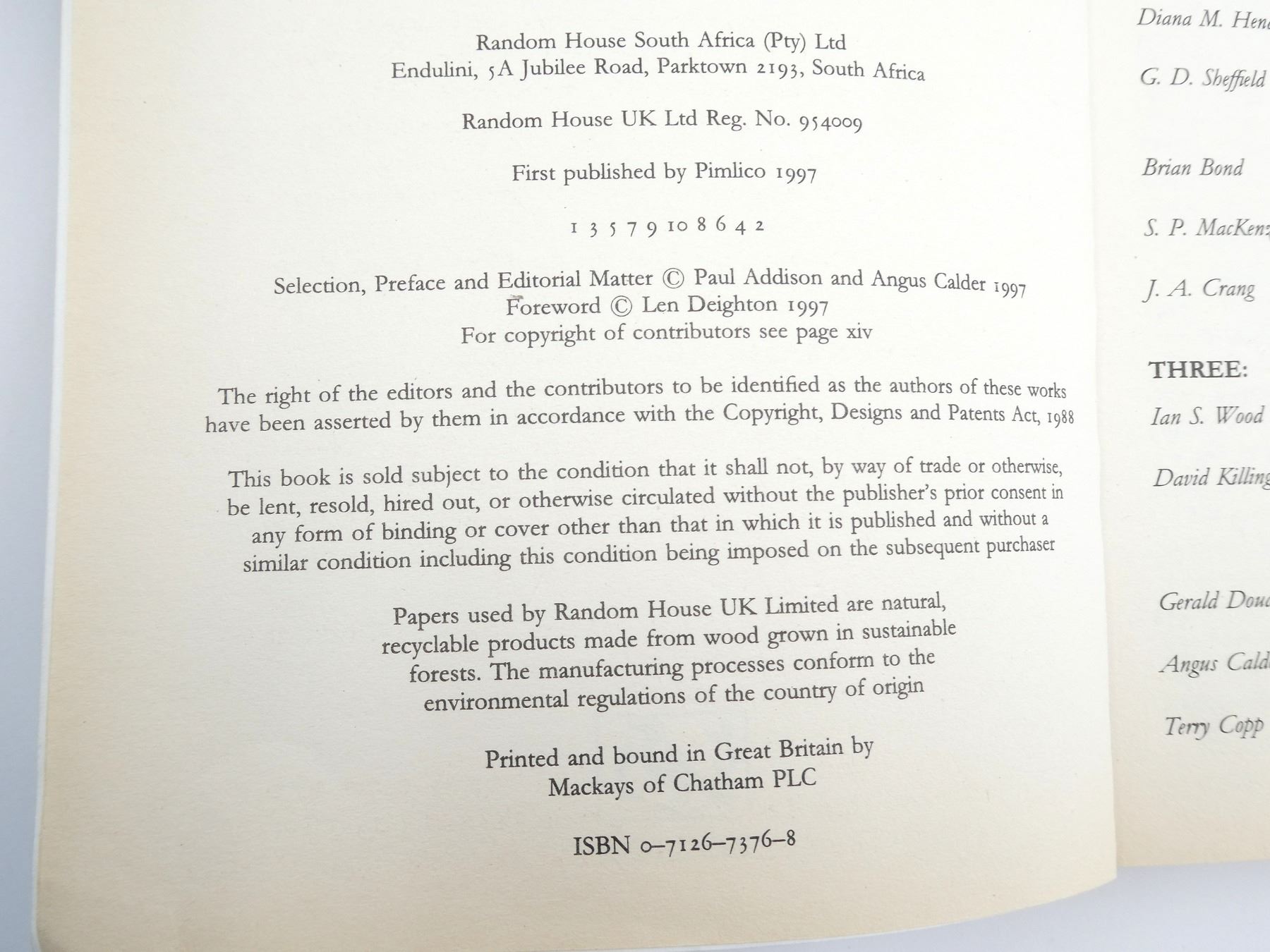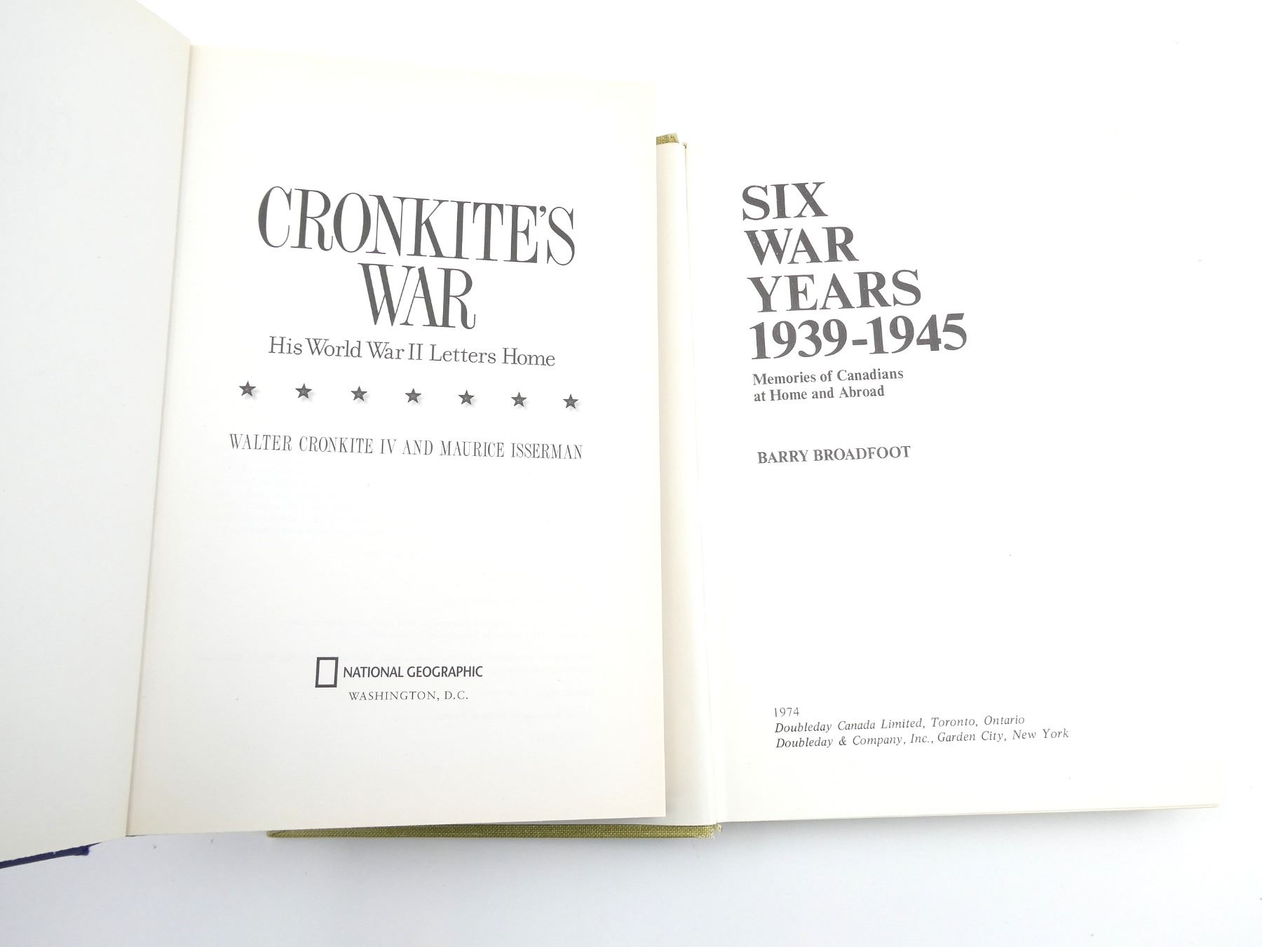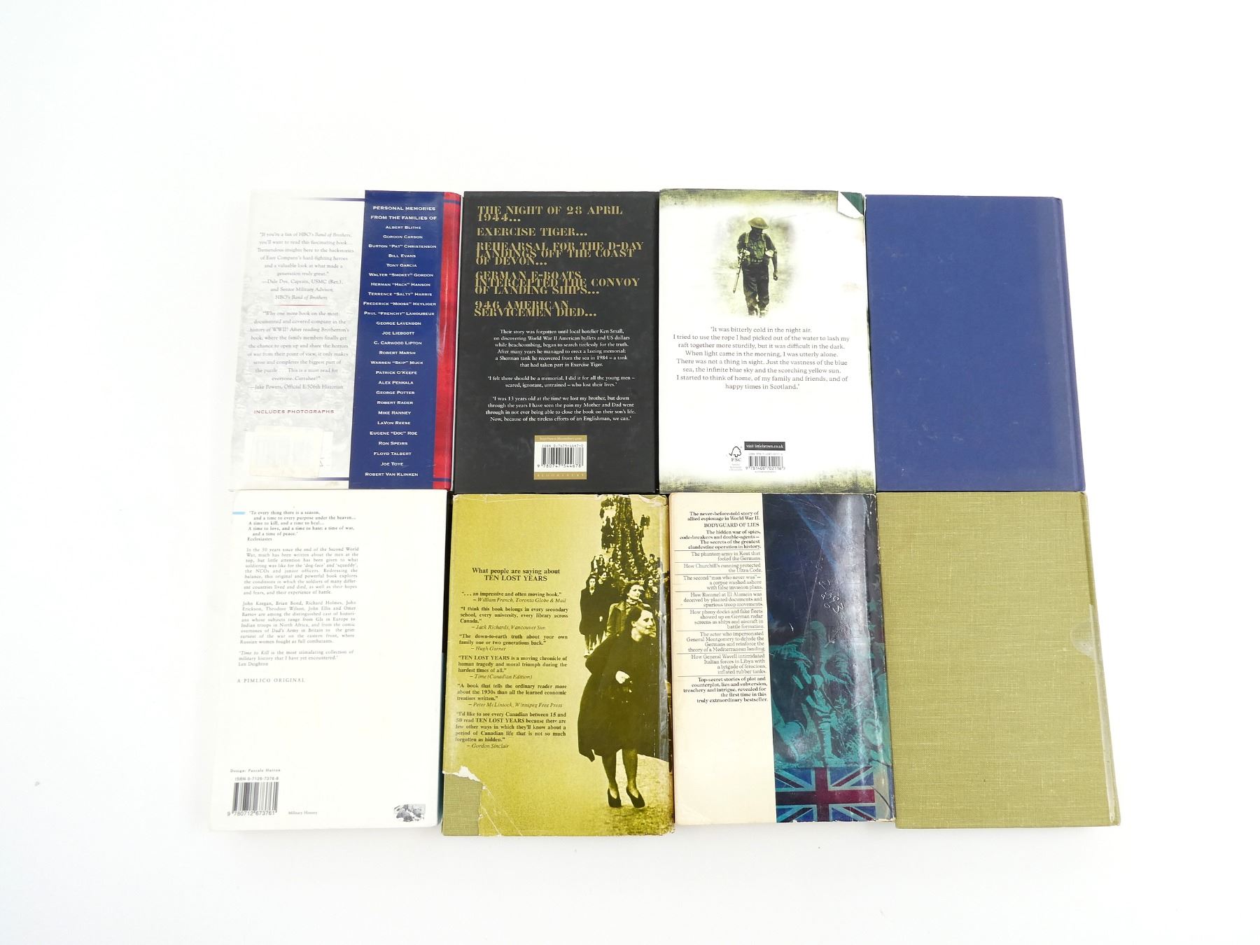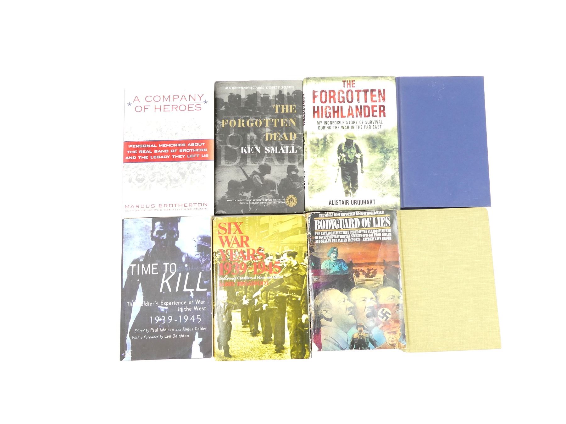 LOT INCLUDES; (1) "THE FORGOTTEN DEAD" BOOK BY KEN SMALL, HARD COVER WITH DUST COVER, ISBN: 0-7475-4467-0, (1) "THE FORGOTTEN HIGHLANDER, MY INCREDIBLE STORY OF SURVIVAL DURING THE WAR IN THE FAR EAST" BOOK BY ALISTAIR URQUHART, HARD COVER WITH DUST COVER, ISBN: 978-1-4087-0211-6, (1) "SIX WAR YEARS 1939-1945 MEMORIES OF CANADIANS AT HOME AND ABROAD" BOOK BY BARRY BROADFOOT, HARD COVER WITH DUST COVER, ISBN: 0-385-05814-4, (1) "BODYGUARD OF LIES" BOOK BY ANTHONY CAVE BROWN, SOFT COVER, ISBN: 0-553-01311-4, (1) "SIX WAR YEARS 1939-1945, MEMORIES OF CANADIANS AT HOME AND ABROAD" BOOK BY BARRY BROADFOOT, HARD COVER, ISBN: 0-385-05814-4, (1) "A COMPANY OF HEROES" BOOK BY MARCUS BROTHERTON, HARD COVER WITH DUST COVER, ISBN: 978-0-425-23420-4, (1) "TIME TO KILL THE SOLDIER'S EXPERIENCE OF WAR IN THE WEST 1939-1945" BOOK EDITED BY PAUL ADDISON & ANGUS CALDER, SOFT COVER, ISBN: 0-7126-7376-8 & (1) "CRONKITE'S WAR" BOOK BY WALTER CRONKITE IV & MAURICE ISSERMAN, HARD COVER, ISBN: 978-1-4262-1019-8. SEE PHOTOS.