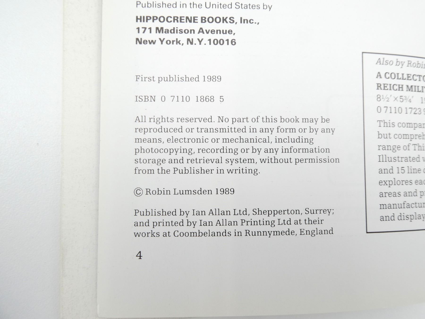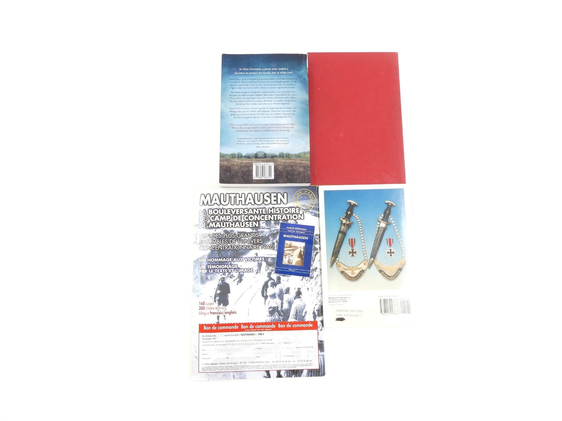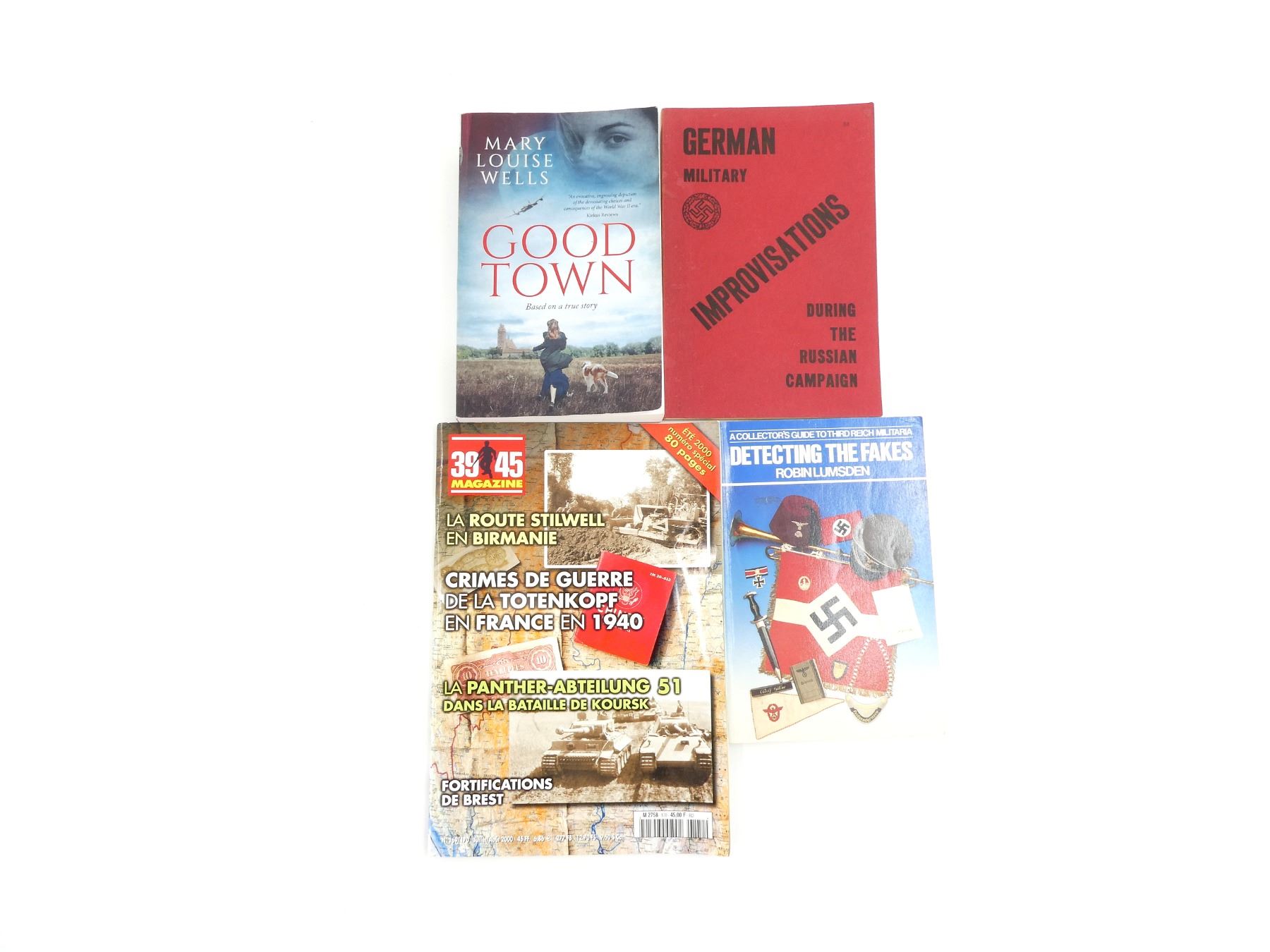 LOT INCLUDES; (1) "GERMAN MILITARY IMPROVISATIONS DURING THE RUSSIAN CAMPAIGN" BOOK, SOFT COVER, ISBN: 0-87947-051-8, (1) "A COLLECTOR'S GUIDE TO THIRD REICH MILITARIA, DETECTING THE FAKES" BOOK BY ROBIN LUMSDEN, SOFT COVER, ISBN: 0-7110-1868-5, (1) "GOOD TOWN" BOOK BY MARY LOUISE WELLS, SOFT COVER, ISBN: 979-8-9879873-1-5 & (1) "39 45 MAGAZINE" ABOUT THE GERMAN FIGHT, SOFT COVER, IN FRENCH. SEE PHOTOS.