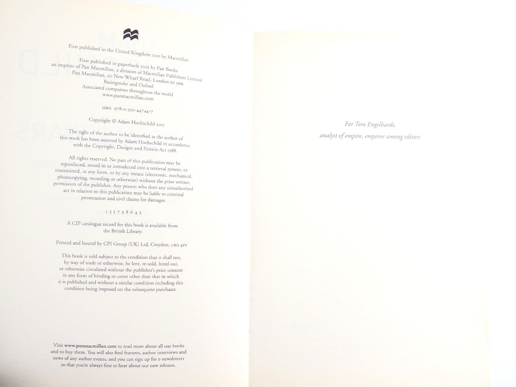 (1) BY ADAM HOCHSCHILD, SOFT COVER, ISBN: 978-0-330-44744-7. SEE PHOTOS.