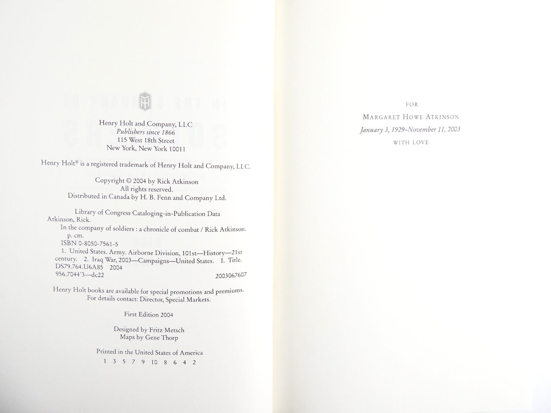 (1) BY RICK ATKINSON, HARD COVER WITH DUST COVER, ISBN: 0-8050-7561-5. SEE PHOTOS.