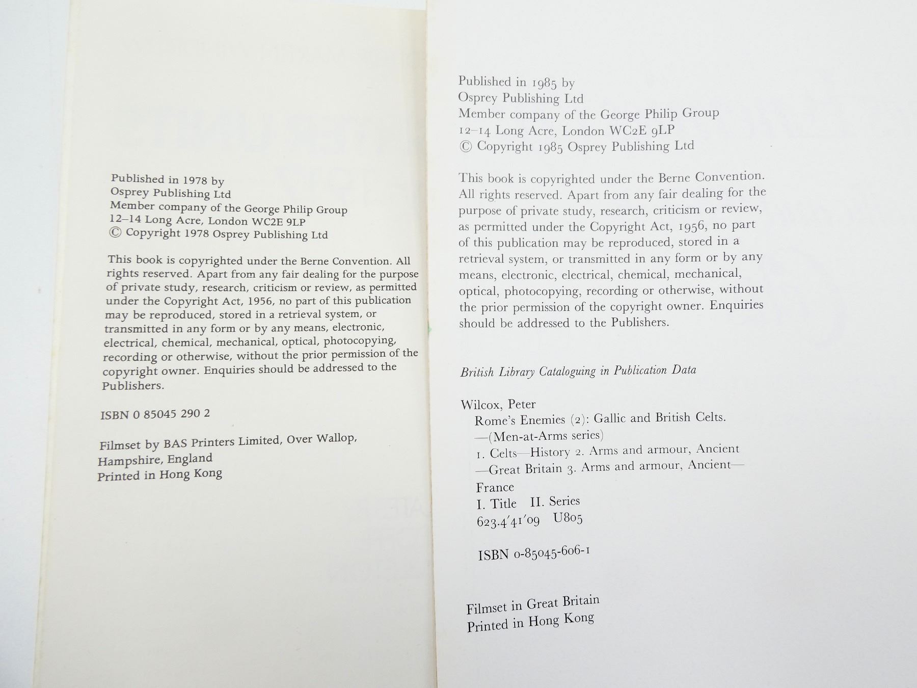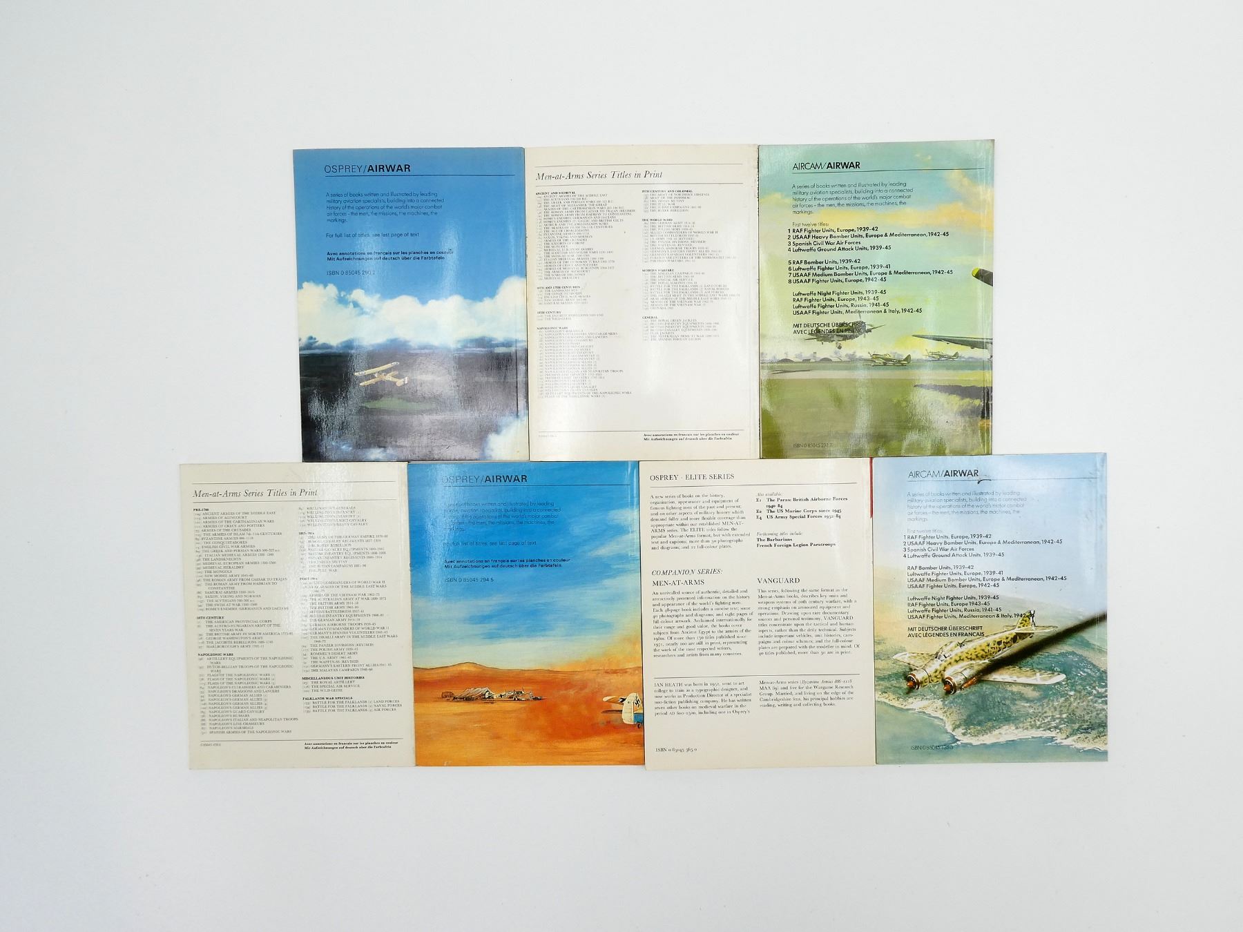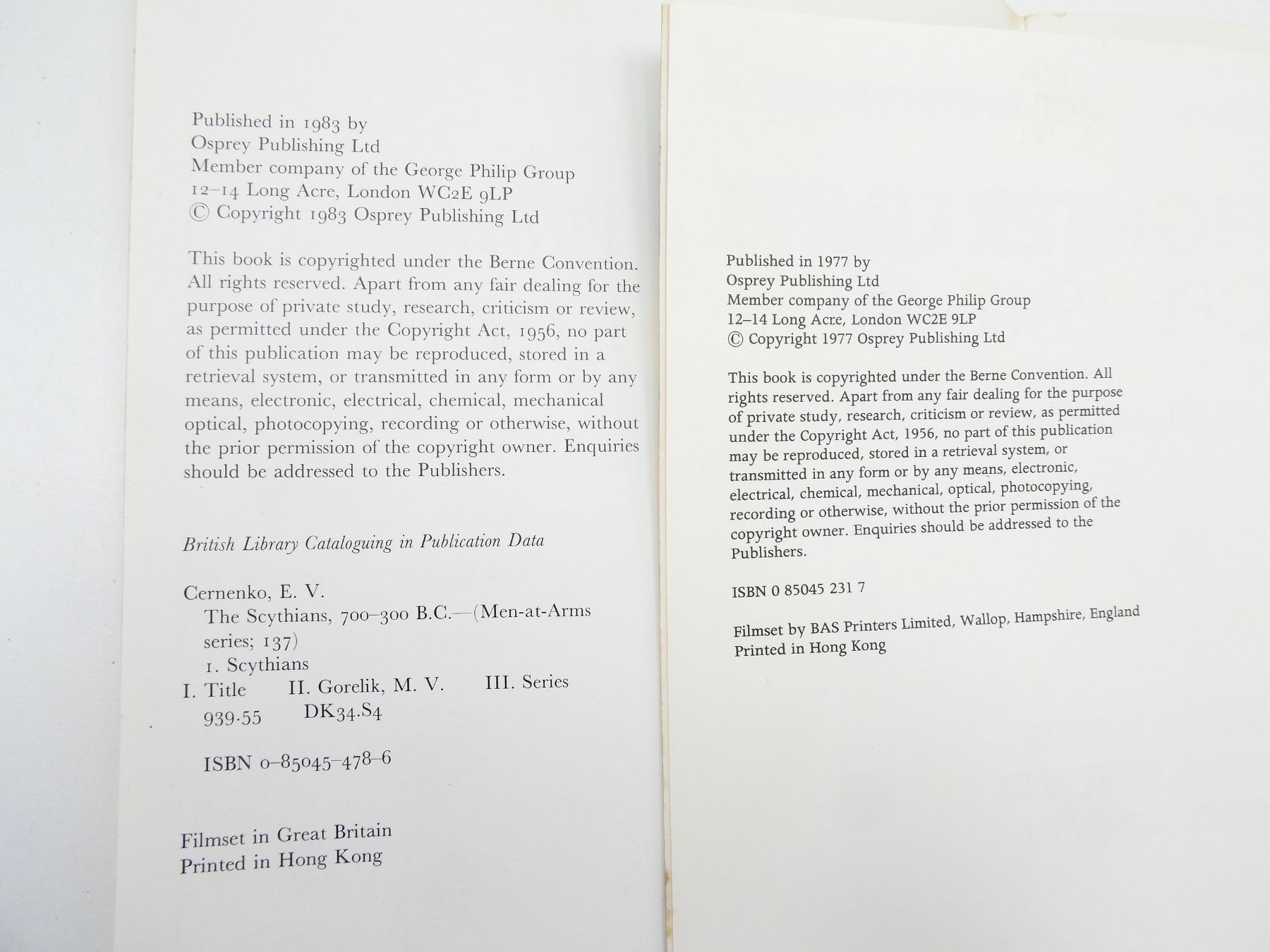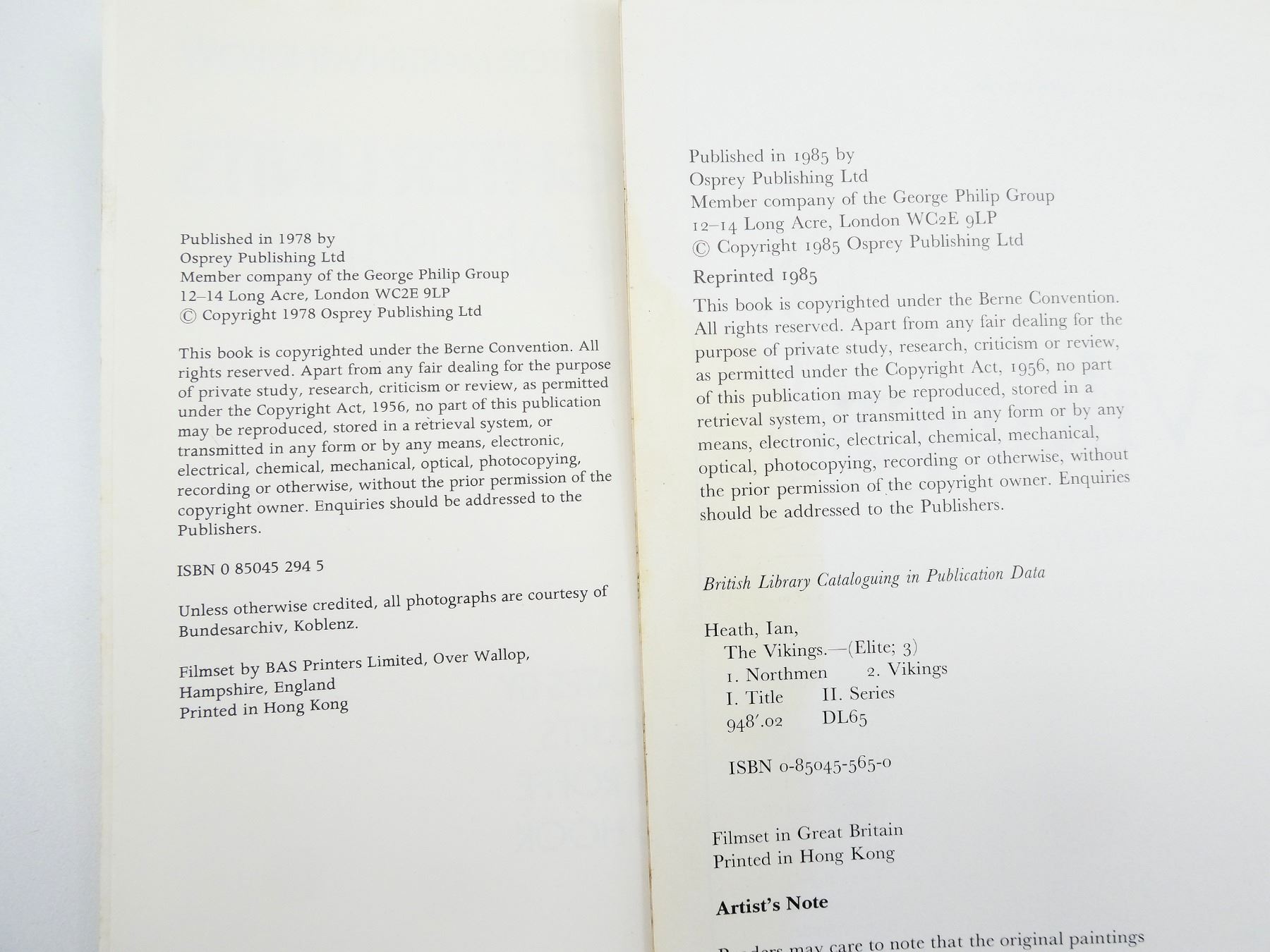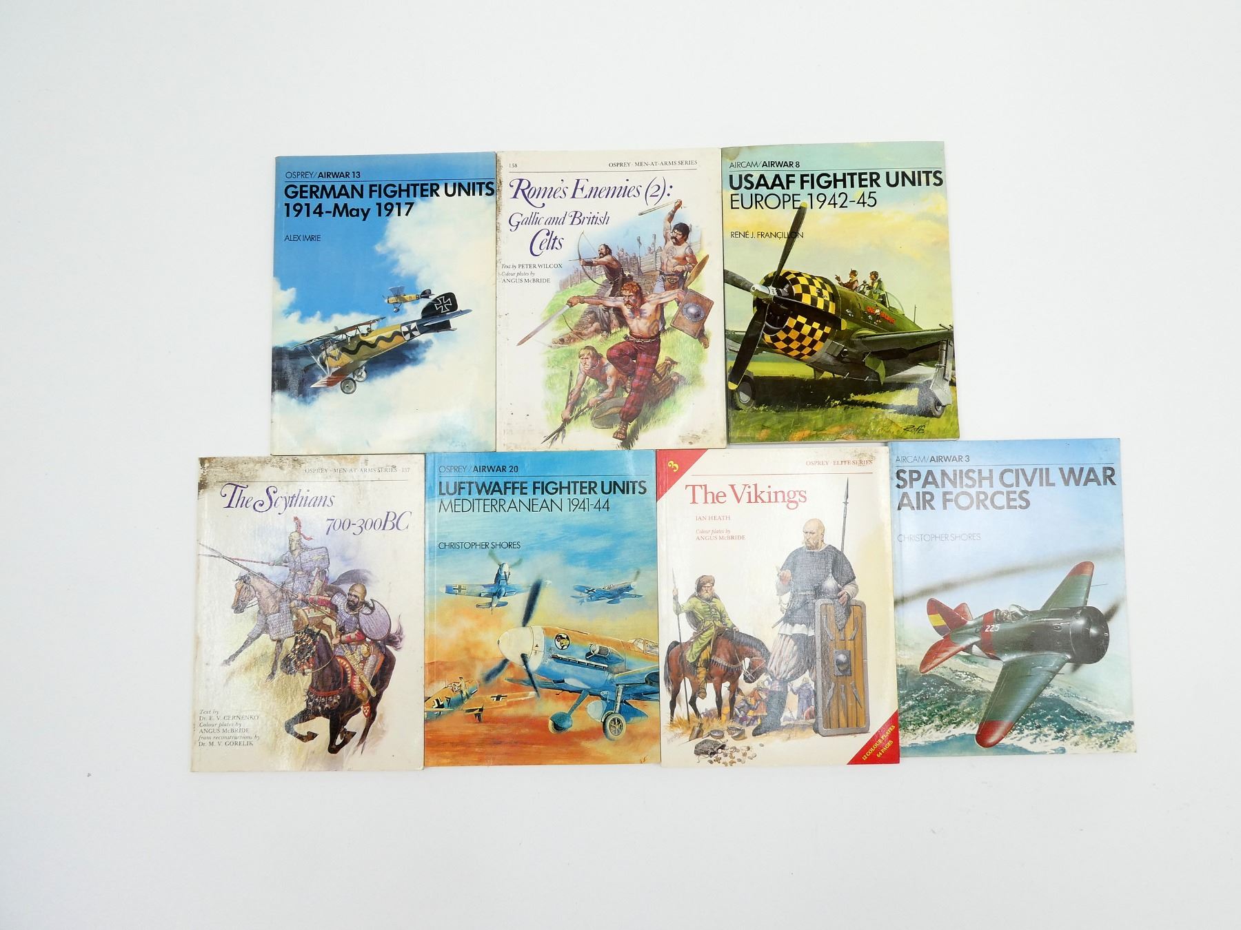 SOFT COVERS, LOT INCLUDES; (1) "OSPREY ELITE SERIES 3, THE VIKINGS" BOOK BY IAN HEATH & ANGUS MCBRIDE, ISBN: 0-85045-565-0, (1) "OSPREY MEN-AT-ARMS SERIES 137, THE SCYTHIANS 700-300BC" BOOK BY E. V. CERNENKO & ANGUS MCBRIDE, ISBN: 0-85045-478-6, (1) "OSPREY MEN-AT-ARMS SERIES 158, ROME'S ENEMIES (2): GALLIC AND BRITISH CELTS" BOOK BY PETER WILCOX & ANGUS MCBRIDE, ISBN: 0-85045-606-1, (1) "AIRCAM AIRWAR 3, SPANISH CIVIL WAR AIR FORCES" BOOK BY CHRISTOPHER SHORES, ISBN: 0-85045-135-3. (1) "AIRCAM AIRWAR 8, USAAF FIGHTER UNITS, EUROPE 1942-45" BOOK BY RENE J. FRANCILLON, ISBN: 0-85045-231-7, (1) "OSPREY AIRWAR 13, GERMAN FIGHTER UNITS 1914-MAY 1917" BOOK BY ALEX IMRIE, ISBN: 0-85045-290-2 & (1) "OSPREY AIRWAR 20, LUFTWAFFE FIGHTER UNITS, MEDITERRANEAN 1941-44" BOOK BY CHRISTOPHER SHORES, ISBN: 0-85045-294-5. SEE PHOTOS.