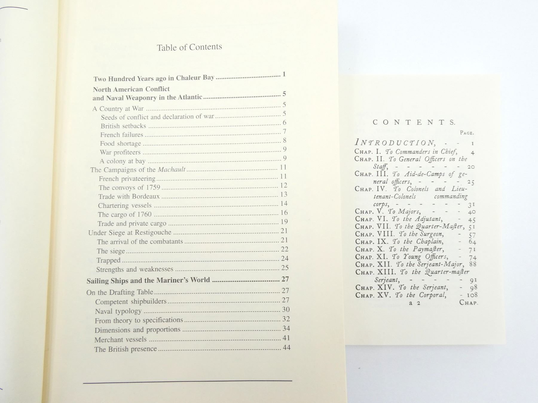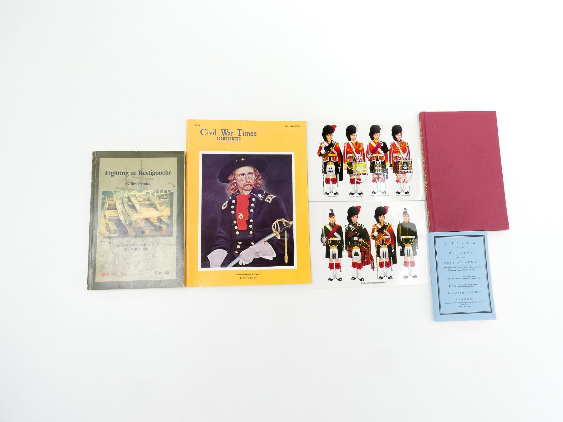 LOT INCLUDES; (1) "ADVICE TO THE OFFICERS OF THE BRITISH ARMY: WITH THE ADDITION OF FOME HINTS TO THE DRUMMER AND PRIVATE SOLDIER" BOOK PRINTED BY W. RICHARDSON, SOFT COVER, ISBN: 0-9633659-0-8, (1) "SCOTTISH SWORDS AND DIRKS" BOOK BY JOHN WALLACE, HARD COVER, COPYRIGHT 1970, (1) "FIGHTING AT RESTIGOUCHE, THE MEN AND VESSELS OF 1760 IN CHALEUR BAY" BOOK BY GILLES PROULX, SOFT COVER, ISBN: 0-660-17723-4, (1) "CIVIL WAR TIMES ILLUSTRATED" BY VARIOUS AUTHORS, SOFT COVER, COPYRIGHT 1974 & (2) "ART OF WAR" POSTCARDS. SEE PHOTOS.