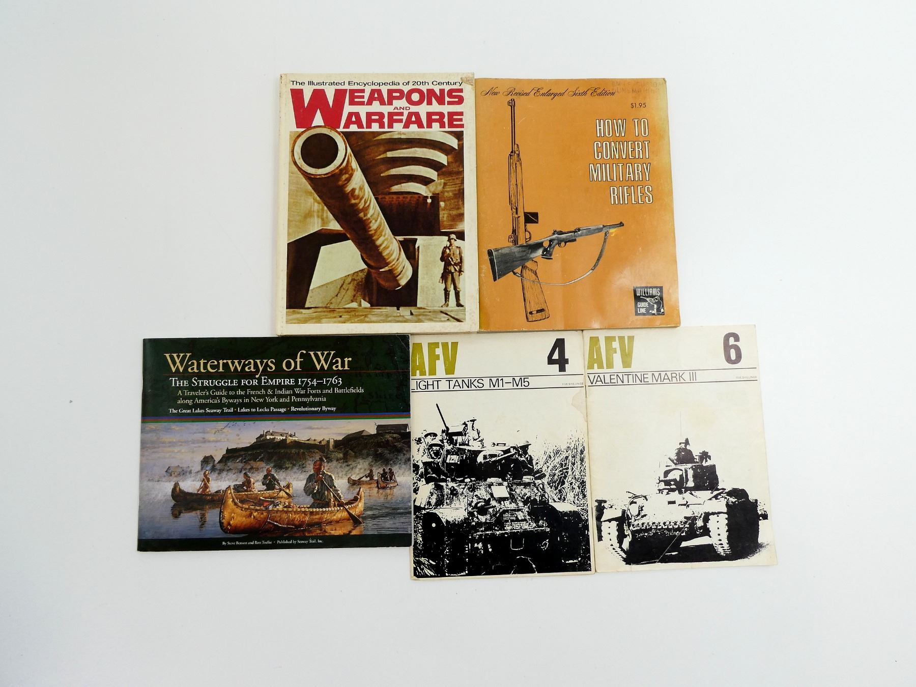 LOT INCLUDES; (1) "AFV 6, VALENTINE MARK III" BOOK BY B. T. WHITE, SOFT COVER, (1) "AFV 4, LIGHT TANKS M1-M5" BOOK BY CHRIS ELLIS & PETER CHAMBERLAIN, SOFT COVER, (1) "THE ILLUSTRATED ENCYCLOPEDIA OF 20TH CENTURY WEAPONS AND WARFARE, VOLUME 2" BOOK EDITED BY BERNARD FITZSIMONS, HARD COVER, COPYRIGHT 1969, (1) "HOW TO CONVERT MILITARY RIFLES" BOOK PUBLISHED BY FOLLETT PUBLISHING COMPANY, SOFT COVER, SBN: 695-80095-7 & (1) "WATERWAYS OF WAR, THE STRUGGLE FOR EMPIRE 1754-1763" BOOK BY STEVE BENSON & RON TOELKE, SOFT COVER, ISBN: 978-0943689-09-8. SEE PHOTOS.