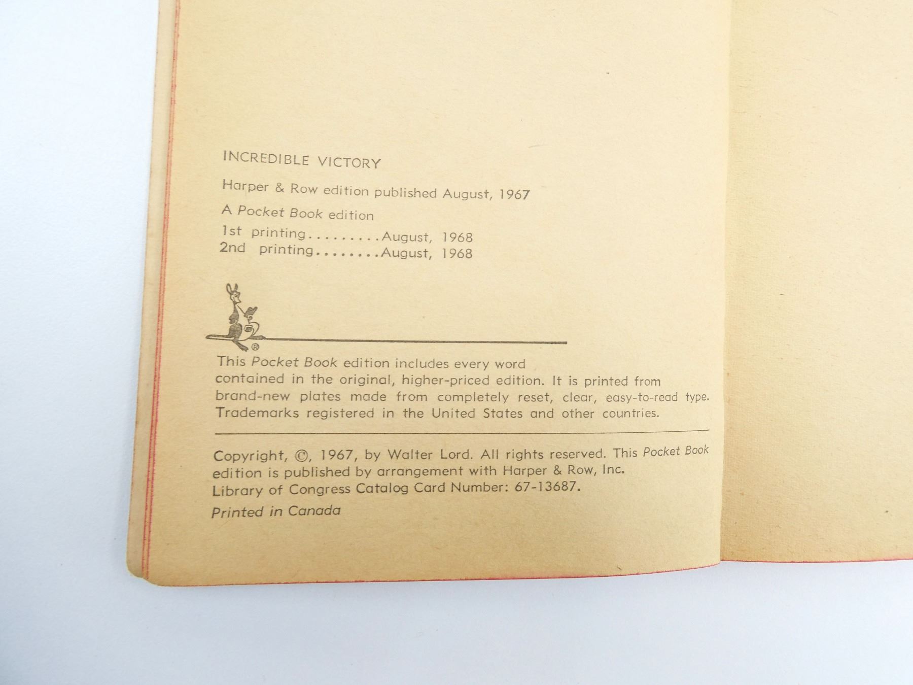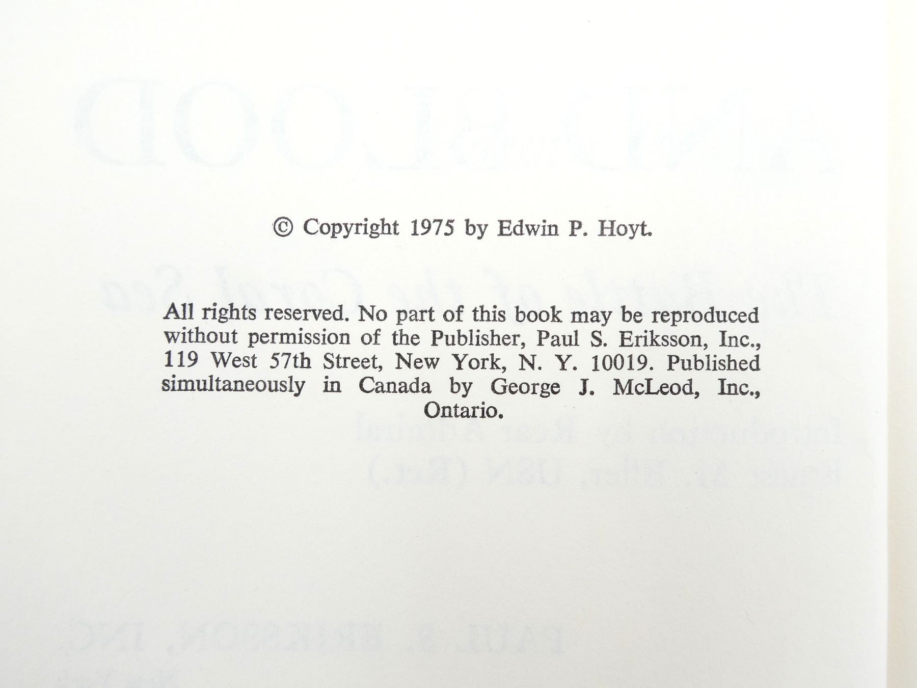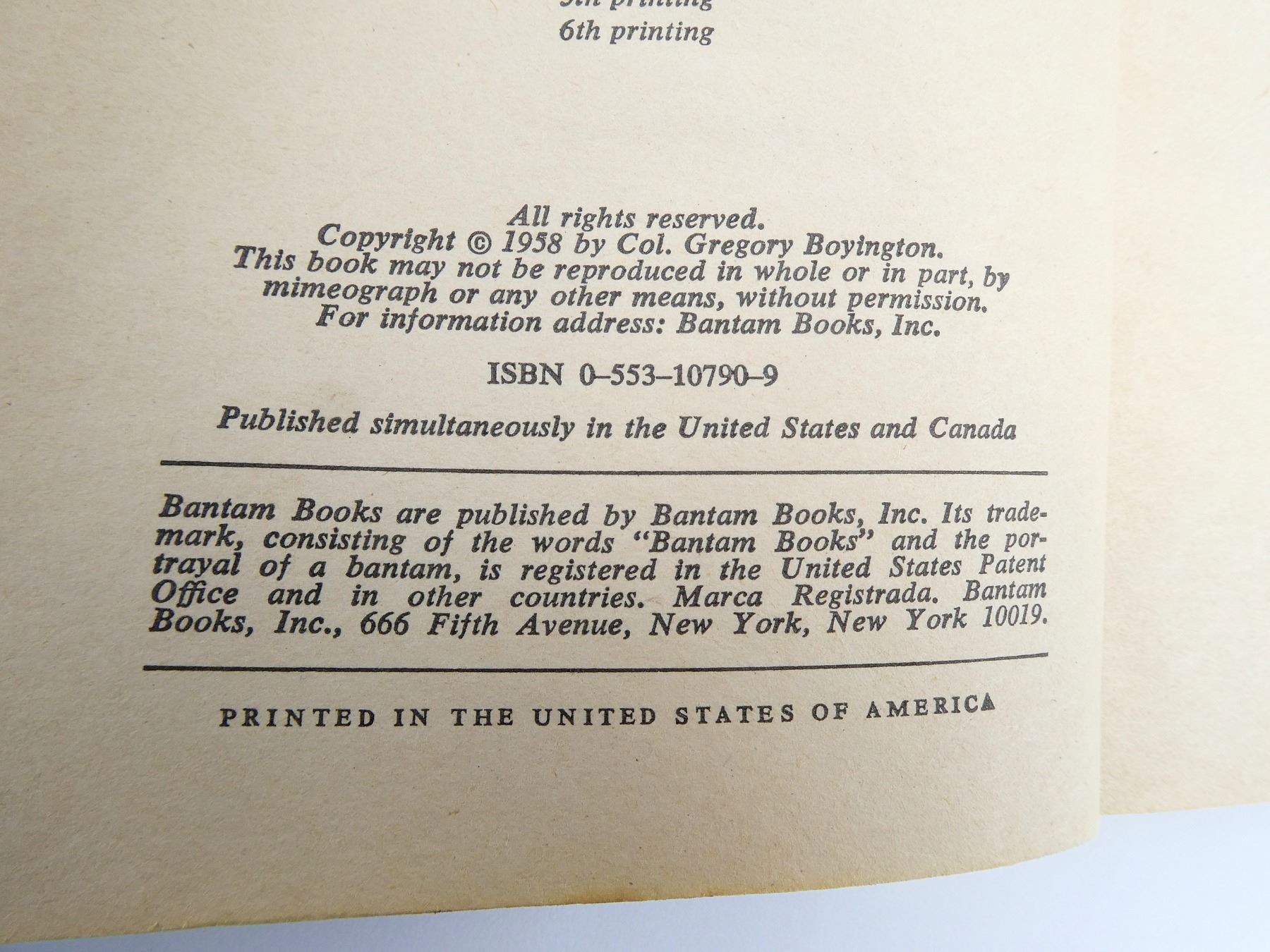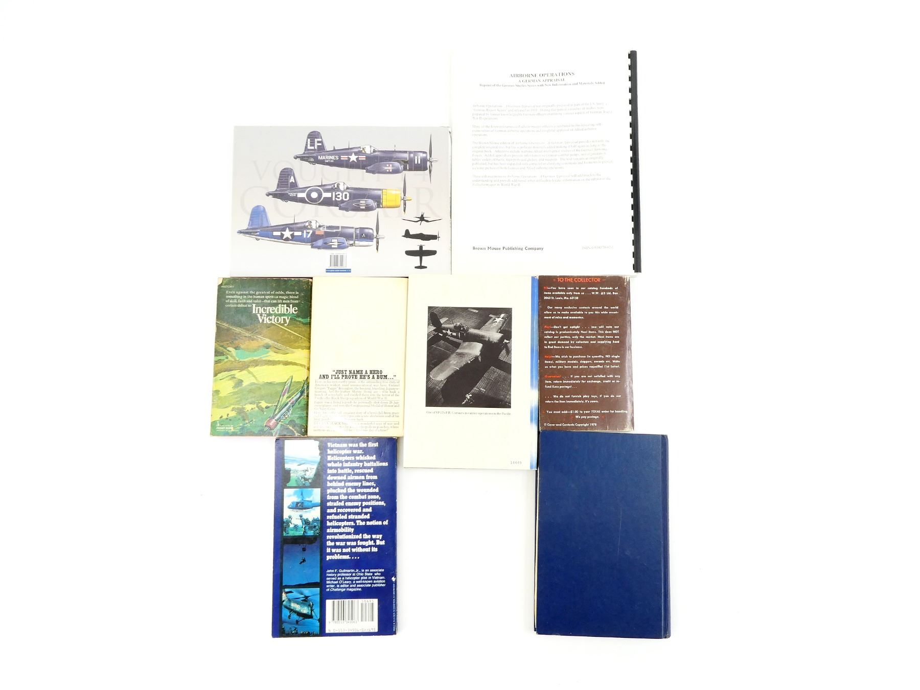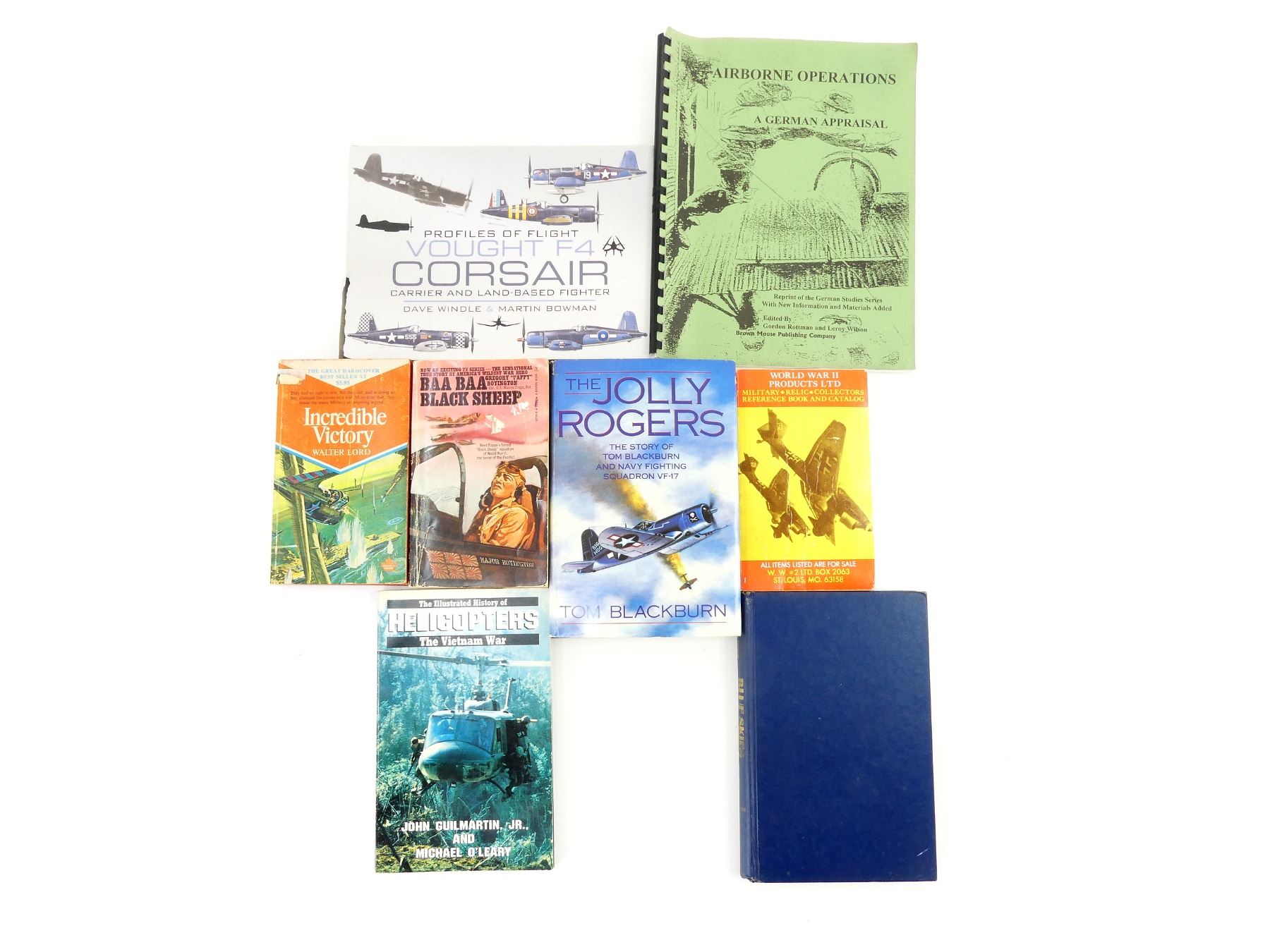 LOT INCLUDES; (1) "INCREDIBLE VICTORY" BOOK BY WALTER LORD, SOFT COVER, COPYRIGHT 1967, (1) "BLUE SKIES AND BLOOD, THE BATTLE OF THE CORAL SEA" BOOK BY EDWIN P. HOYT, HARD COVER, COPYRIGHT 1975, (1) "THE JOLLY ROGERS, THE STORY OF TOM BLACKBURN AND NAVY FIGHTING SQUADRON VF-17" BOOK BY TOM BLACKBURN, HARD COVER WITH DUST COVER, COPYRIGHT 1989, (1) "BAA BAA BLACK SHEEP" BOOK BY GREGORY "PAPPY" BOYINGTON, SOFT COVER, ISBN: 0-553-10790-9, (1) "MILITARY, RELIC, COLLECTORS REFERENCE BOOK AND CATALOG" BOOK BY WORLD WAR II PRODUCTS LTD, SOFT COVER, COPYRIGHT 1978, (1) "THE ILLUSTRATED HISTORY OF THE VIETNAM WAR, HELICOPTERS," BOOK BY JOHN GUILMARTIN JR AND MICHAEL O'LEARY, SOFT COVER, ISBN: 0-553-34506-0, (1) PROFILES OF FLIGHT VOUGHT F4 CORSAIR" BOOK BY DAVE WINDLE AND MARTIN BOWMAN, HARD COVER WITH DUST COVER, ISBN: 978 1 84884 408 7 & (1) "AIRBORNE OPERATIONS, A GERMAN APPRAISAL" BOOK EDITED BY GORDON L. ROTTMAN AND LEROY WILSON, SOFT COVER, ISBN: 0-938570-02-1. SEE PHOTOS.