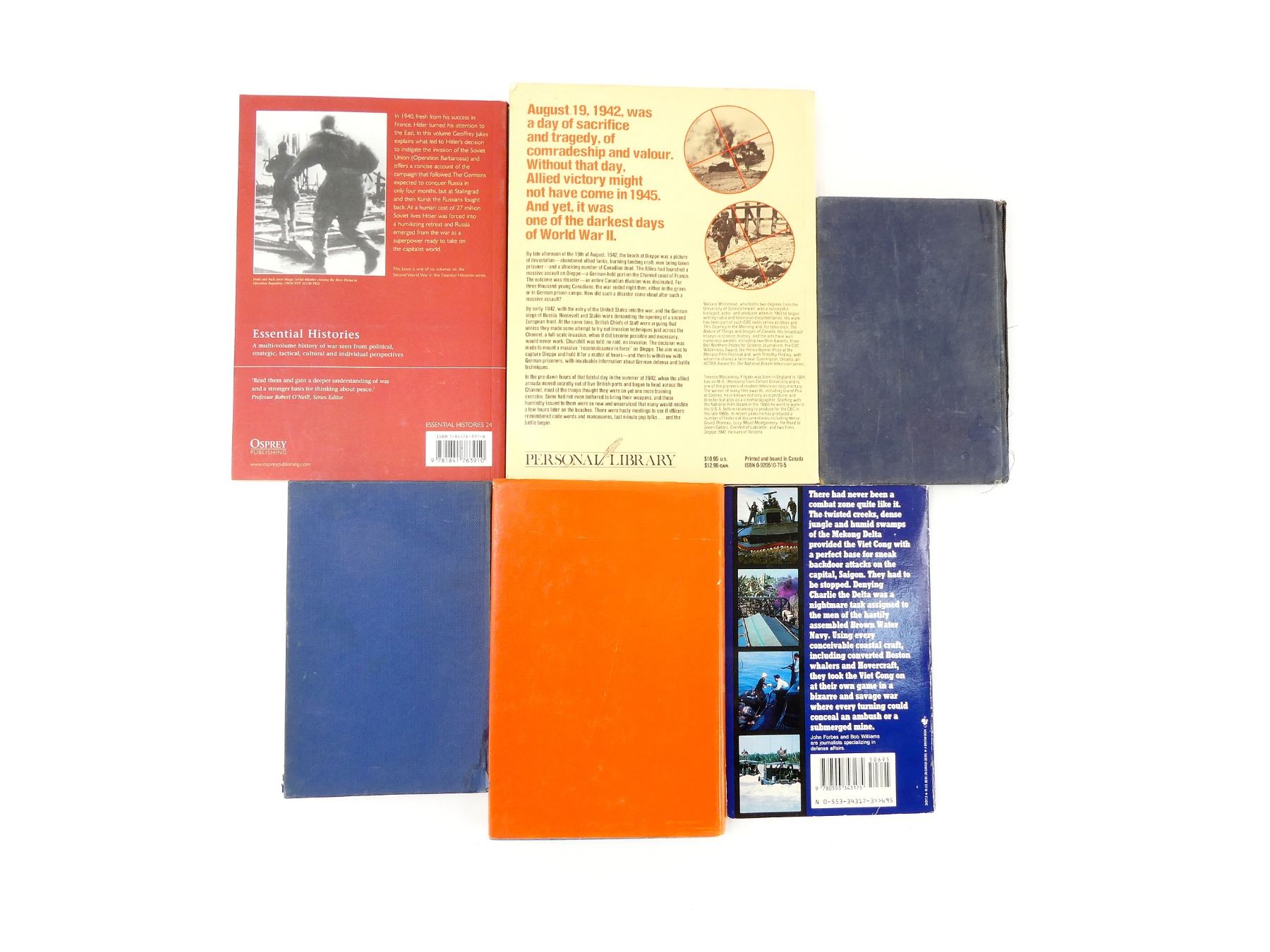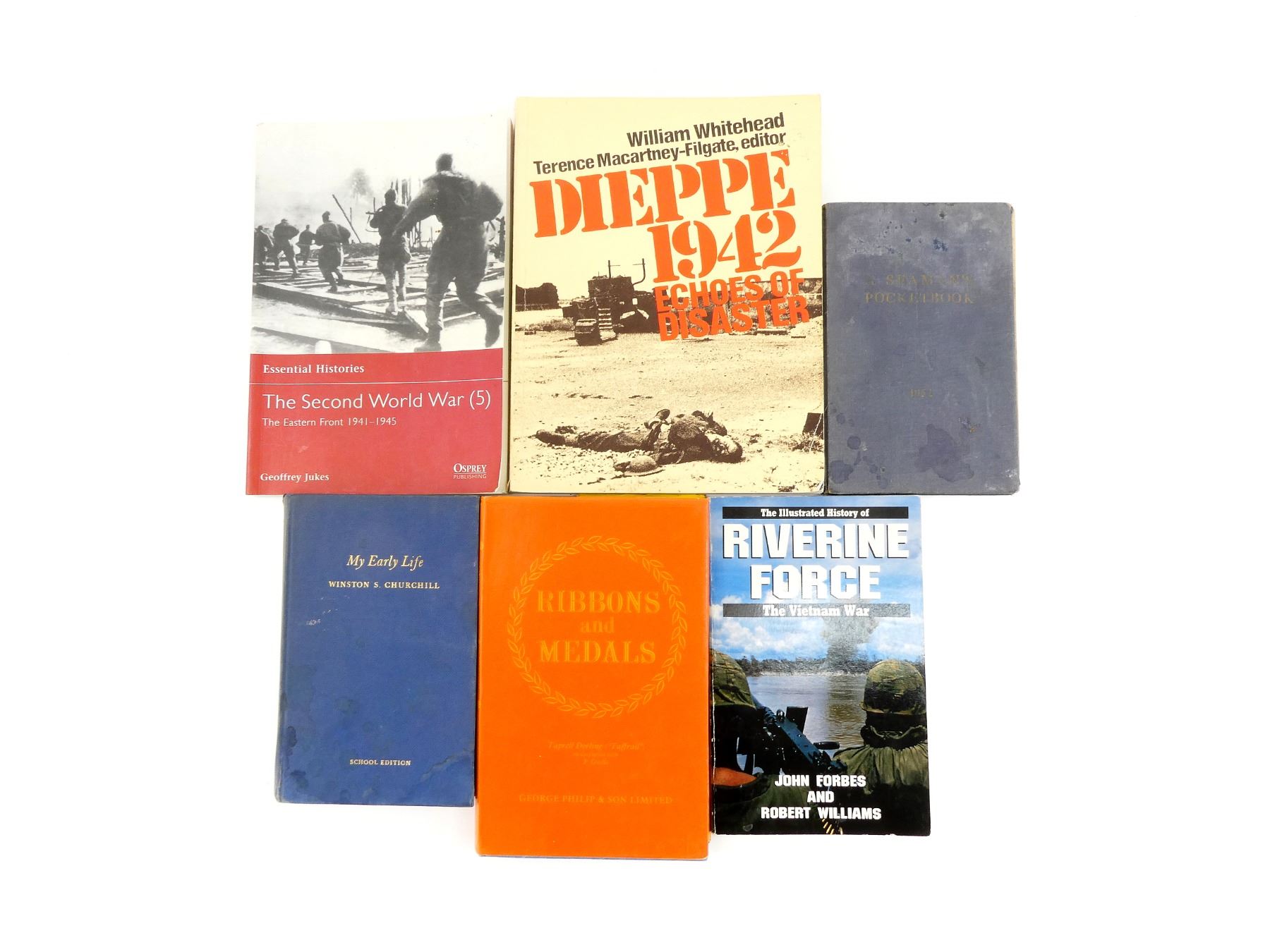 LOT INCLUDES; (1) "RIBBONS AND MEDALS" BOOK BY H. TAPRELL DORIN AND L.F. GUILLE, HARD COVER WITH DUST COVER. COPYRIGHT 1970, (1) "MY EARLY LIFE, SCHOOL EDITION" BOOK BY WINSTON S. CHURCHILL, HARD COVER, 1958, (1) "ESSENTIAL HISTORIES, THE SECOND WORLD WAR (5), THE EASTERN FRONT 1941-1945" BOOK BY GEOFFREY JUKES, SOFT COVER, ISBN: 1 84176 391 8, (1) "DIEPPE 1942 ECHOES OF DISASTER" BOOK BY WILLIAM WHITEHEAD, SOFT COVER, ISBN: 0-920510-79-5, (1) "A SEAMAN'S POCKETBOOK 1952" PUBLISHED BY HER MAJESTY'S STATIONERY OFFICE, HARD COVER, CROWN COPYRIGHT REPRINTED 1958 & (1) "THE ILLUSTRATED HISTORY OF THE VIETNAM WAR, RIVERINE FORCE" BOOK BY JOHN FORBES AND ROBERT WILLIAMS, SOFT COVER, ISBN: 0-553-34317-3. SEE PHOTOS.