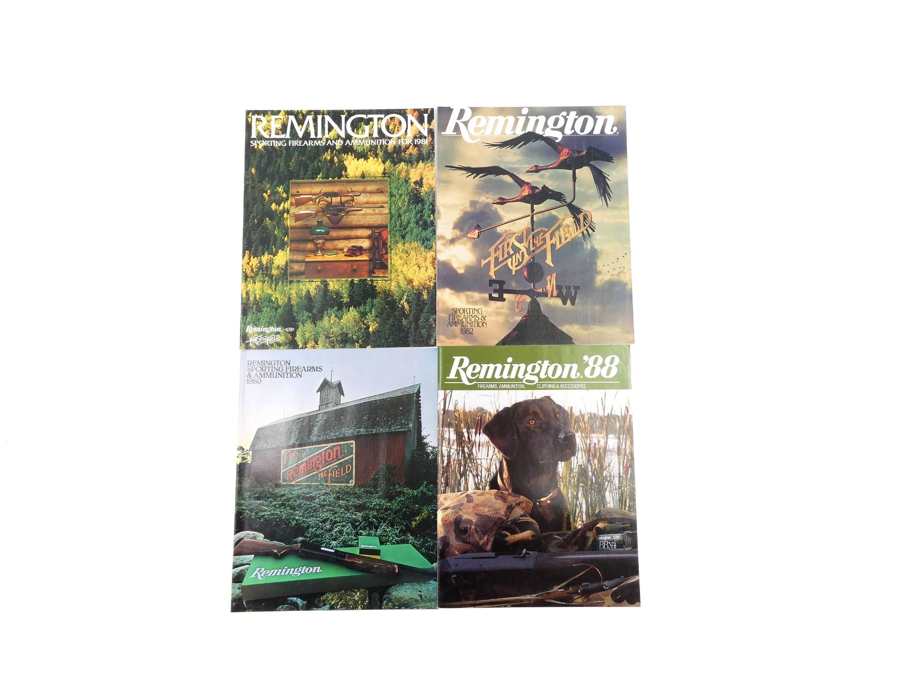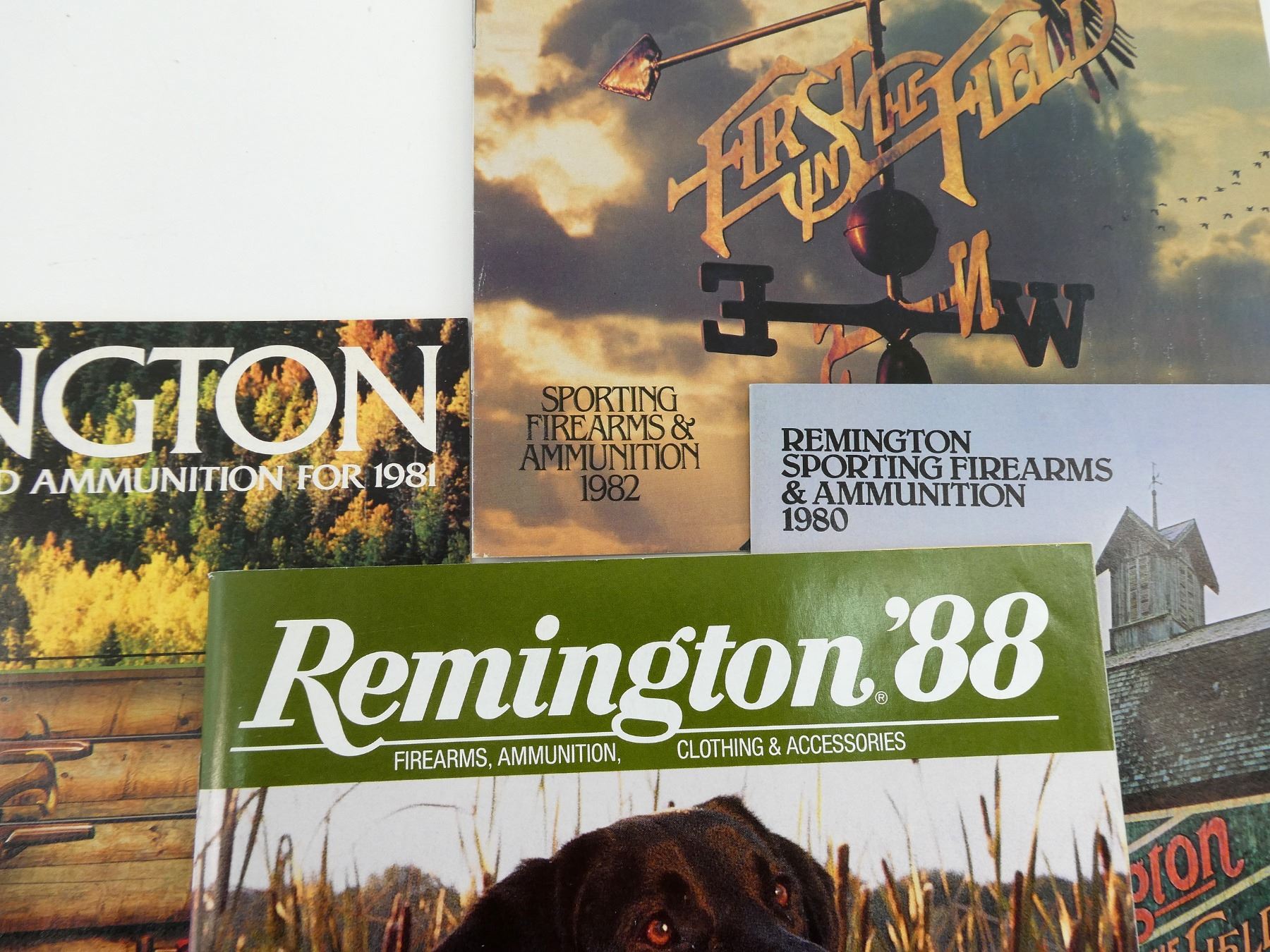SOFT COVERS, LOT INCLUDES; (1) "REMINGTON, SPORTING FIREARMS AND AMMUNITION FOR 1980" CATALOGUE, (1) "REMINGTON, SPORTING FIREARMS AND AMMUNITION FOR 1981" CATALOGUE, (1) "REMINGTON, SPORTING FIREARMS & AMMUNITION 1982" CATALOGUE & (1) "REMINGTON '88, FIREARMS, AMMUNITION, CLOTHING & ACCESSORIES" CATALOGUE. SEE PHOTOS.