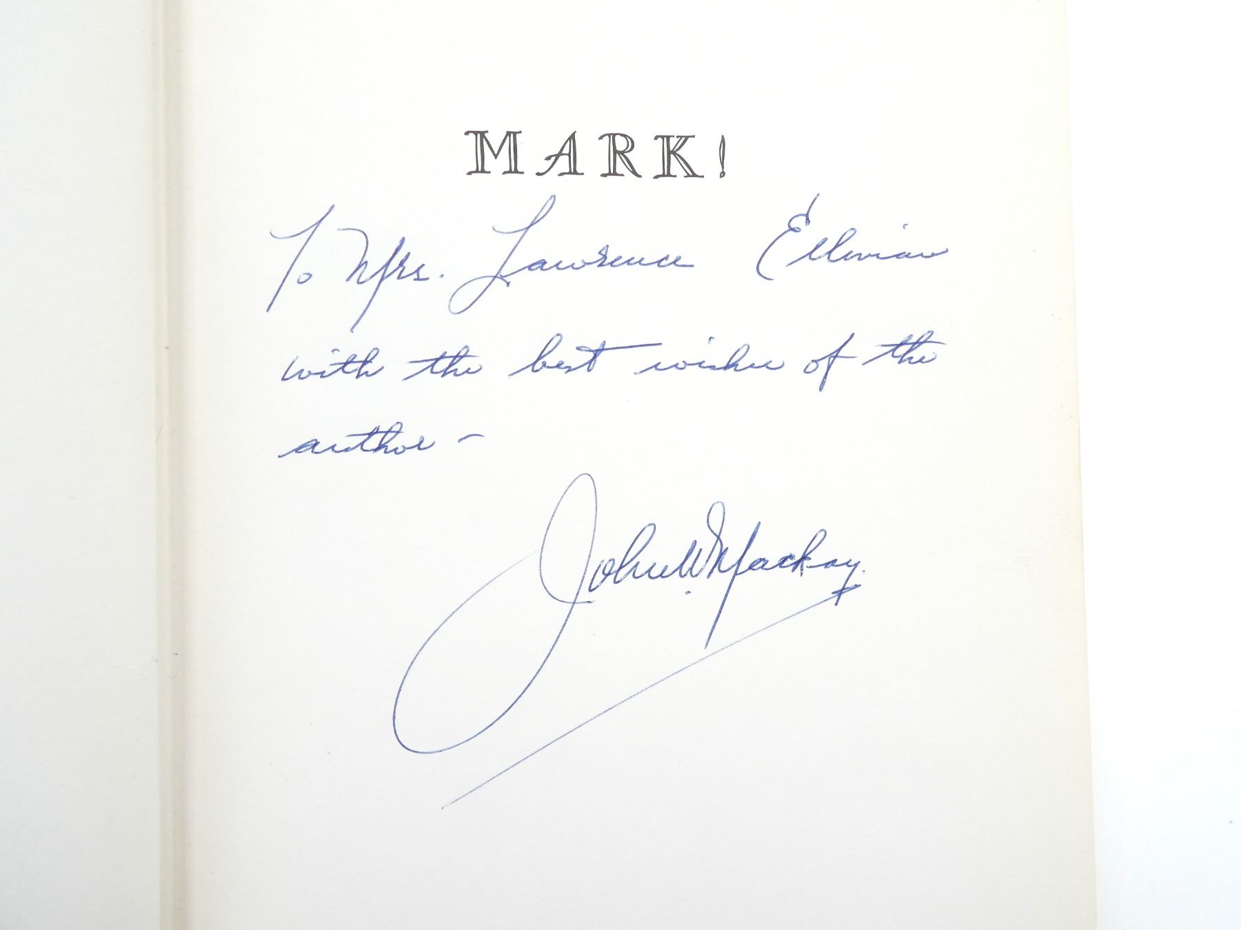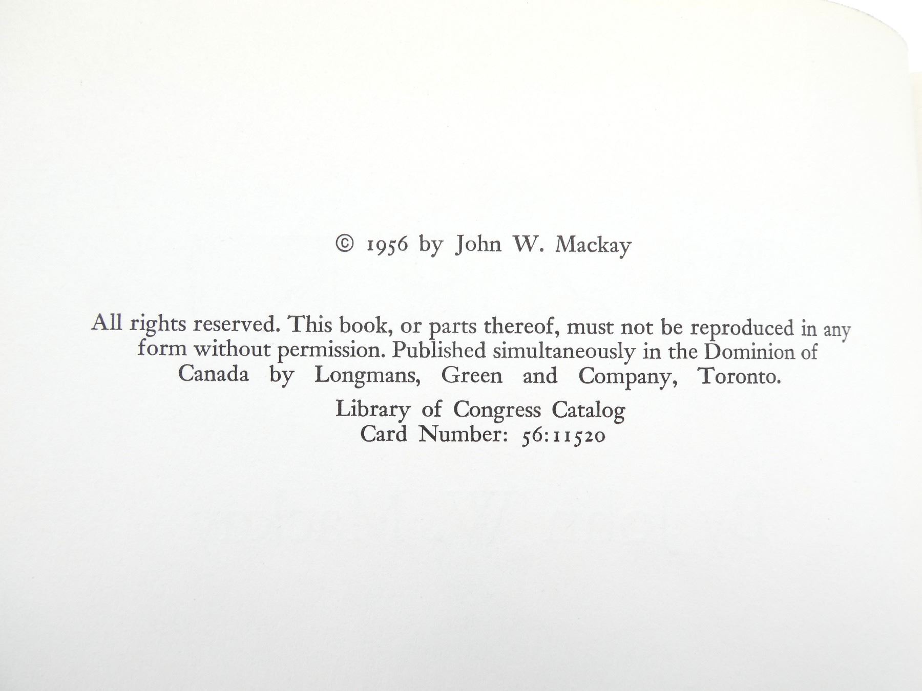 (1) BY JOHN W. MACKAY, HARD COVER WITH DUST COVER, SIGNED BY AUTHOR, COPYRIGHT 1956. SEE PHOTOS.