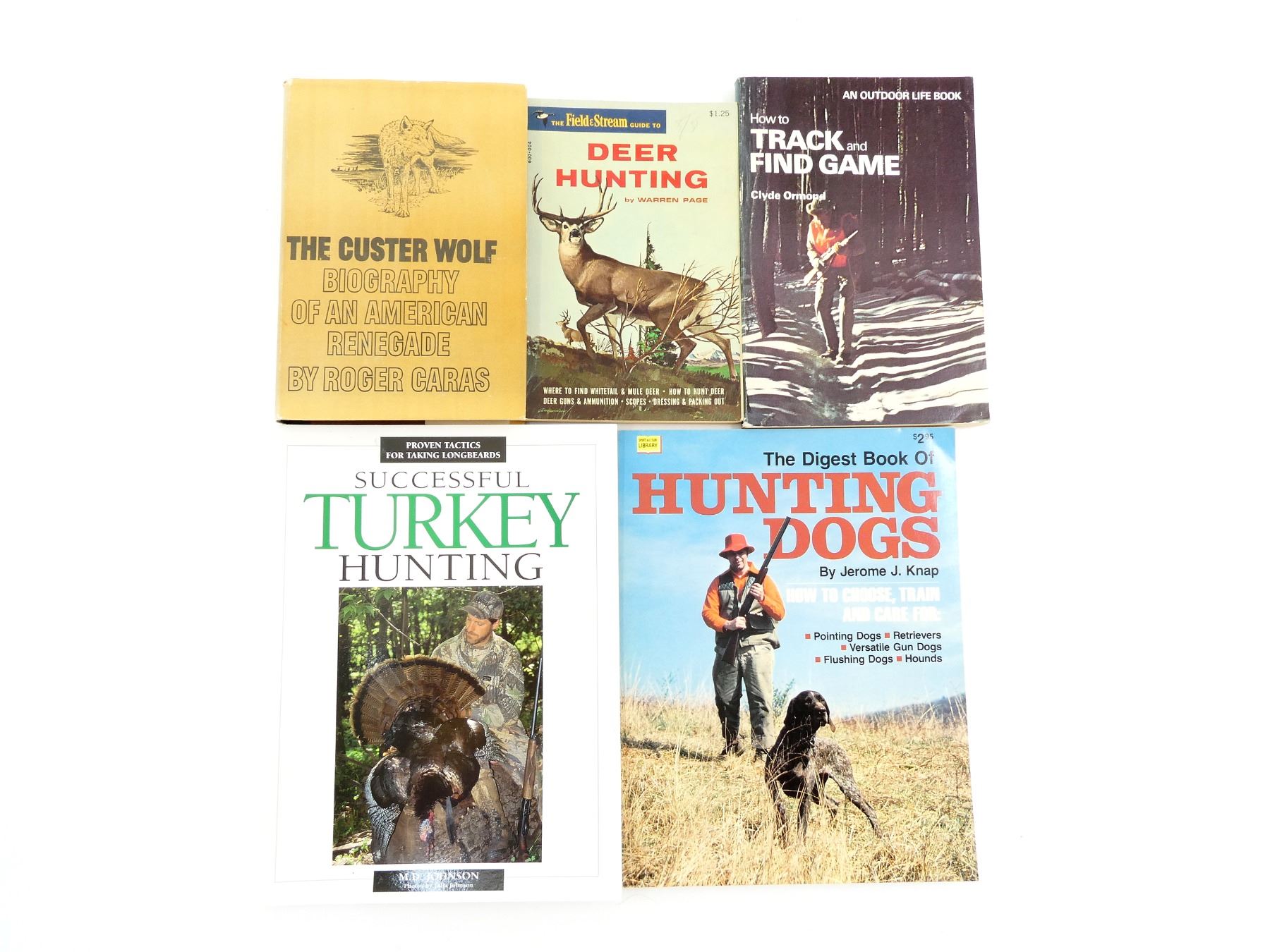 LOT INCLUDES; (1) "THE DIGEST BOOK OF HUNTING DOGS" BOOK BY JEROME J. KNAP, SOFT COVER, ISBN: 0-695-81323-4, (1) "SUCCESSFUL TURKEY HUNTING" BOOK BY M.D. JOHNSON WITH PHOTOS BY JULIA JOHNSON, SOFT COVER, ISBN: 0-87349-352-4, (1) "HOW TO TRACK AND FIND GAME" BOOK BY CLYDE ORMOND, SOFT COVER, ISBN: 0-308-10211-8, (1) "THE FIELD & STREAM GUIDE TO DEER HUNTING" BOOK BY WARREN PAGE, SOFT COVER, COPYRIGHT 1966 & (1) "THE CUSTER WOLF BIOGRAPHY OF AN AMERICAN RENEGADE" BOOK BY ROGER CARAS, HARD COVER WITH DUST COVER, COPYRIGHT 1966. SEE PHOTOS.