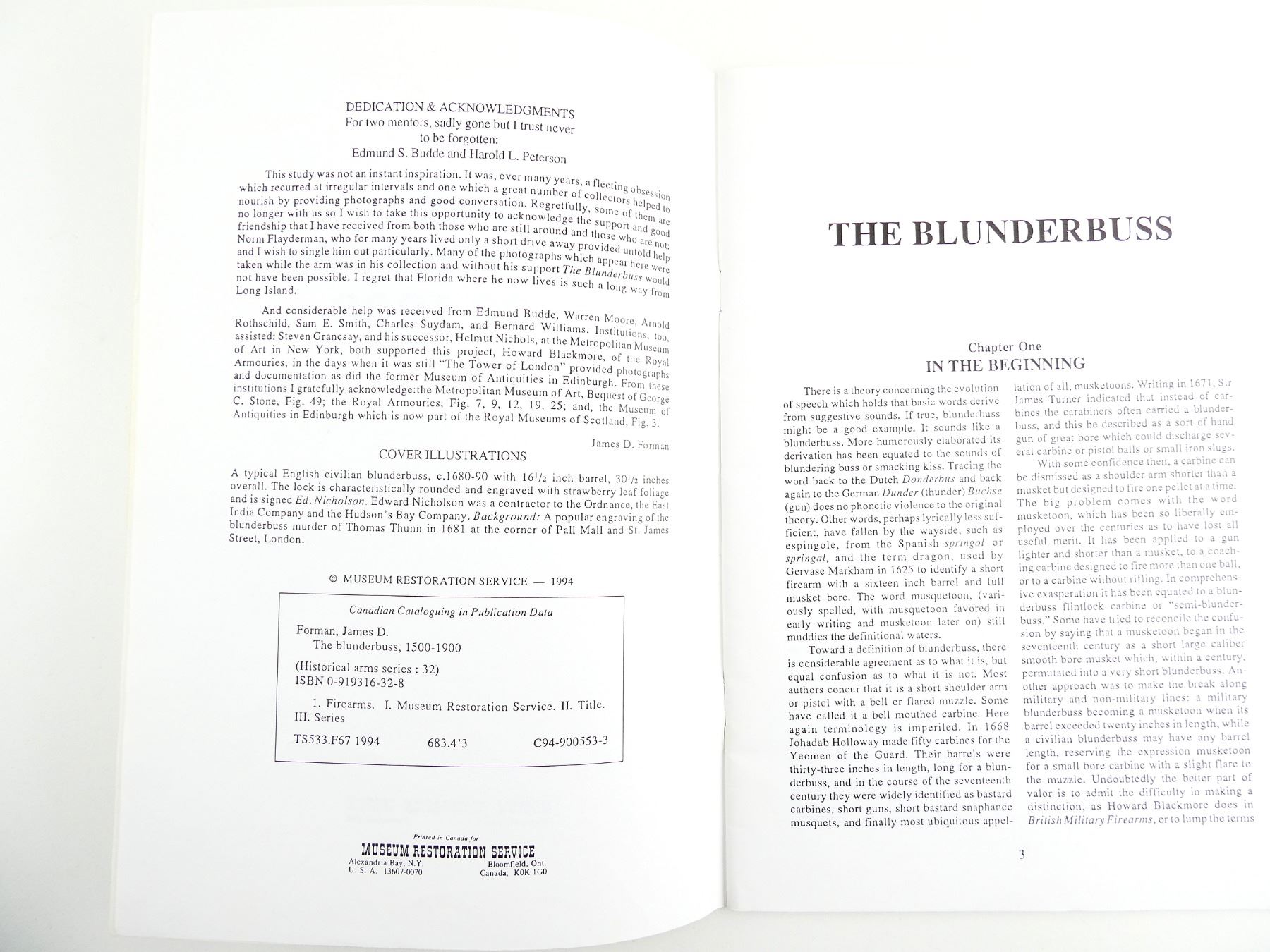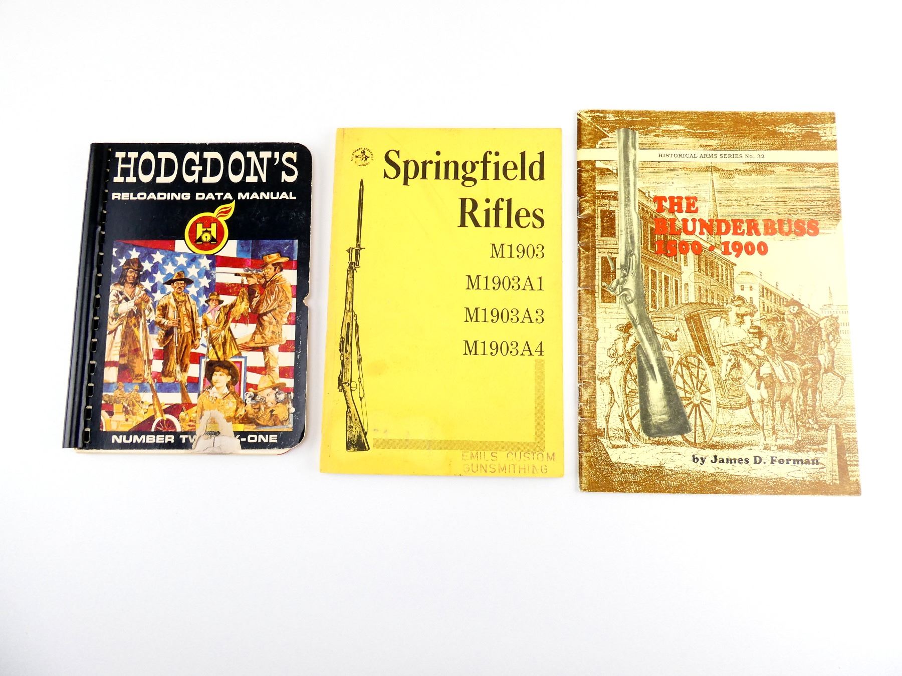 SOFT COVERS, LOT INCLUDES; (1) "HODGDON'S RELOADING DATA MANUAL, NUMBER TWENTY-ONE" BOOK PUBLISHED BY HODGDON POWDER CO. INC., SPIRAL BOUND, COPYRIGHT 1970, (1) "SPRINGFIELD RIFLES M1903, M1903A1, M1903A3, M1903A4" BOOK PUBLISHED BY DESERT PUBLICATIONS, ISBN: 0-87947-009-7 & (1) "THE BLUNDERBUSS 1500-1900" BOOK BY JAMES D. FORMAN, ISBN: 0-919316-32-8. SEE PHOTOS.