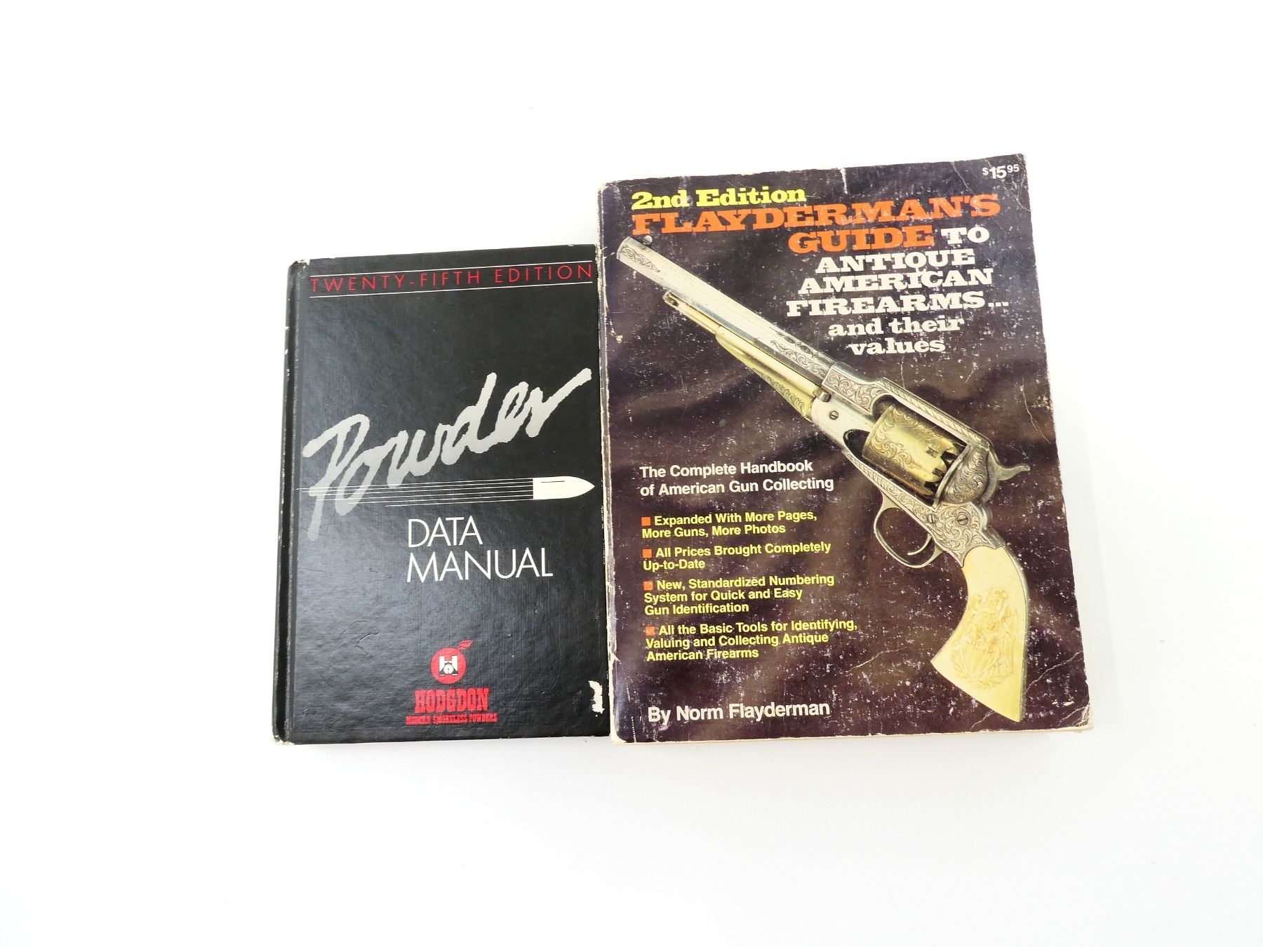 LOT INCLUDES; (1) "HODGDON DATA MANUAL NO. 25" BOOK PUBLISHED BY HODGDON POWDER CO. INC., HARD COVER, COPYRIGHT 1986 & (1) "2ND EDITION FLAYDERMAN'S GUIDE TO ANTIQUE AMERICAN FIREARMS … AND THEIR VALUES" BOOK BY NORM FLAYDERMAN, SOFT COVER, ISBN: 0-910676-07-0. SEE PHOTOS.