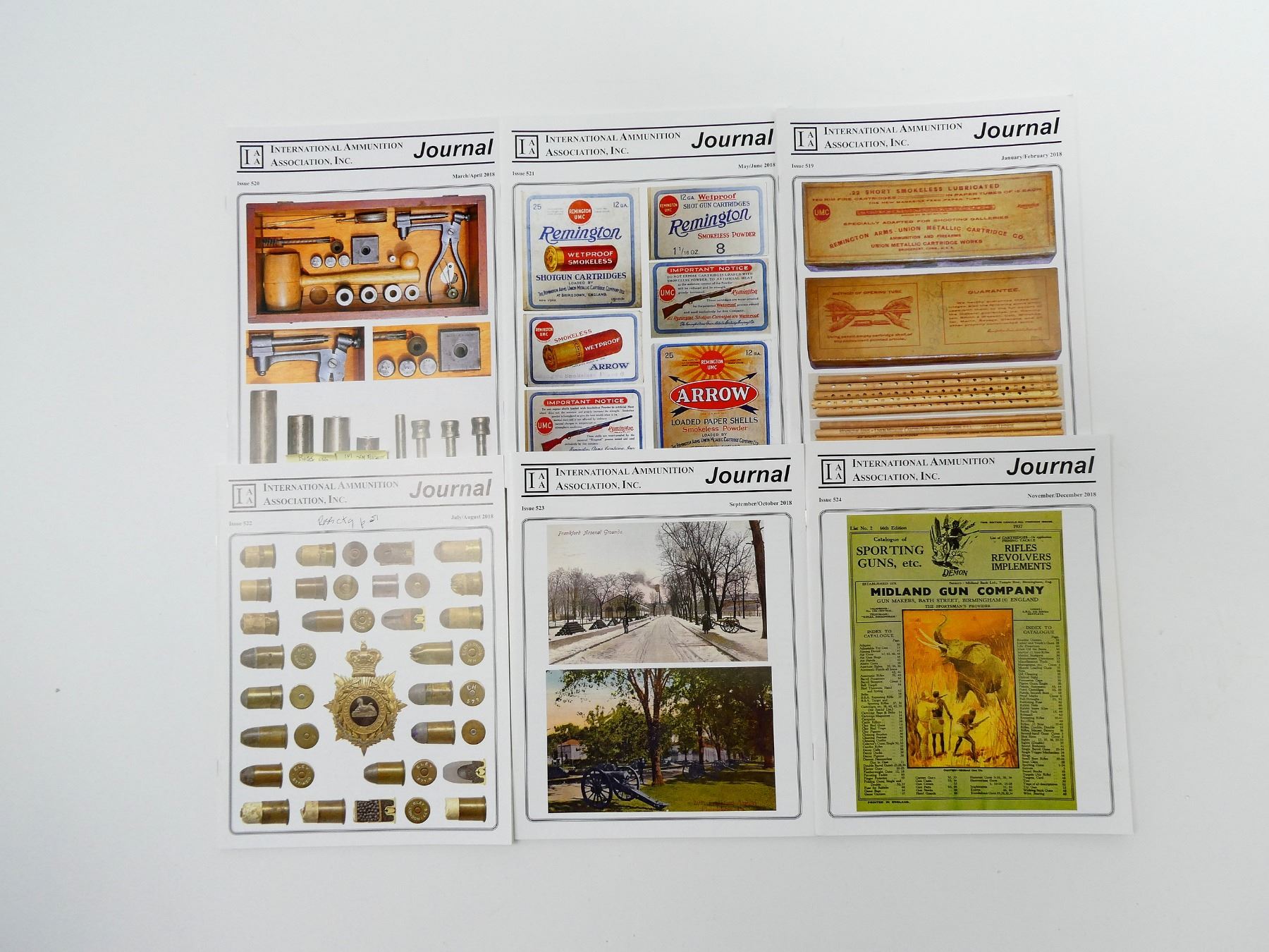 SOFT COVERS, LOT INCLUDES; (6) "INTERNATIONAL AMMUNITION ASSOCIATION INC." JOURNALS FROM JANUARY 2018 TO DECEMBER 2018, SERIES NOT COMPLETE / SOME ISSUES MISSING / MAY CONTAIN DUPLICATES. SEE PHOTOS.