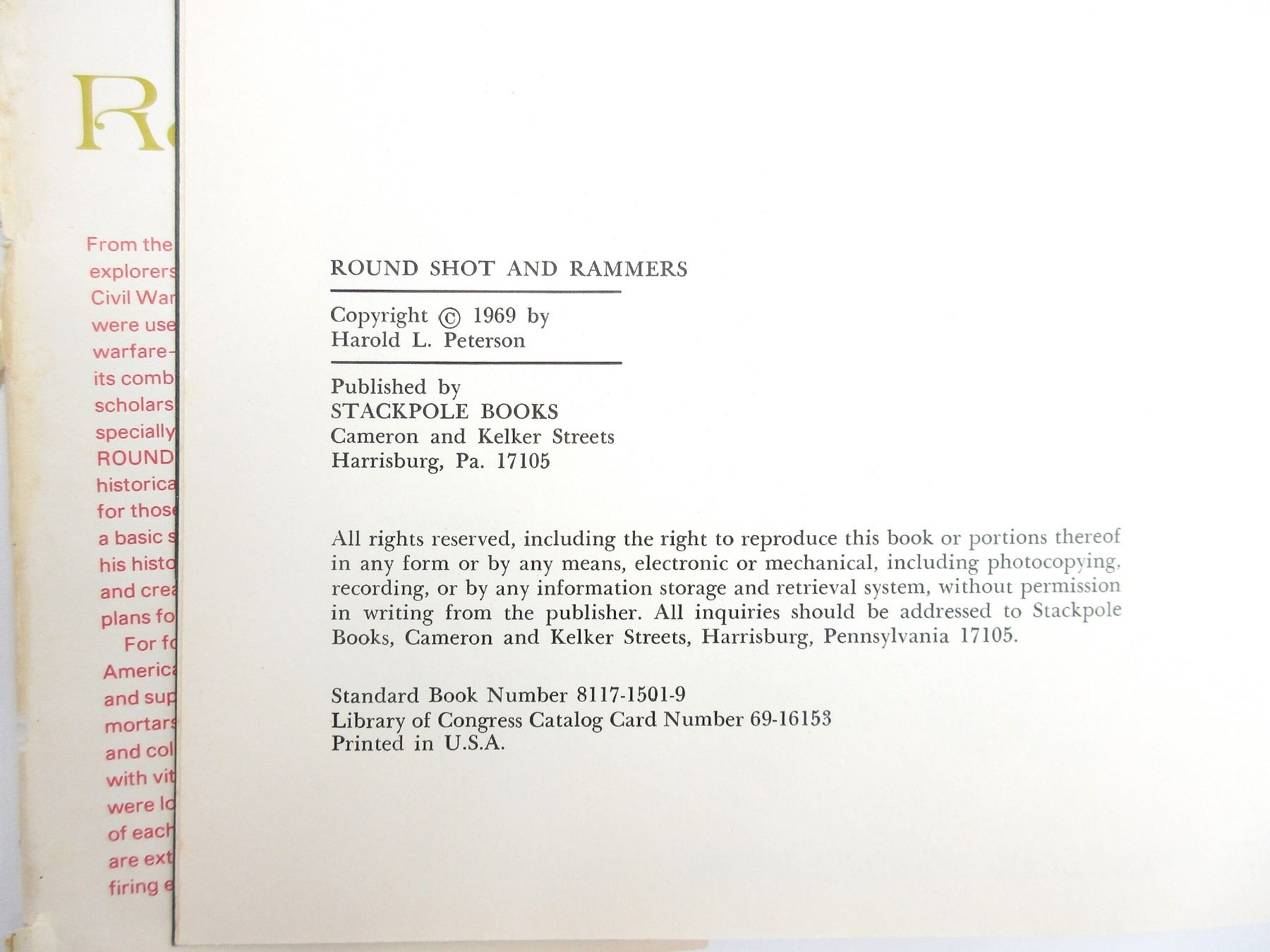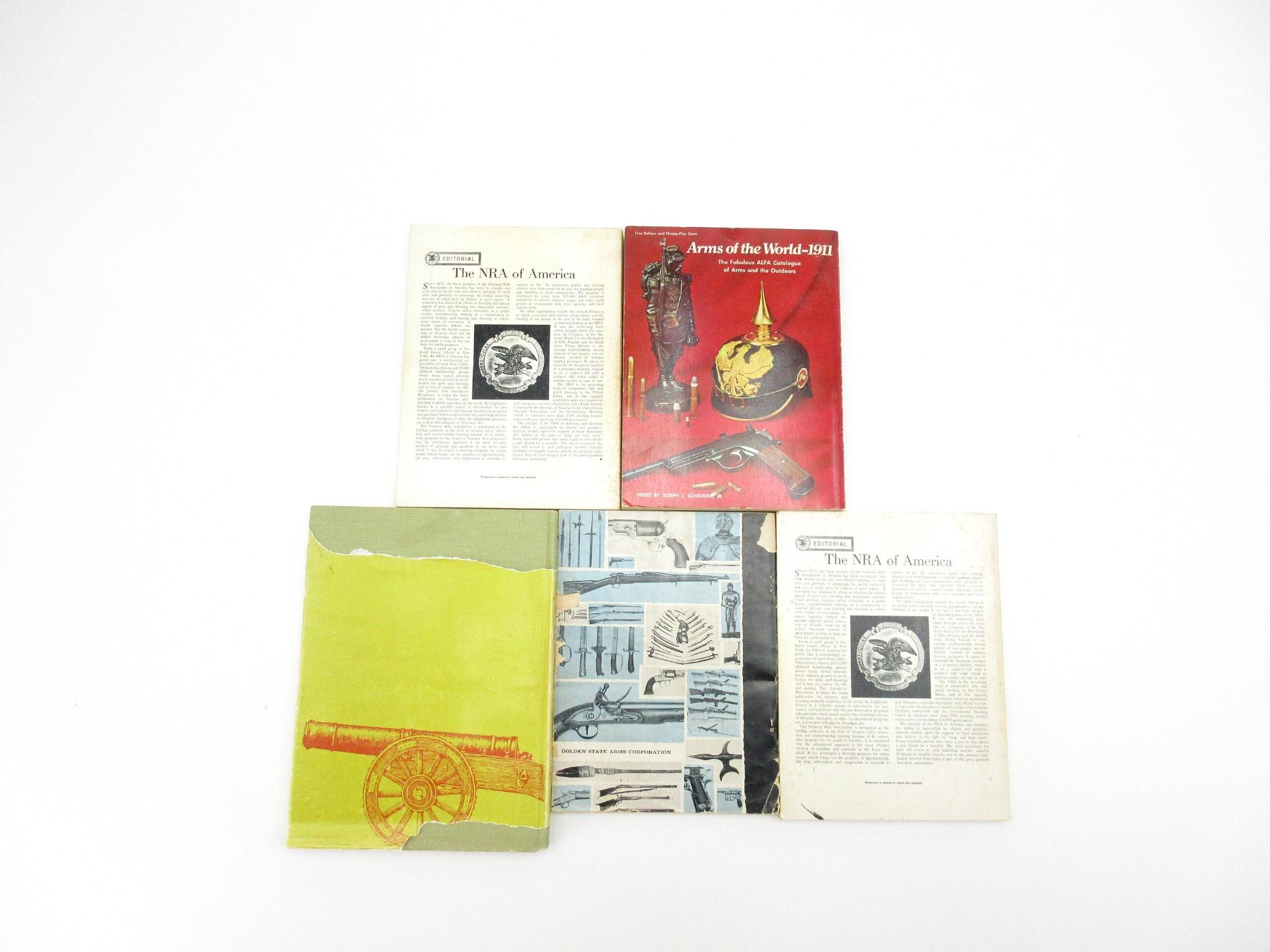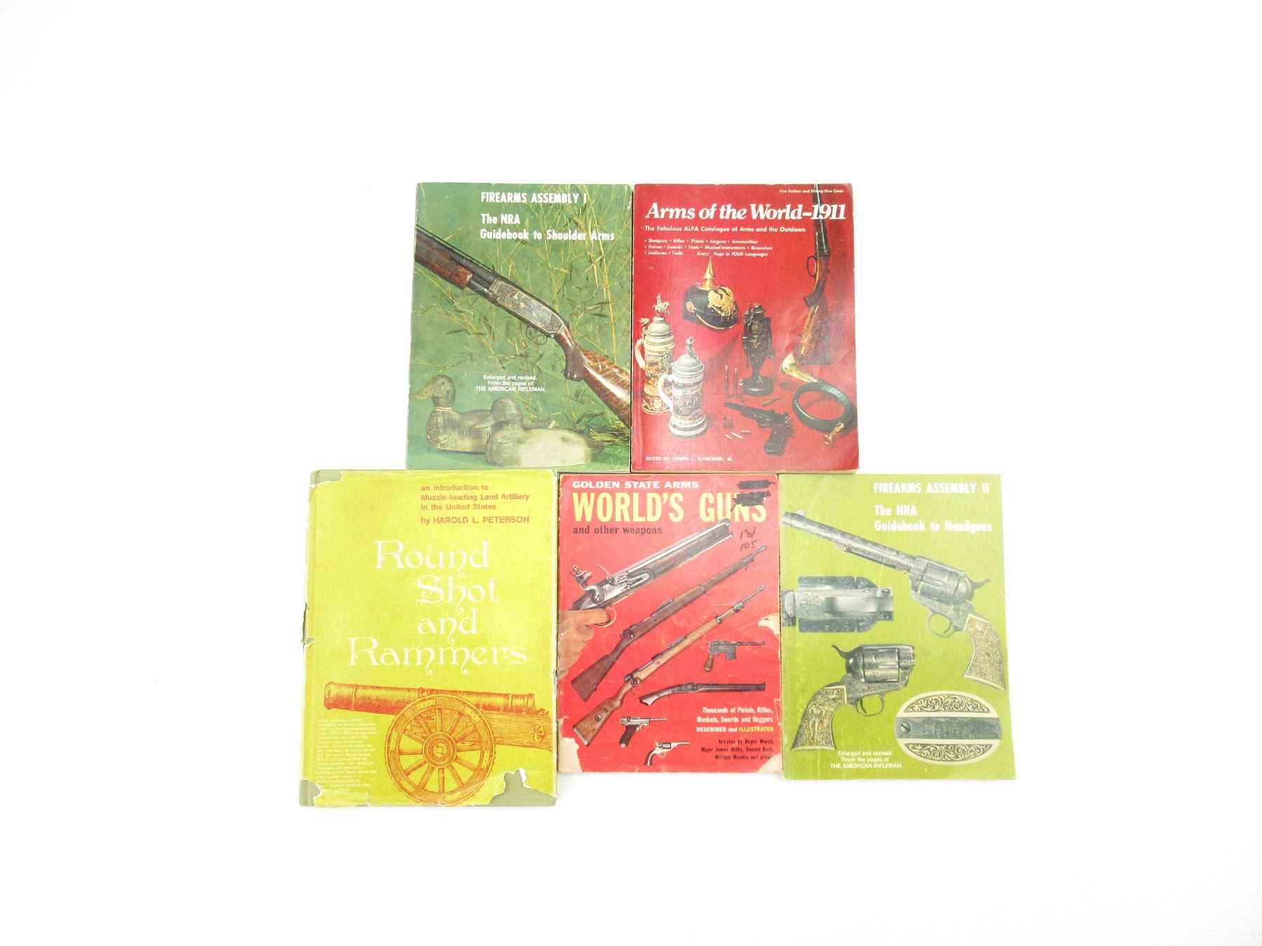 LOT INCLUDES; (1) "ROUND SHOT AND RAMMERS" BOOK BY HAROLD L. PETERSON, HARD COVER WITH DUST COVER, SBN: 8117-1501-9, (1) "GOLDEN STATE ARMS WORLD'S GUNS AND OTHER WEAPONS" BOOK EDITOR-IN-CHIEF PHILIP MCFARLAND, SOFT COVER, COPYRIGHT 1958, (1) "ARMS OF THE WORLD-1911" BOOK EDITED BY JOSEPH J. SCHROEDER, JR, SOFT COVER, ISBN: 0-695-80333-6, (1) "FIREARMS ASSEMBLY I: THE NRA GUIDEBOOK TO SHOULDER ARMS" BOOK BY NATIONAL RIFLE ASSOCIATION, SOFT COVER, COPYRIGHT 1972, & (1) "FIREARMS ASSEMBLY II: THE NRA GUIDEBOOK TO HANDGUNS" BOOK BY NATIONAL RIFLE ASSOCIATION, SOFT COVER, COPYRIGHT 1972. SEE PHOTOS.