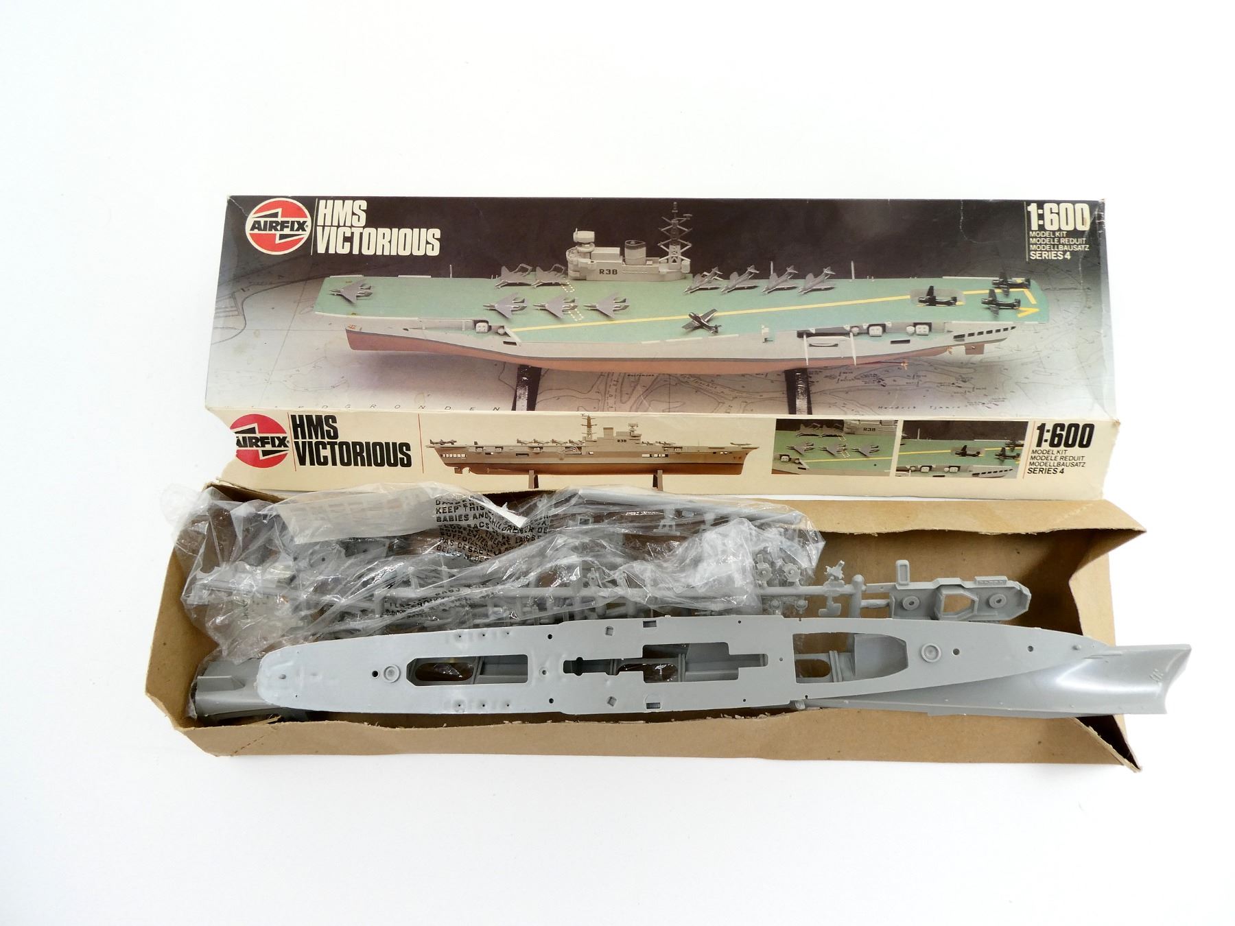 (1) HMS VICTORIOUS MODEL KIT, 1:600 SCALE IN ORIGINAL PACKAGING, MAY NOT BE COMPLETE / PIECES MAY BE MISSING. SEE PHOTOS.