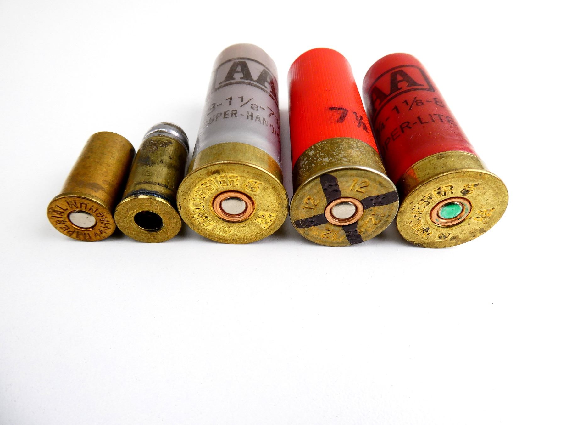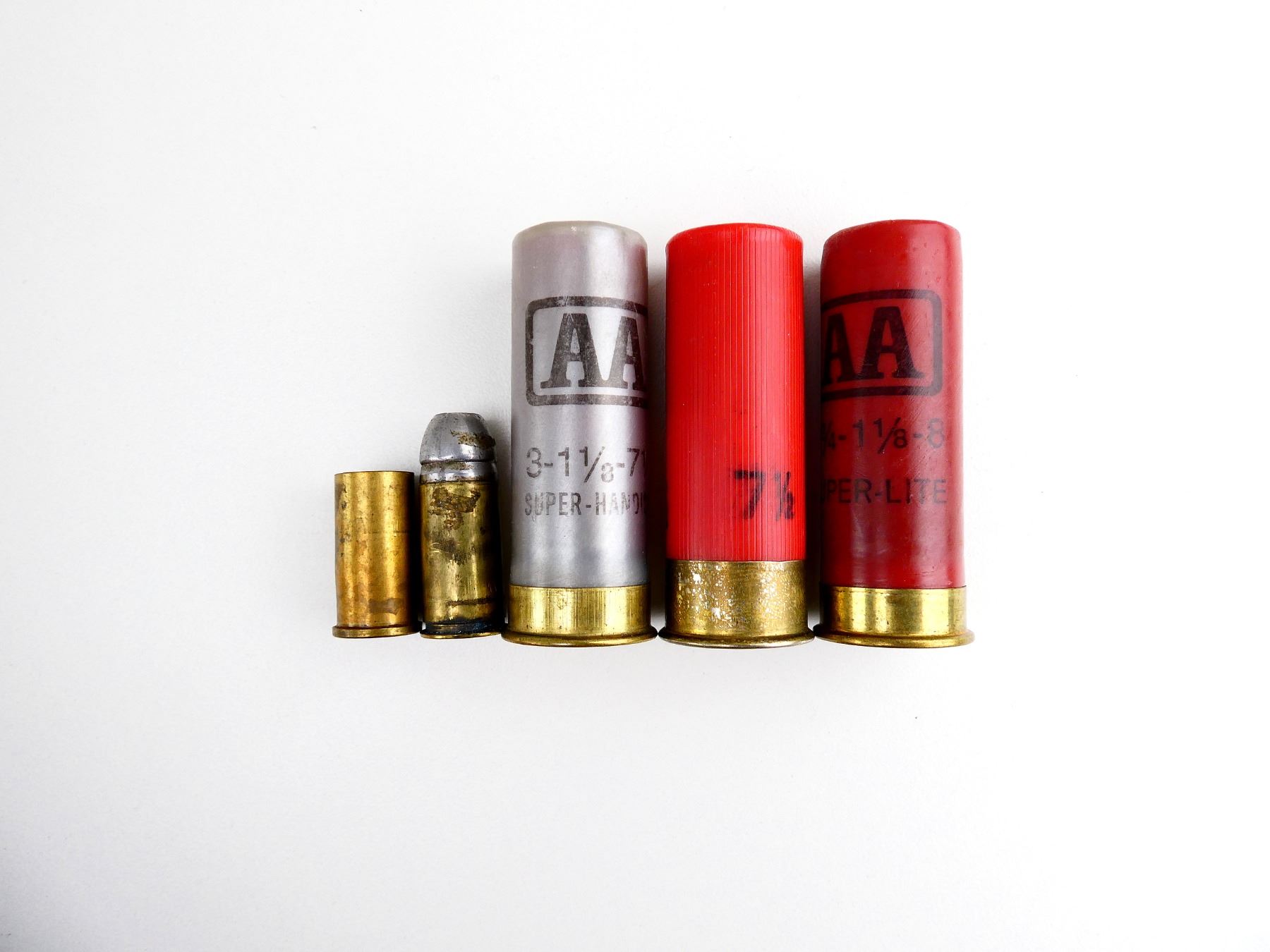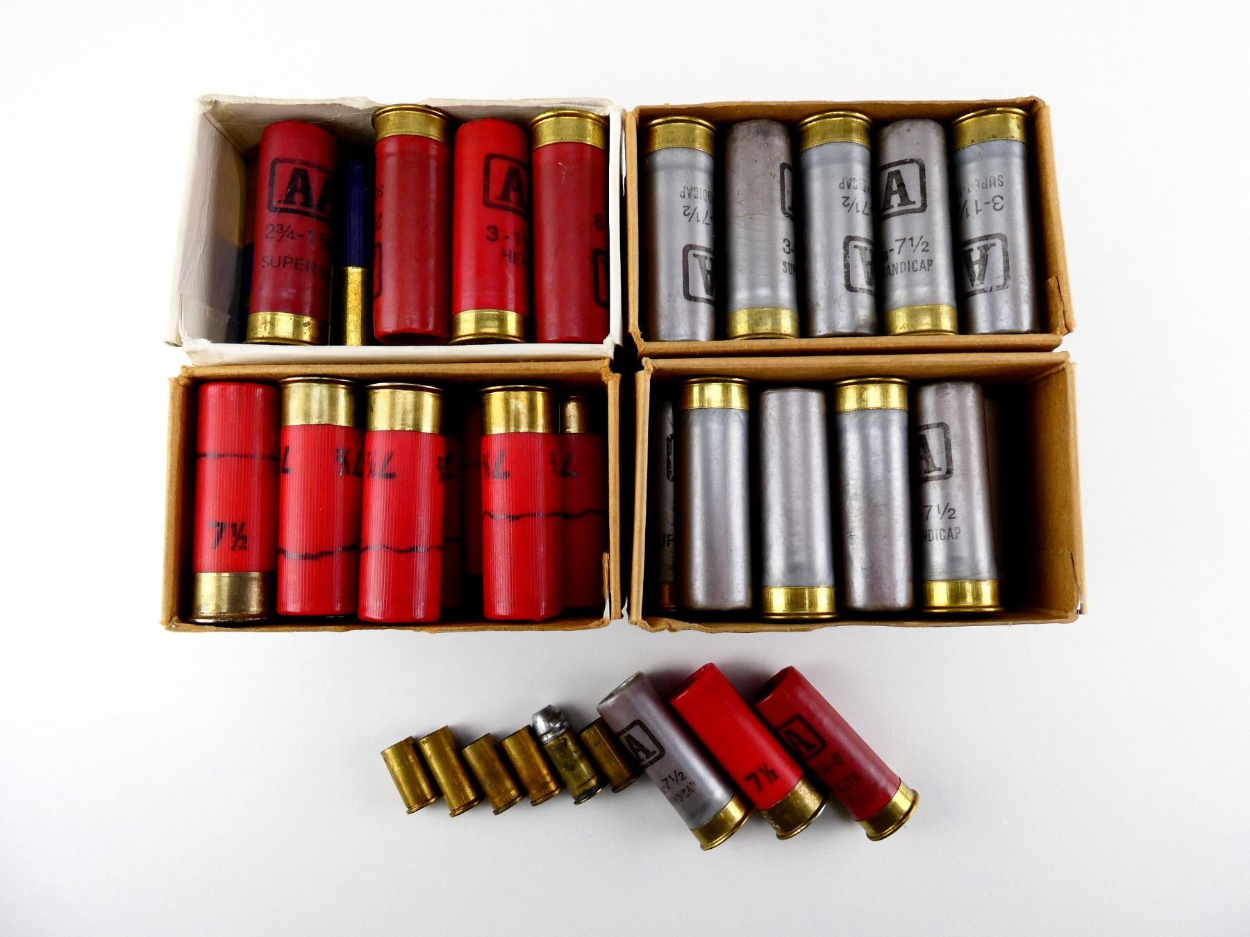LOT INCLUDES; APPROX. (100) RNDS, VARIOUS SHOT SIZES INCLUDING; #7 1/2, #8, ETC., (4) PRIMED BRASS CASES (2) NON-PRIMED BRASS CASES.