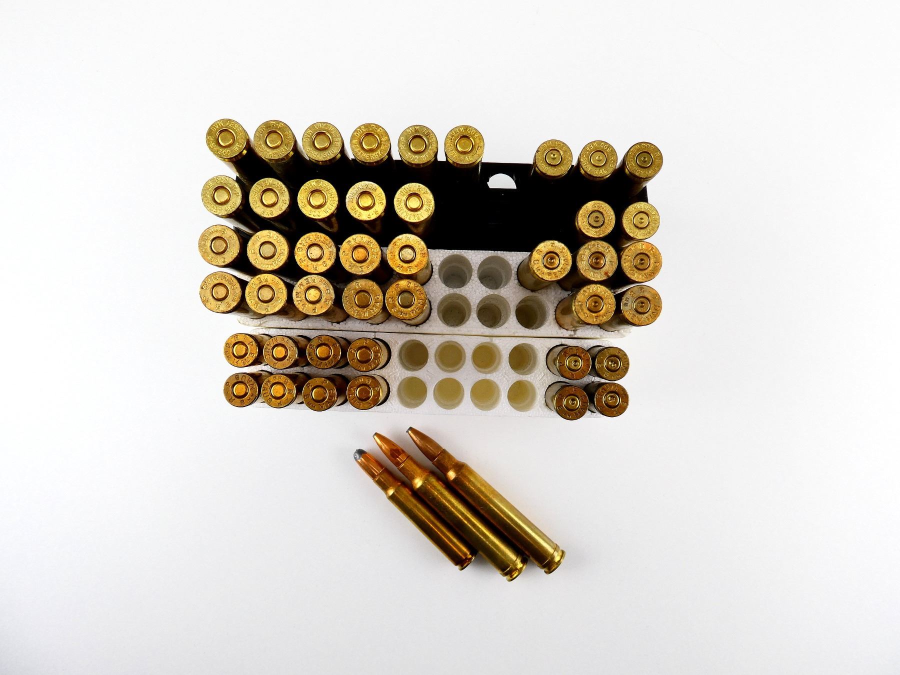 LOT INCLUDES; APPROX. (32) RNDS, ASSORTED CALIBERS INCLUDING; .300 WEATHERBY MAG, 9MM REM MAG, 8MM MAUSER, ETC., (14) NON-PRIMED BRASS CASES.