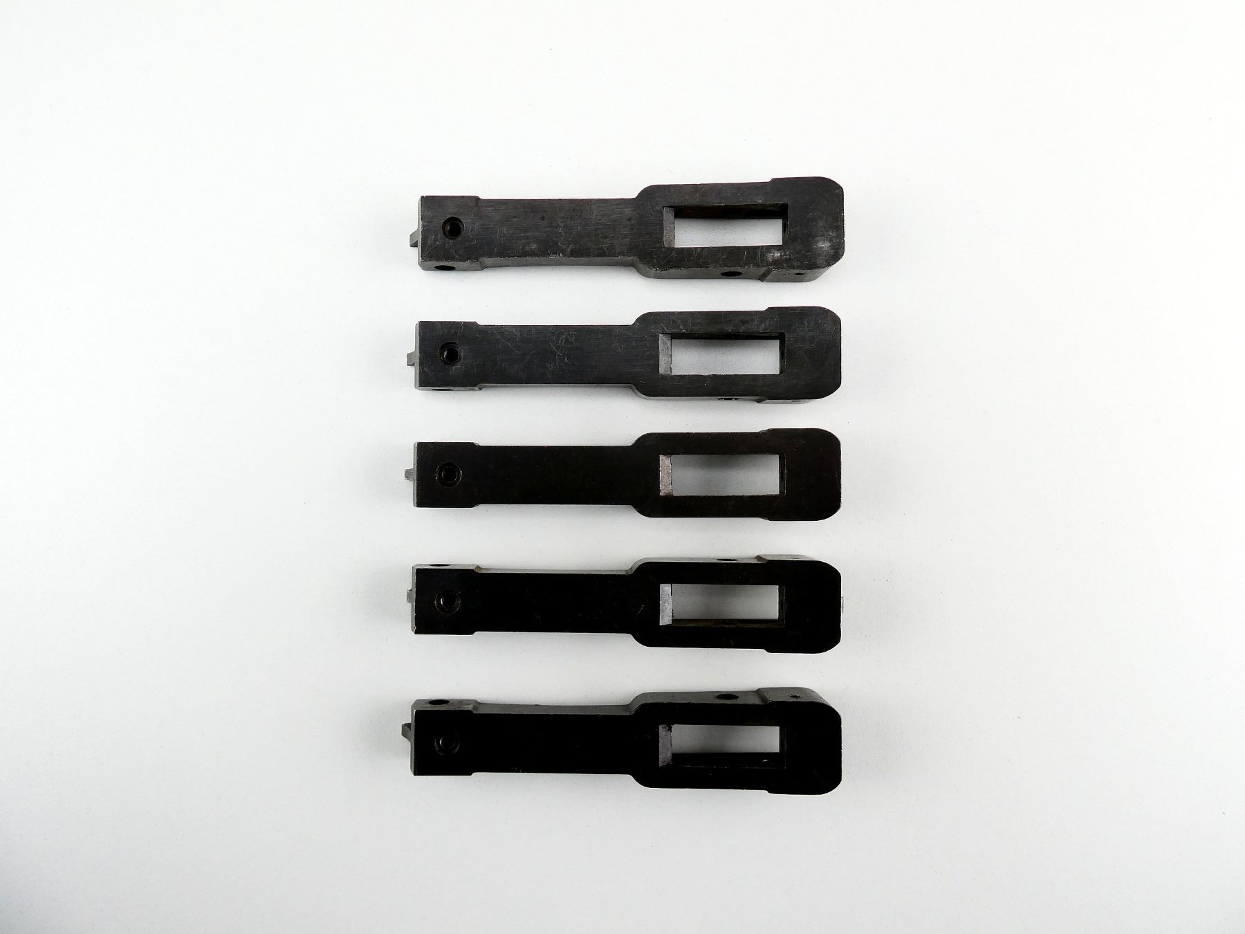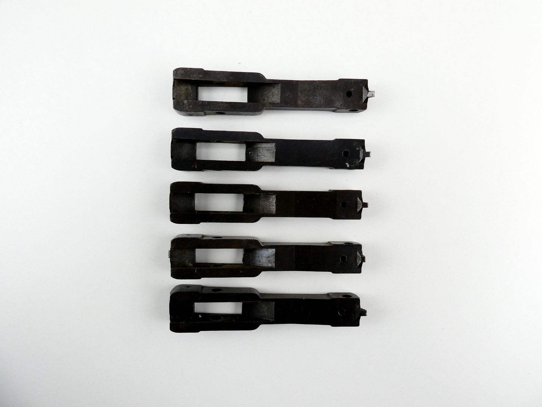 LOT INCLUDES; (5) BLUED STEEL LINKS, USES PIN WITH RETAINING SCREW, UNMARKED, OAL APPROX. 4". MAY REQUIRE FITTING AND / OR REPAIR. SEE PHOTOS.