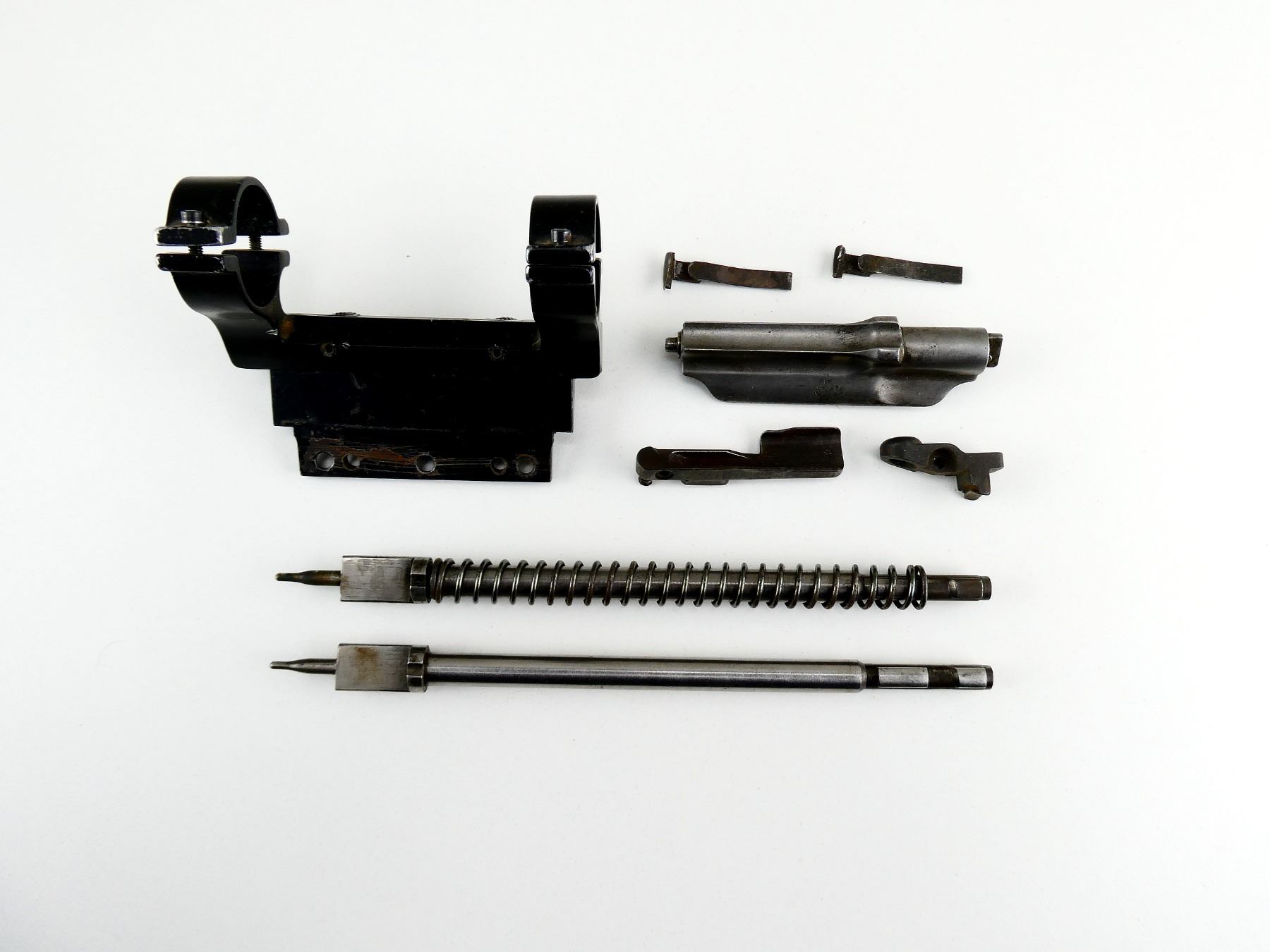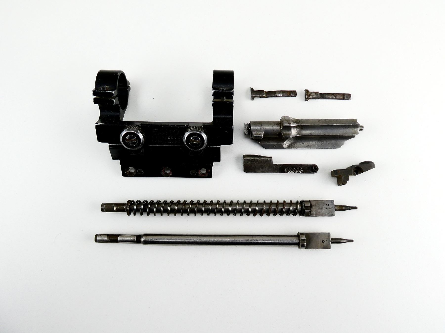 LOT INCLUDES; FIRING PINS WITH ONE SPRING, MAG FOLLOWER, (2) EXTRACTORS, BOLT CATCH, ECHO SCOPE MOUNT WITH RINGS (MISSING SCREWS), ETC. MAY REQUIRE FITTING. SEE PHOTOS.