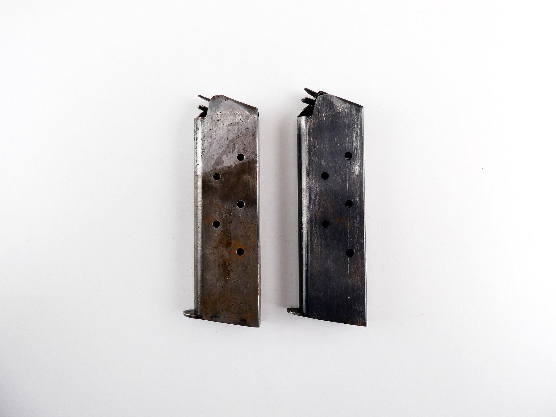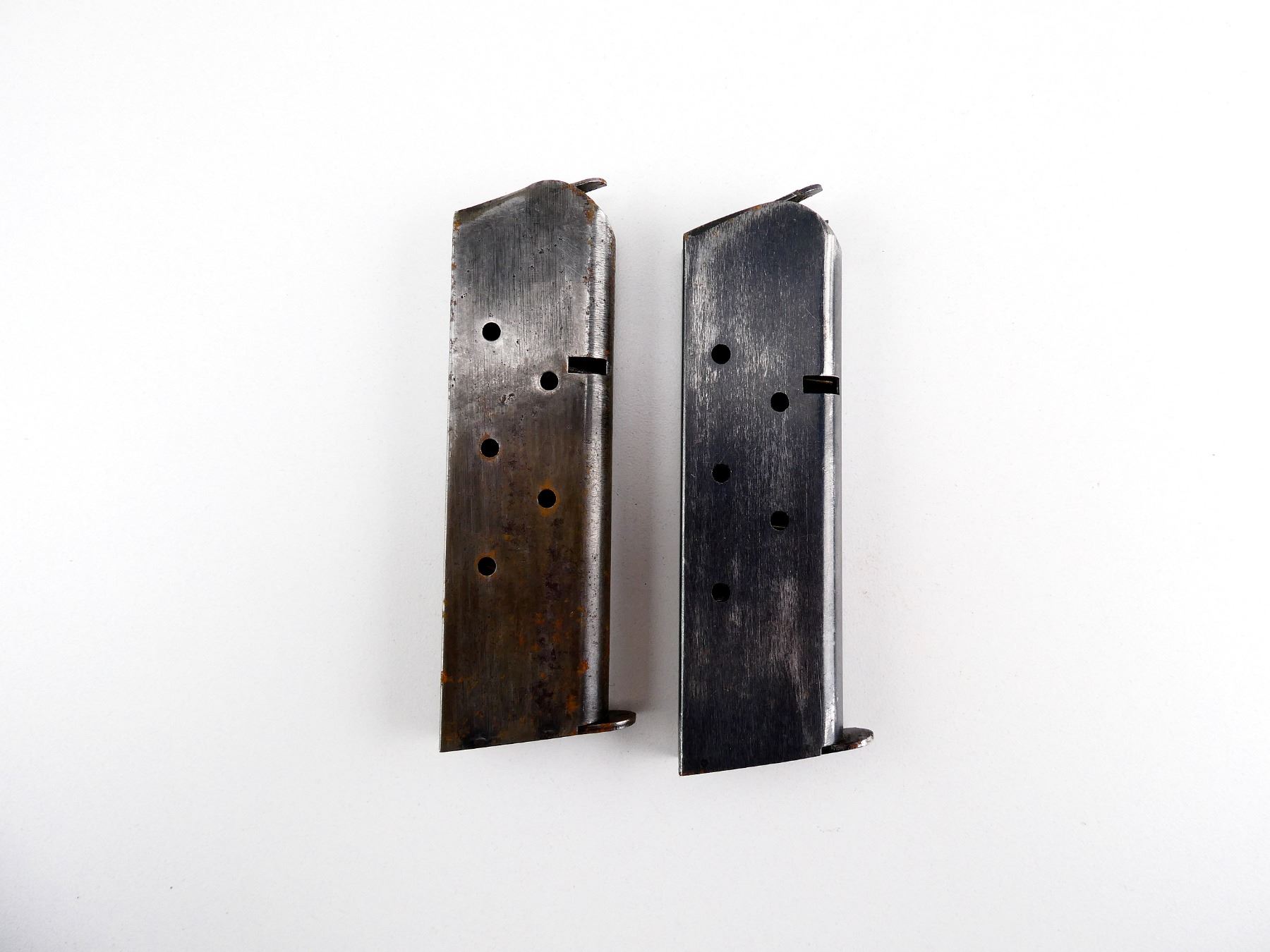 LOT INCLUDES; (2) 1911 .45 ACP MAGS, 7 RNDS, ONE BLUED / ONE TWO-TONED STEEL CONSTRUCTION, UNMARKED. SEE PHOTOS. PAL REQUIRED.