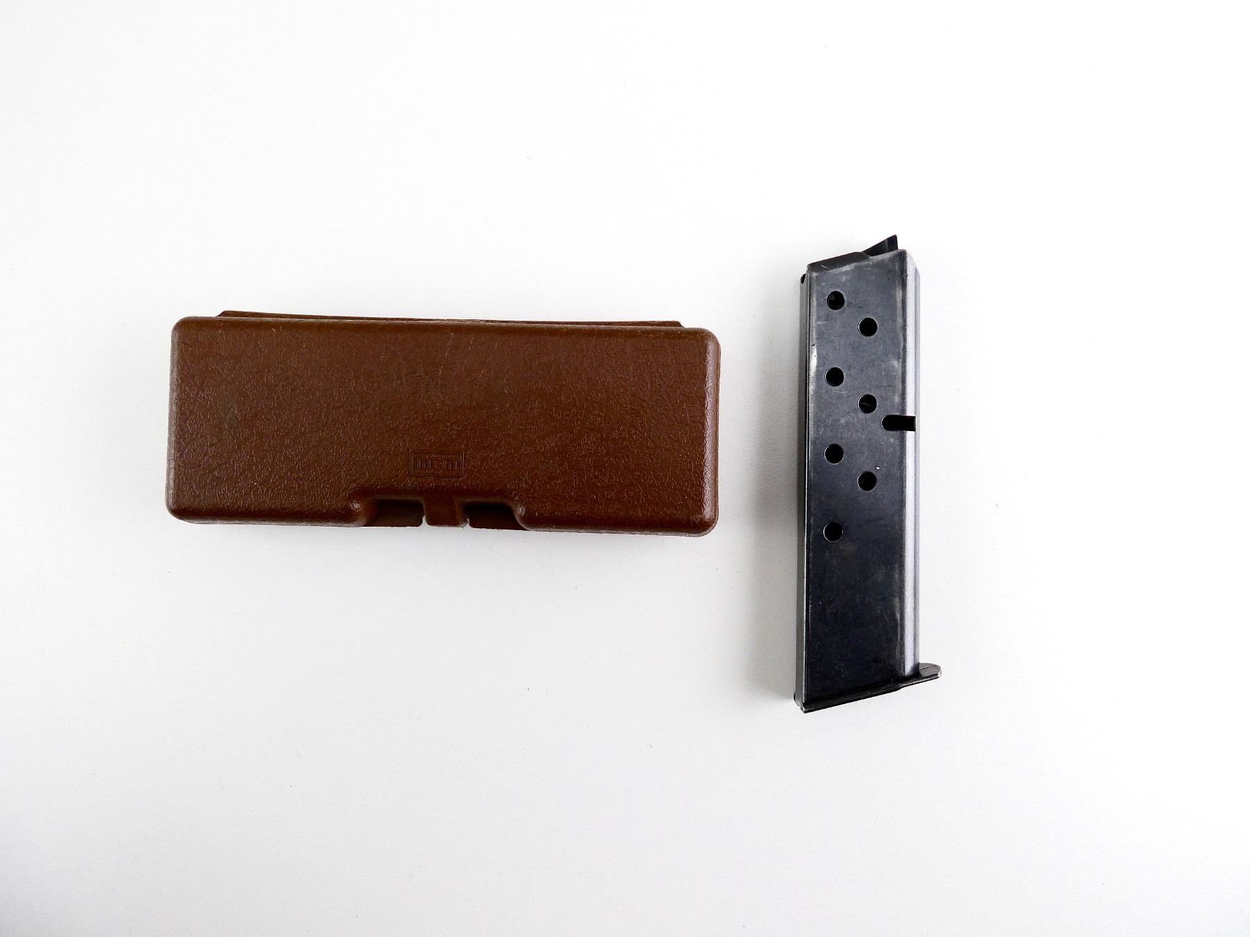 (1) 9MM LUGER MAG, 8 RNDS, BLUED STEEL, BASE MARKED: "S&W", WITH PLASTIC CARRYING CASE. SEE PHOTOS. PAL REQUIRED.