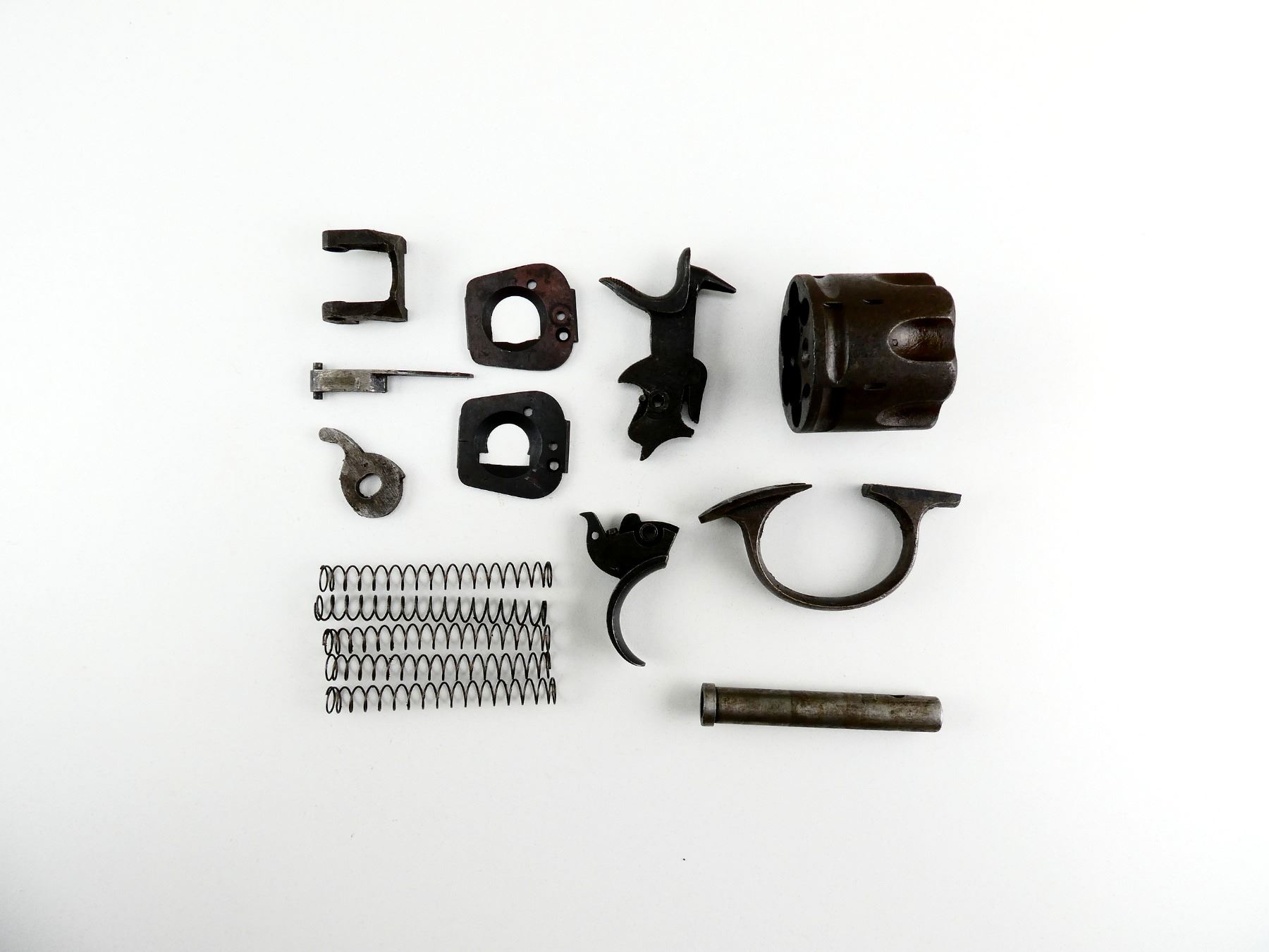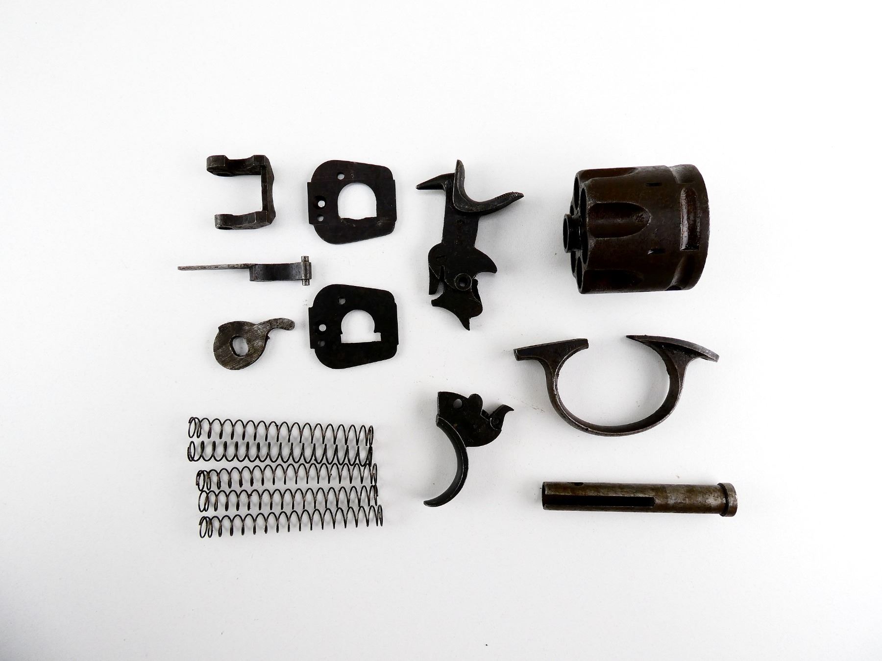 FITS .455 WEBLEY LARGE FRAME, LOT INCLUDES; HAMMER ASSEMBLY, TRIGGER, TRIGGER GUARD, (2) RECOIL PLATES, EXTRACTOR LEVER, CYLINDER CAM, AUXILIARY MAINSPRING, CYLINDER AXIS PIN, (4) EXTRACTOR SPRINGS, (1) .455 CYLINDER, ETC. MAY REQUIRE FITTING. SEE PHOTOS.