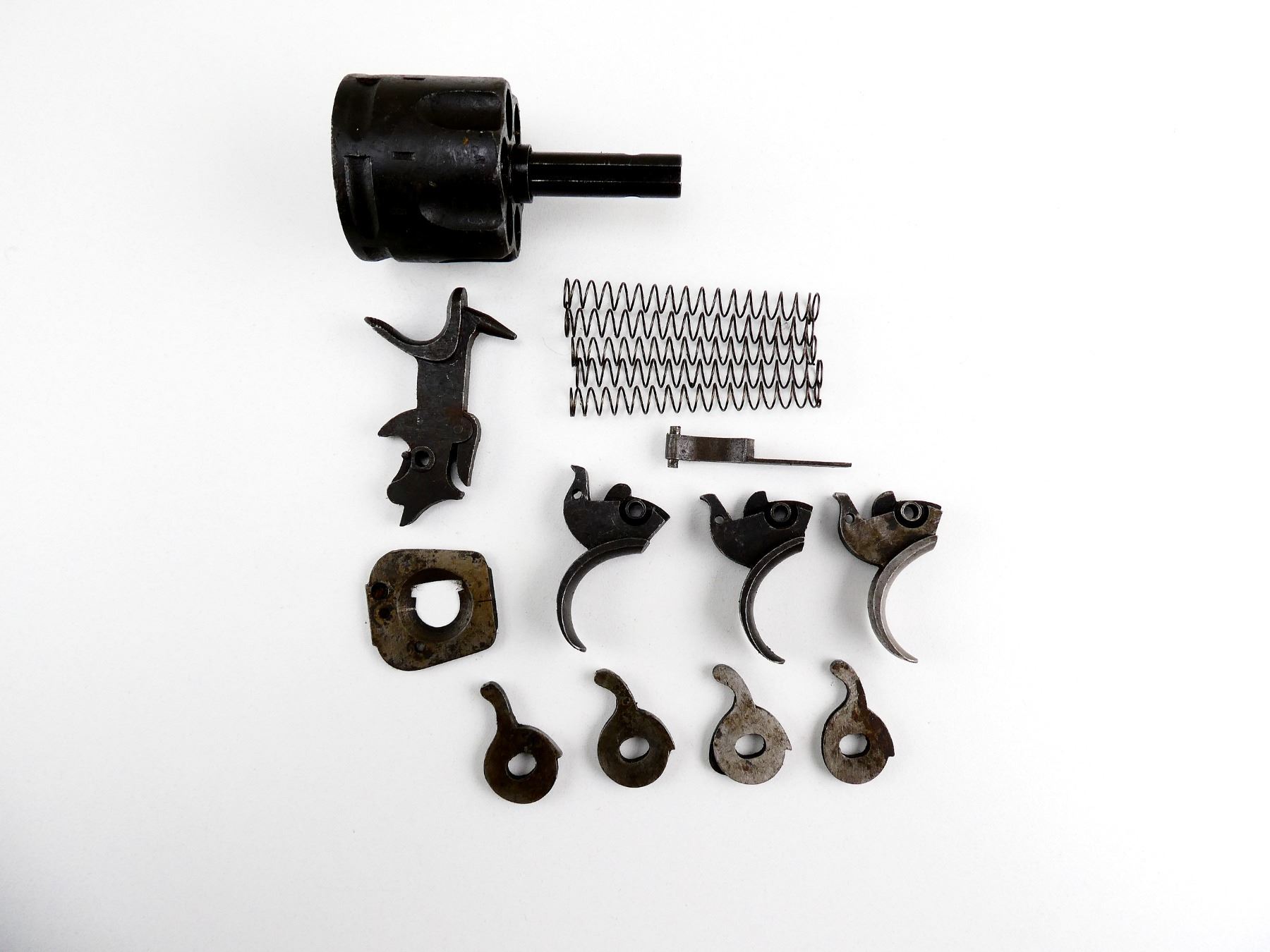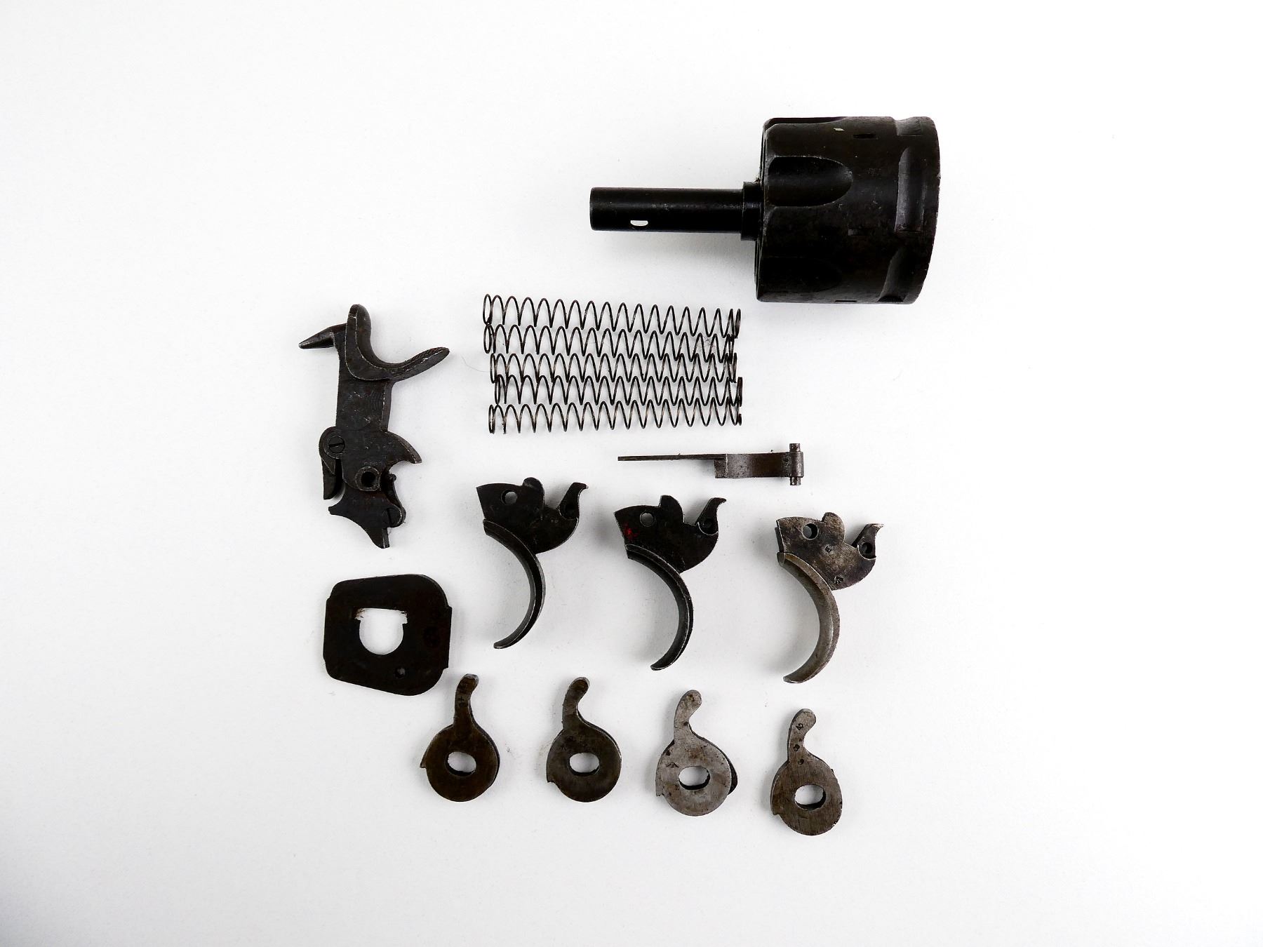 FITS .455 WEBLEY LARGE FRAME, LOT INCLUDES; (3) TRIGGERS, HAMMER ASSEMBLY, HAND, (4) EXTRACTOR LEVERS, (5) EXTRACTOR SPRINGS, CYLINDER WITH AXIS PIN ONLY, ETC. MAY REQUIRE FITTING. SEE PHOTOS.
