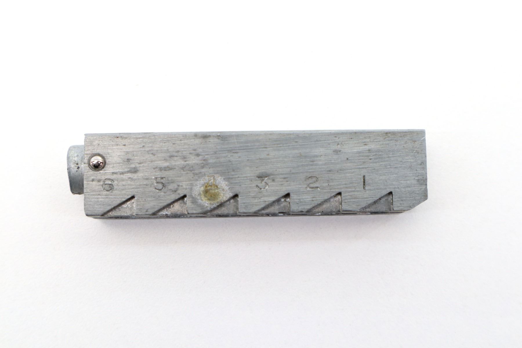 Main Description: Blade front sight, block rear sight, black painted alloy construction. Two piece checkered brown polymer grips. Accessory is: Spare unknown .22 Blank 6 round Extra magazine fits unknown model.