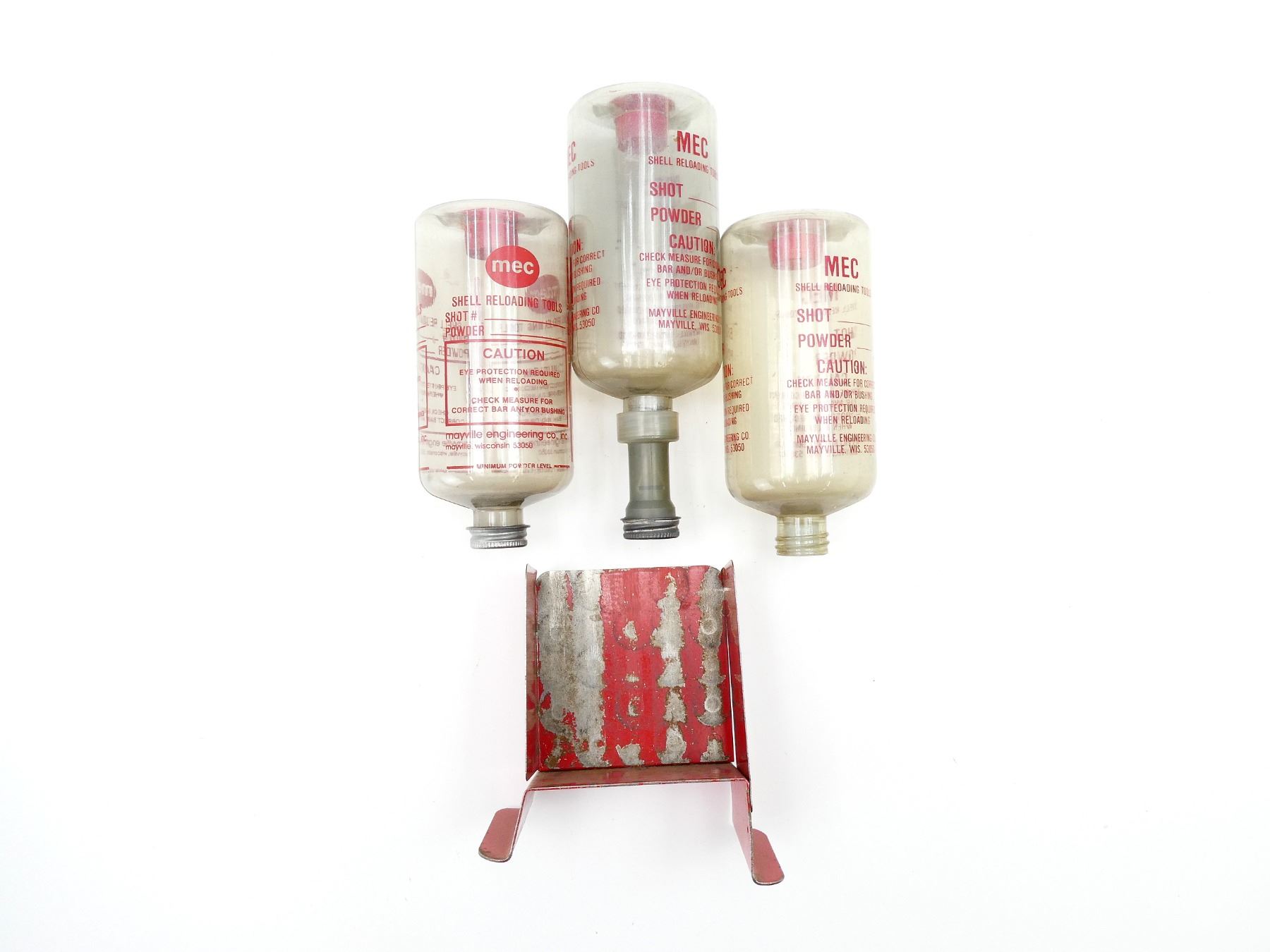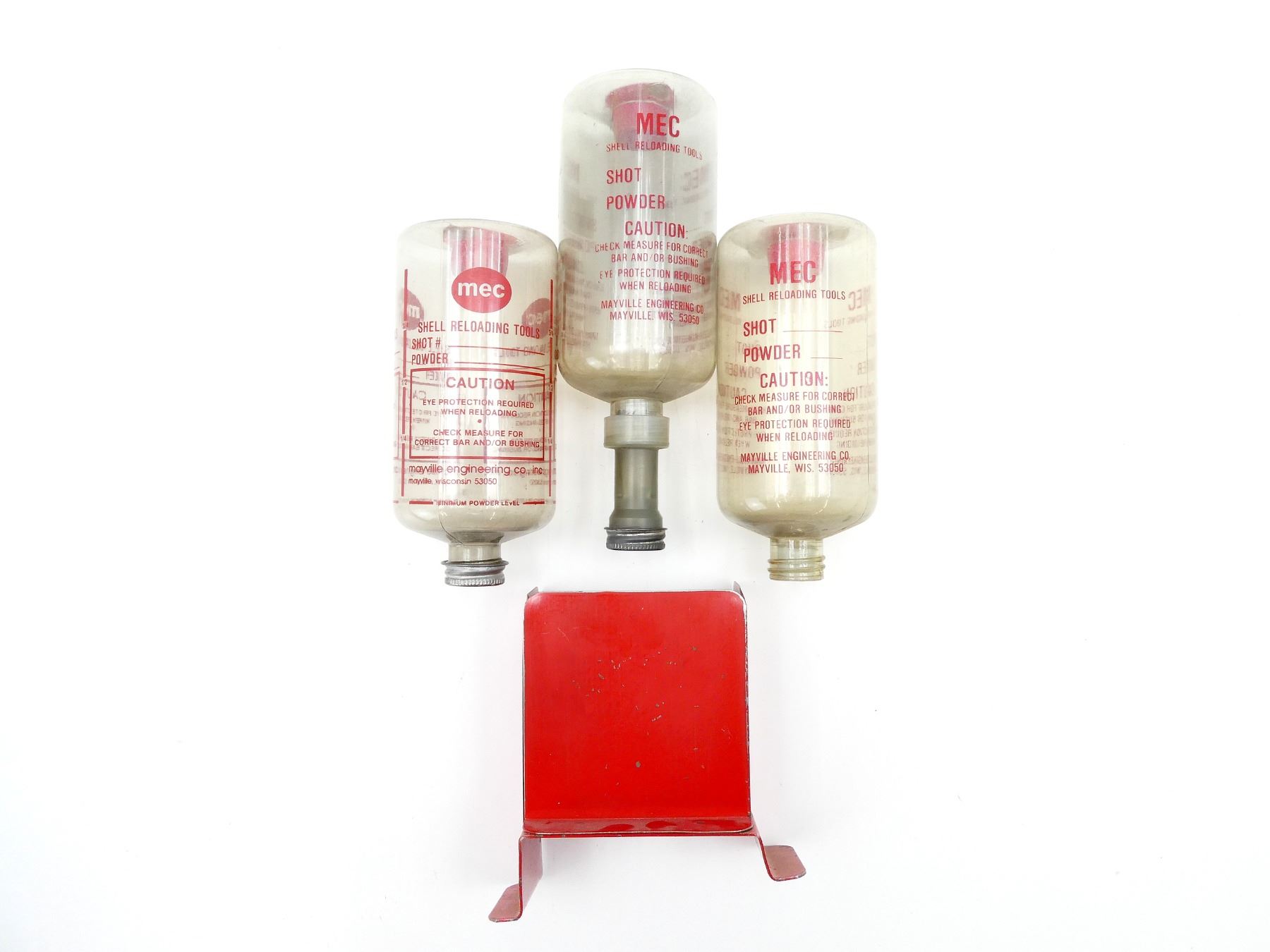 LOT INCLUDES; (3) SHOT / POWDER BOTTLES, TWO WITH LIDS, ONE WITHOUT & (1) E-Z PAK SHOTSHELL PACKER, FITS 12 G. SHELLS, RED STEEL, VARIOUS MARKINGS. SEE PHOTOS.
