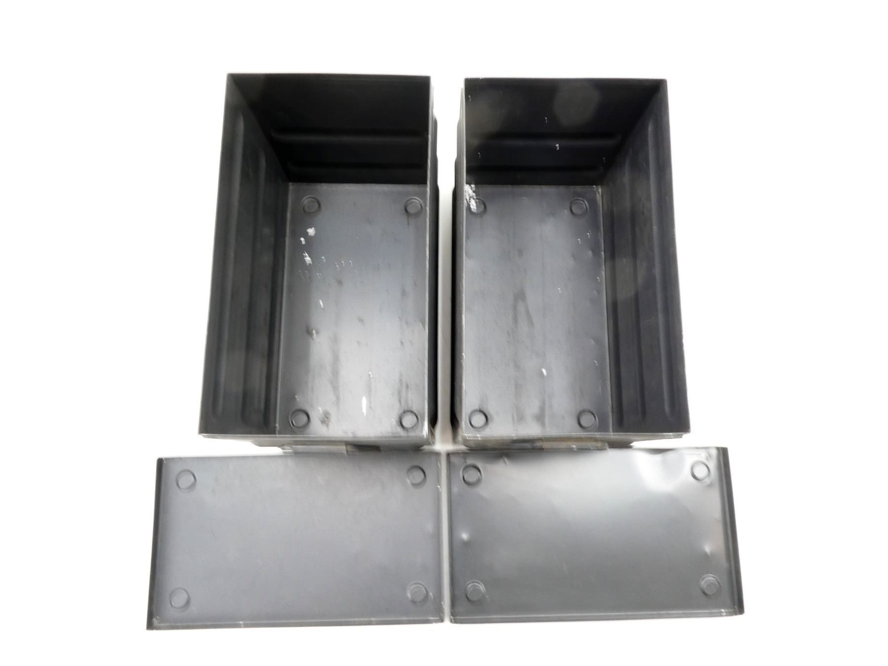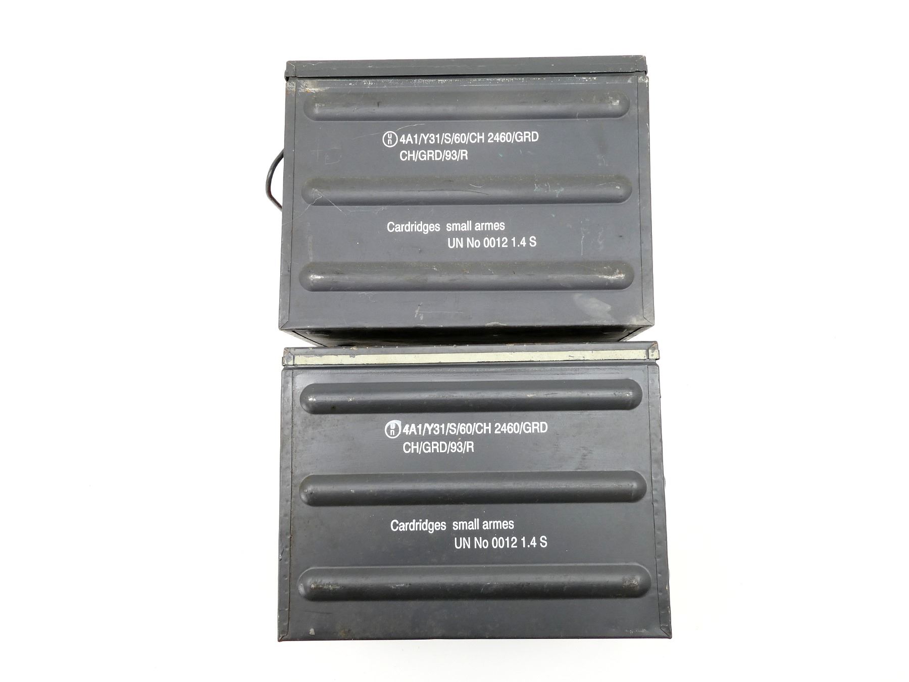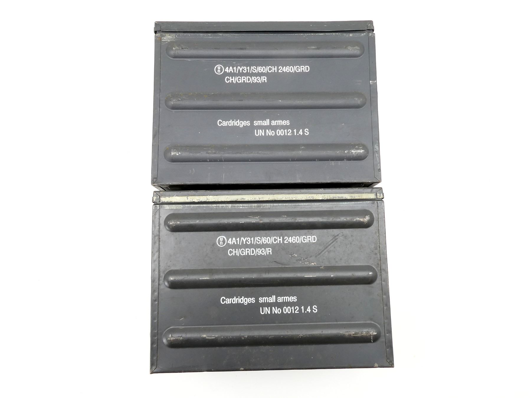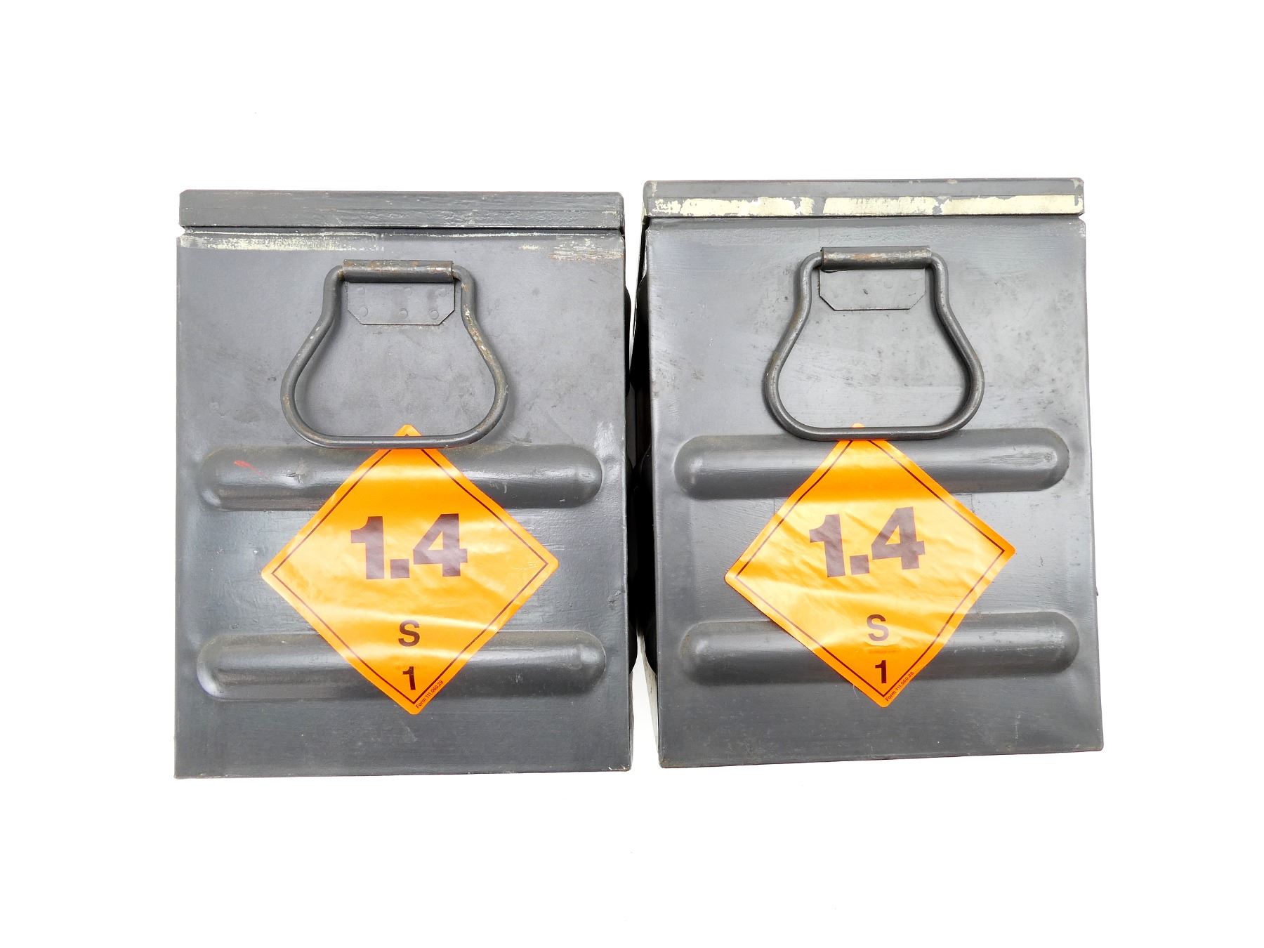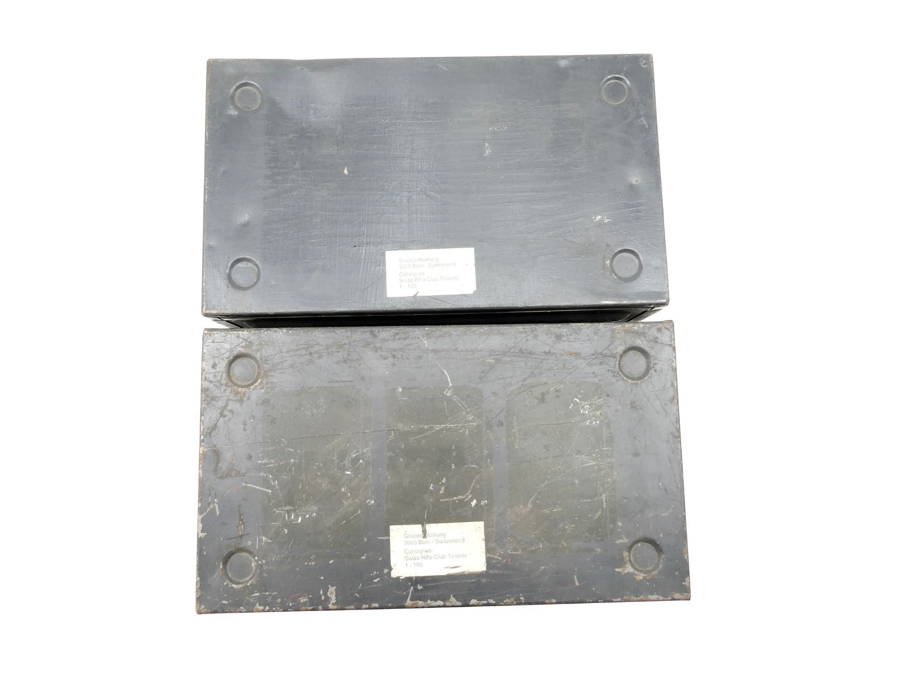 LOT INCLUDES; (2) GREY PAINTED METAL AMMO TINS, VARIOUS MARKINGS, APPROX. 14.5" 8 3/8" X 11". SEE PHOTOS.