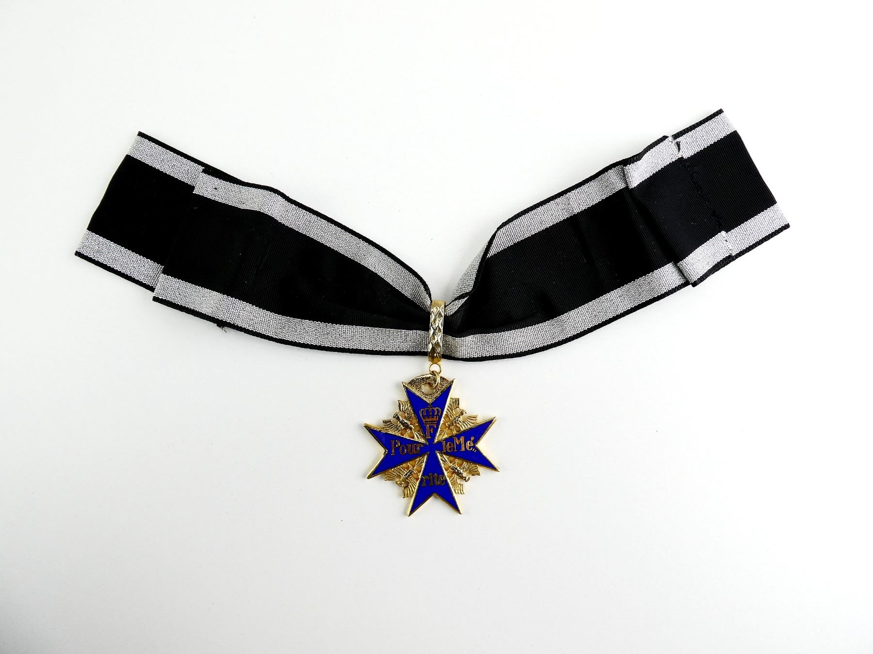 (1) REPRODUCTION POUR LE MERITE, ALSO KNOWN AS BLAUER MAX (GERMAN) OR BLUE MAX MEDAL WITH RIBBON, MEDAL MARKED: CROWN OVER "F", "POUR LEMERITE". SEE PHOTOS.
