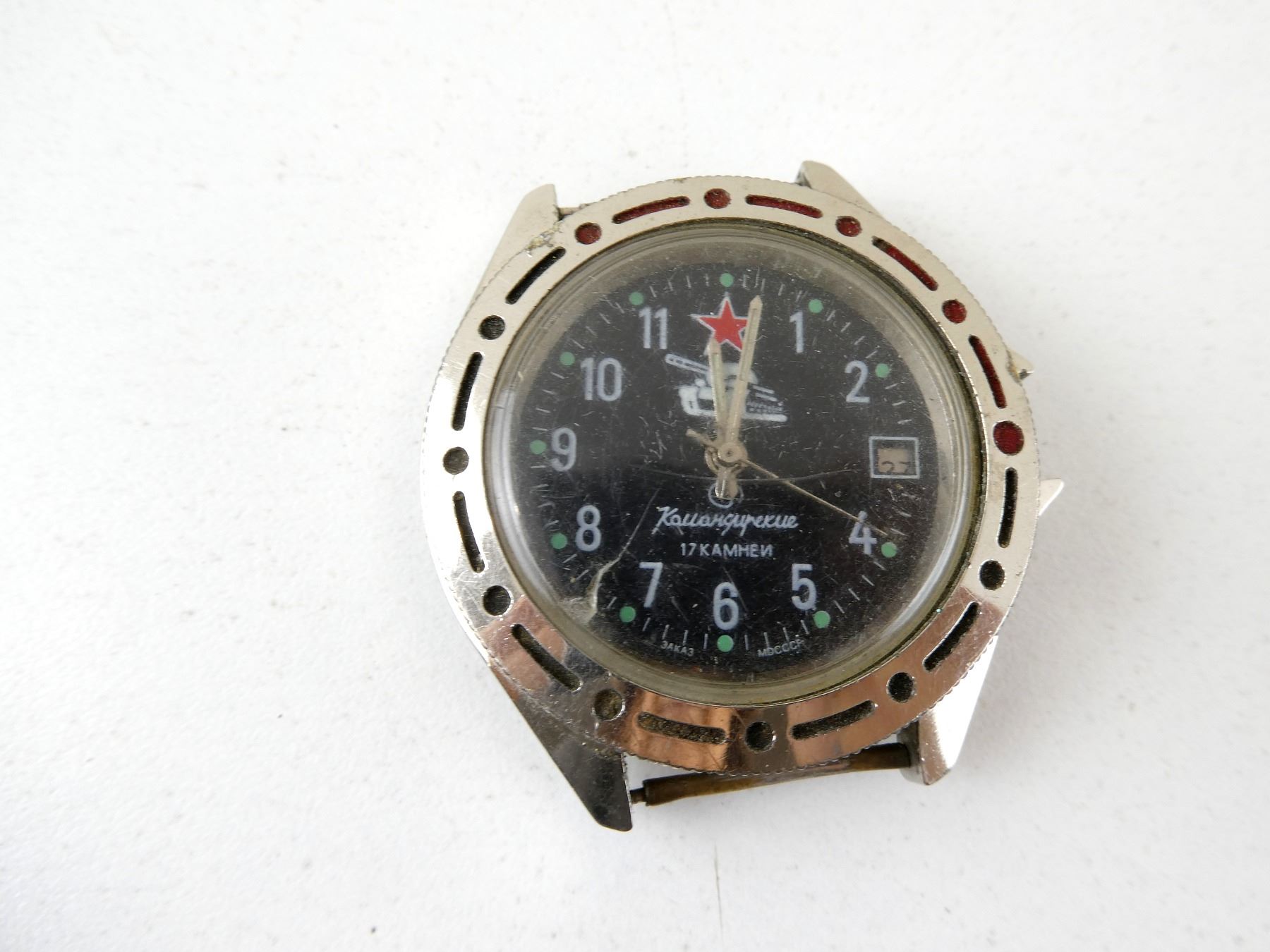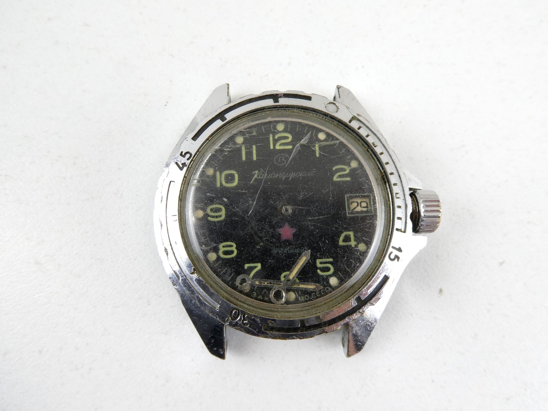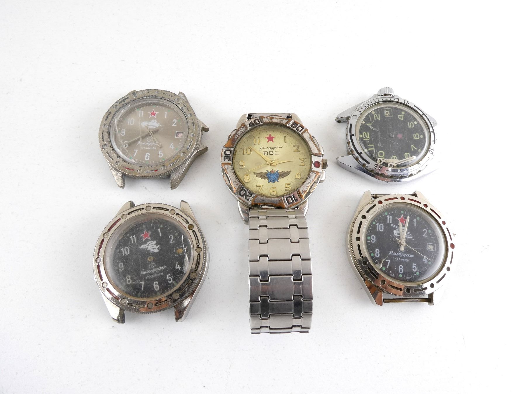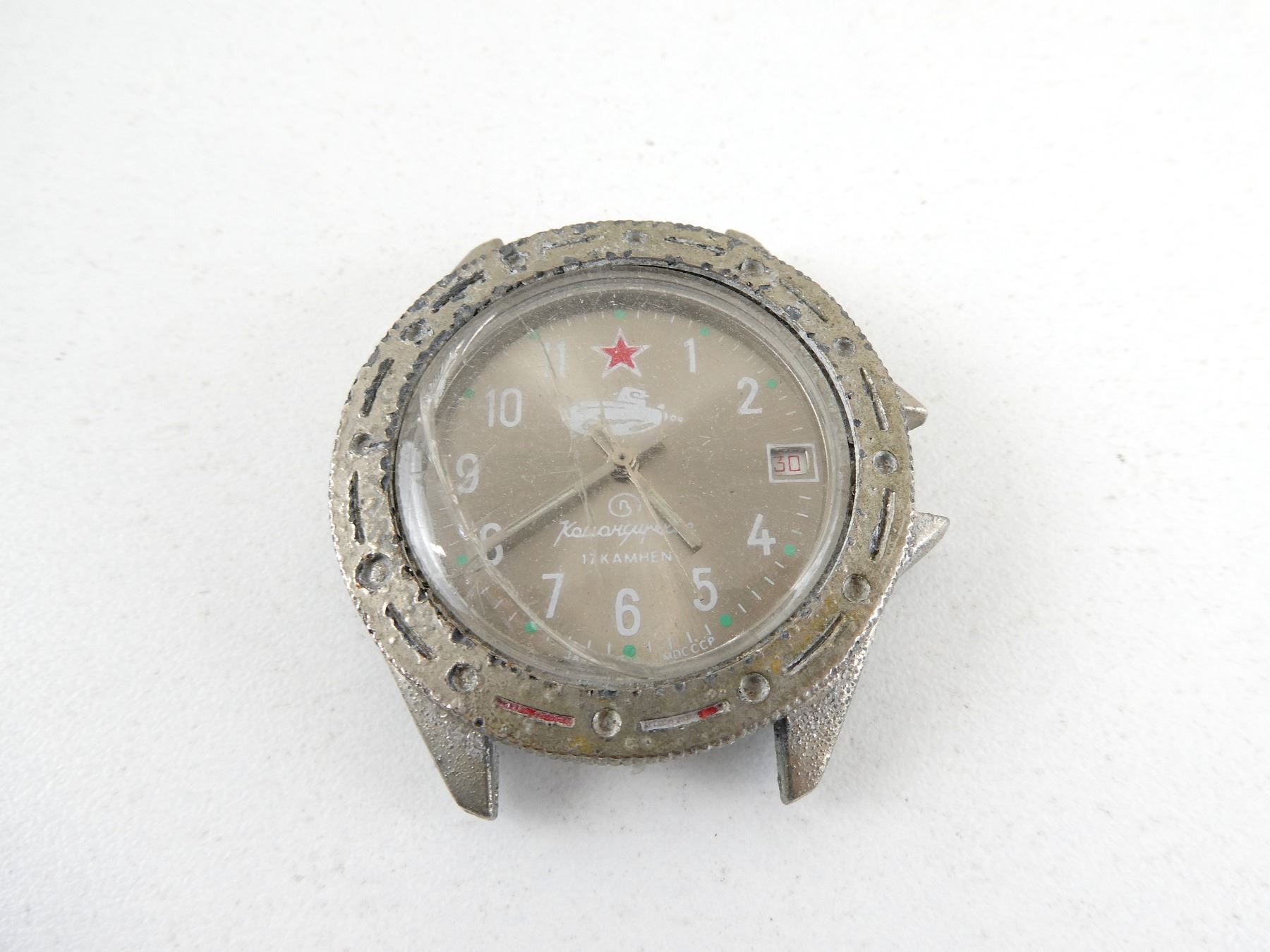 LOT INCLUDES; (5) VOSTOK KOMANDIRSKIE MECHANICAL WRISTWATCHES, CONSIGNOR STATES: "CAPTURED BY UKRAINIAN FORCES FROM RUSSIAN FORCES DURING ON-GOING RUSSO-UKRAINIAN WAR", FOUR HAVE CHIPPED / CRACKED WATCH FACES, ONLY ONE HAS WRIST BAND, TWO HAVE BROKEN / MISSING CLOCK HANDS, VARIOUS MARKINGS, UN-TESTED, ALL SHOW WEAR / TEAR. SEE PHOTOS.