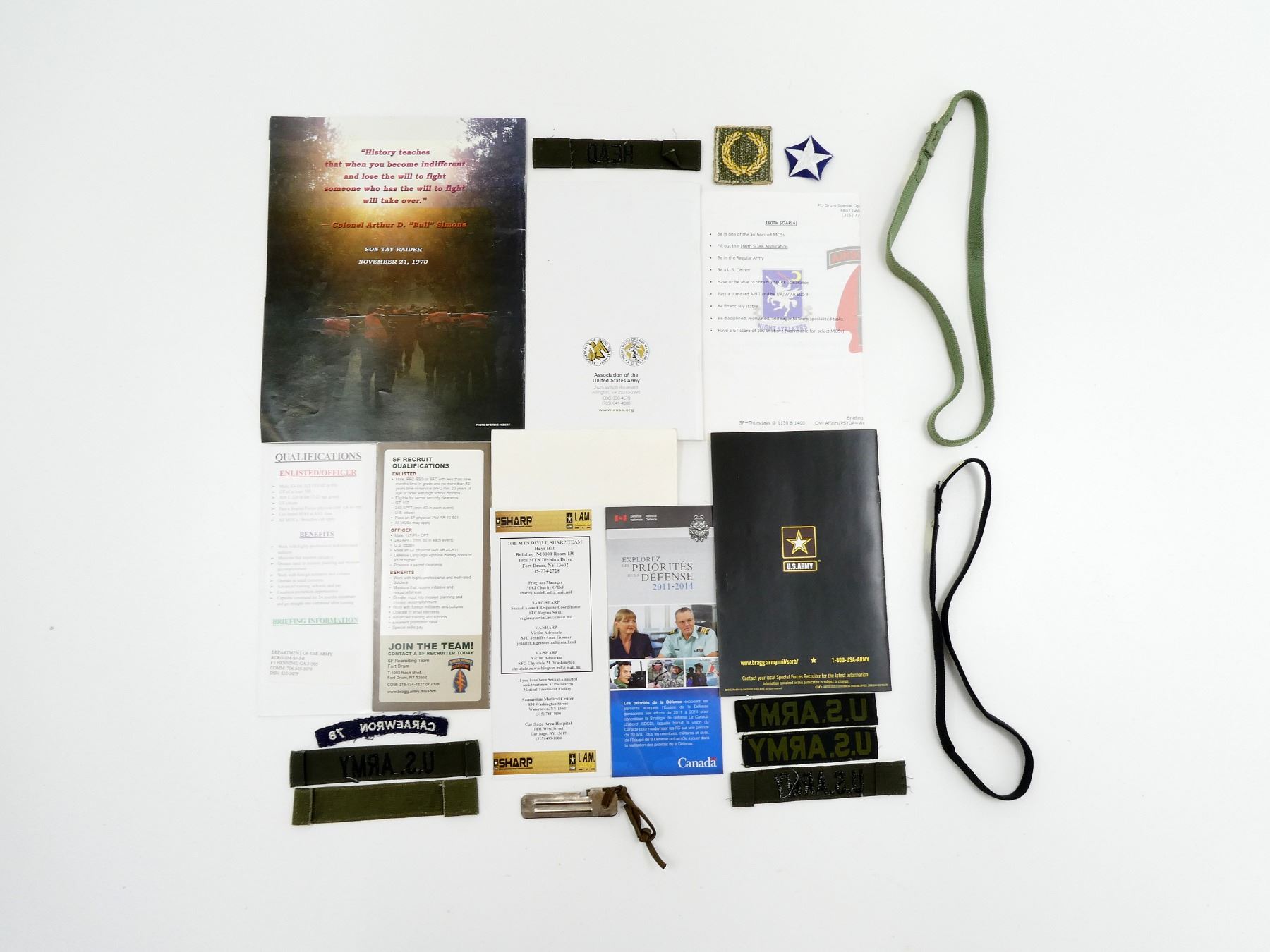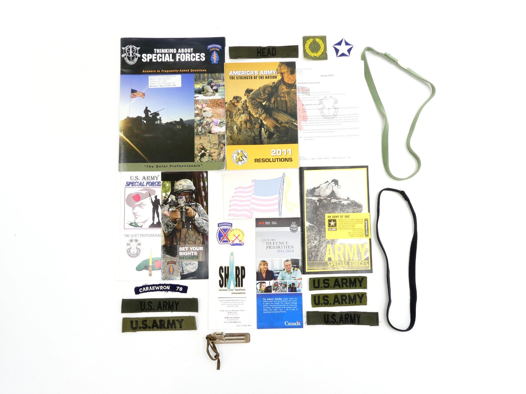 APPROX. (21) PIECES, INCLUDES; "AMERICA'S ARMY: THE STRENGTH OF THE NATION, 2011 RESOLUTIONS" BOOKLET, "U.S. ARMY SPECIAL FORCES" PAMPHLET, "SET YOUR SIGHTS HIGHER" SPECIAL FORCES AIRBORNE PAMPHLET, AMERICAN FLAG STICKER / DECAL, CAN OPENER MARKED: "MADE IN CANADA", FIVE U.S. ARMY BREAST BADGES, STAR BADGE, CARAEWRON 78 BADGE, HEAD BADGE, ETC. SEE PHOTOS.