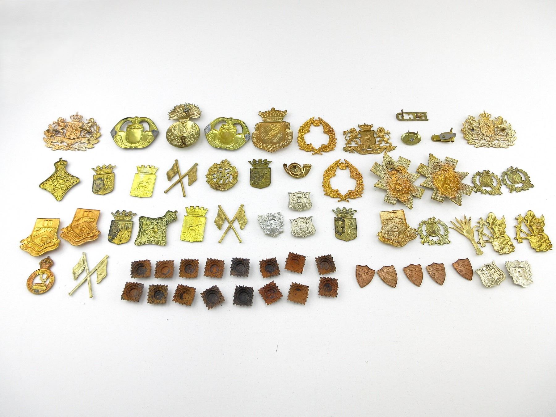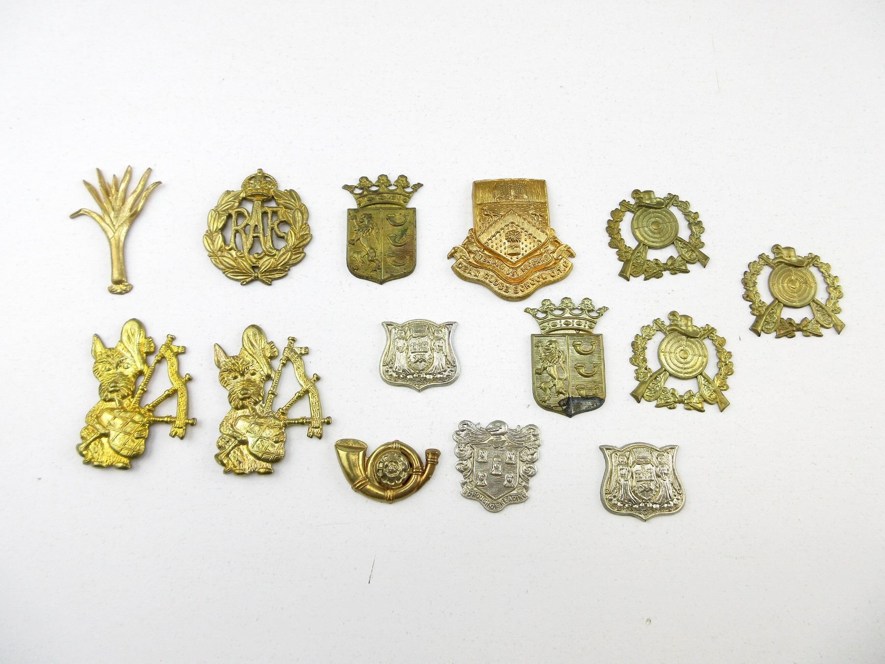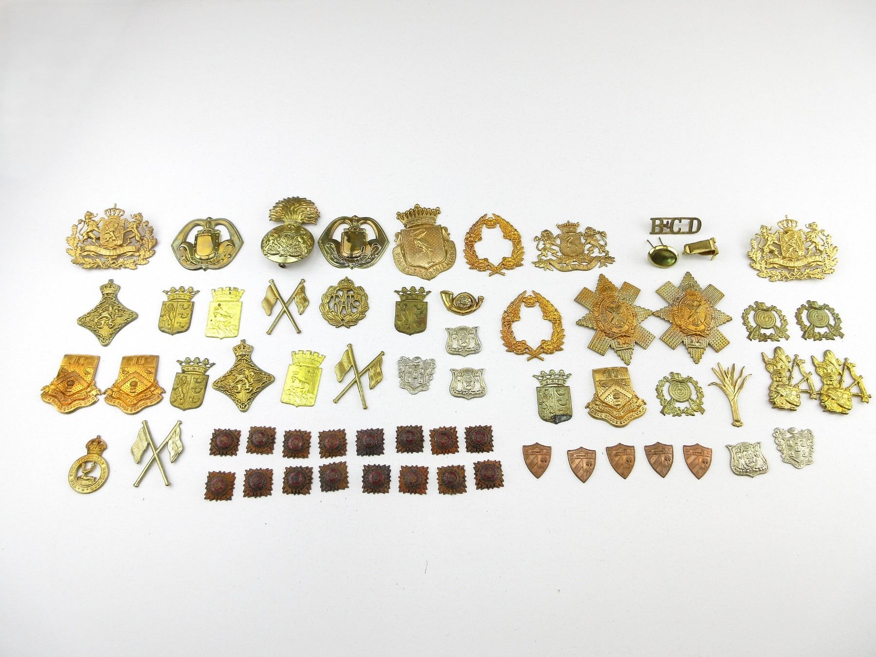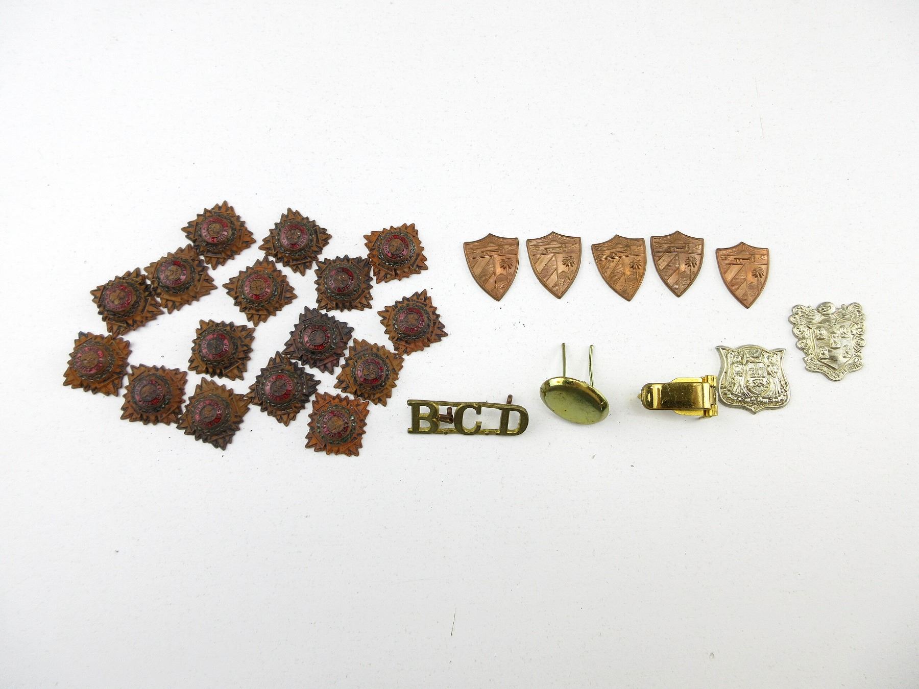 APPROX. (61) PIECES, INCLUDES; RANK PIPS, BLACK WATCH BADGES, RAF BADGE, DEAN CLOSE SCHOOL O.T.C. BADGES, MARKSMANSHIP BADGES, THE HERTFORDSHIRE REGIMENT BADGE, BOROUGH OF READING COAT OF ARMS BADGES, DUTCH ARMY INFANTRY BADGES, COAT OF ARMS OF NETHERLANDS BADGES, ETC. SEE PHOTOS.