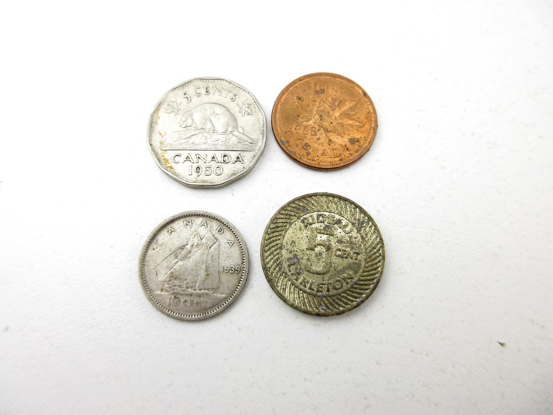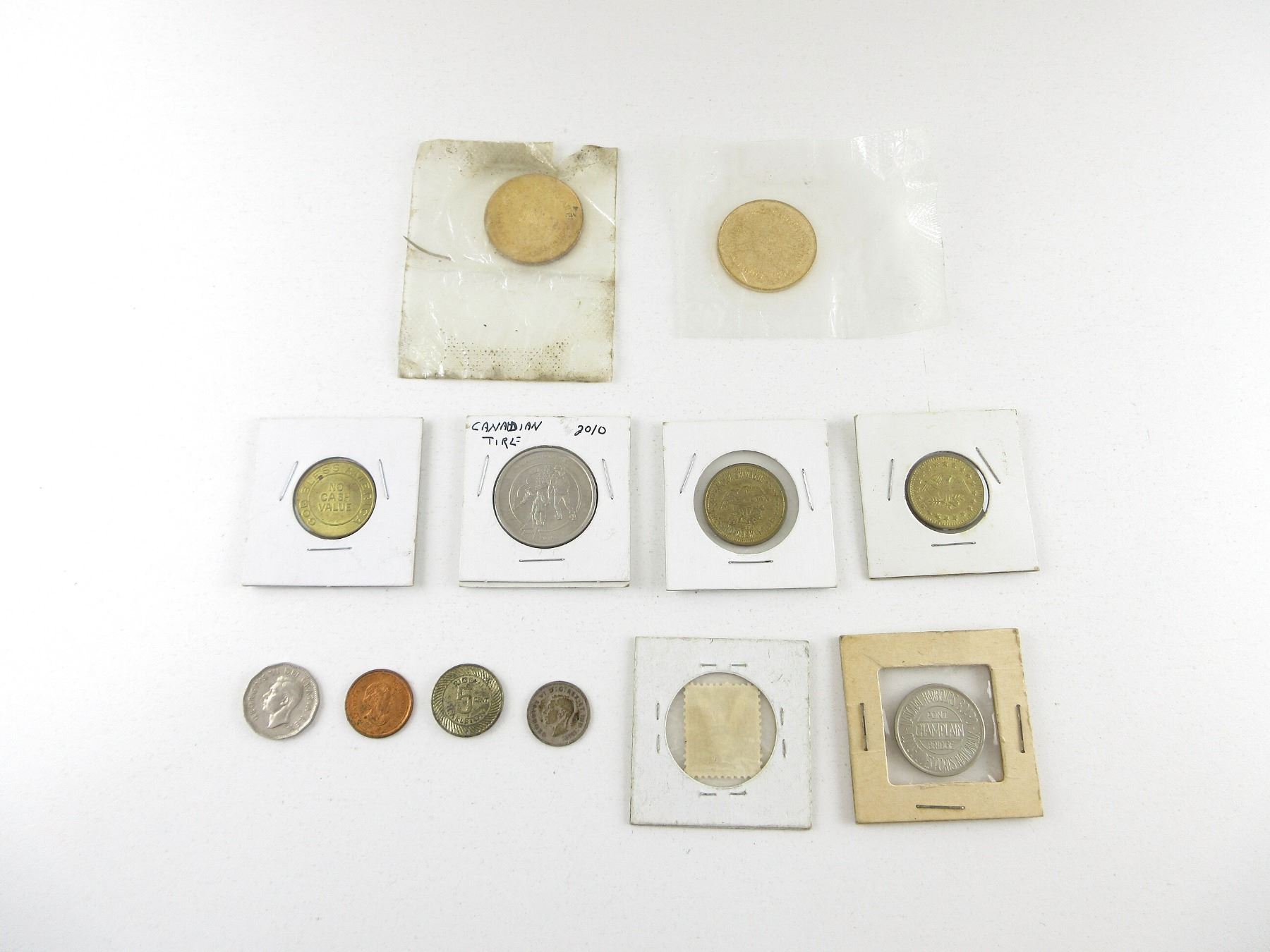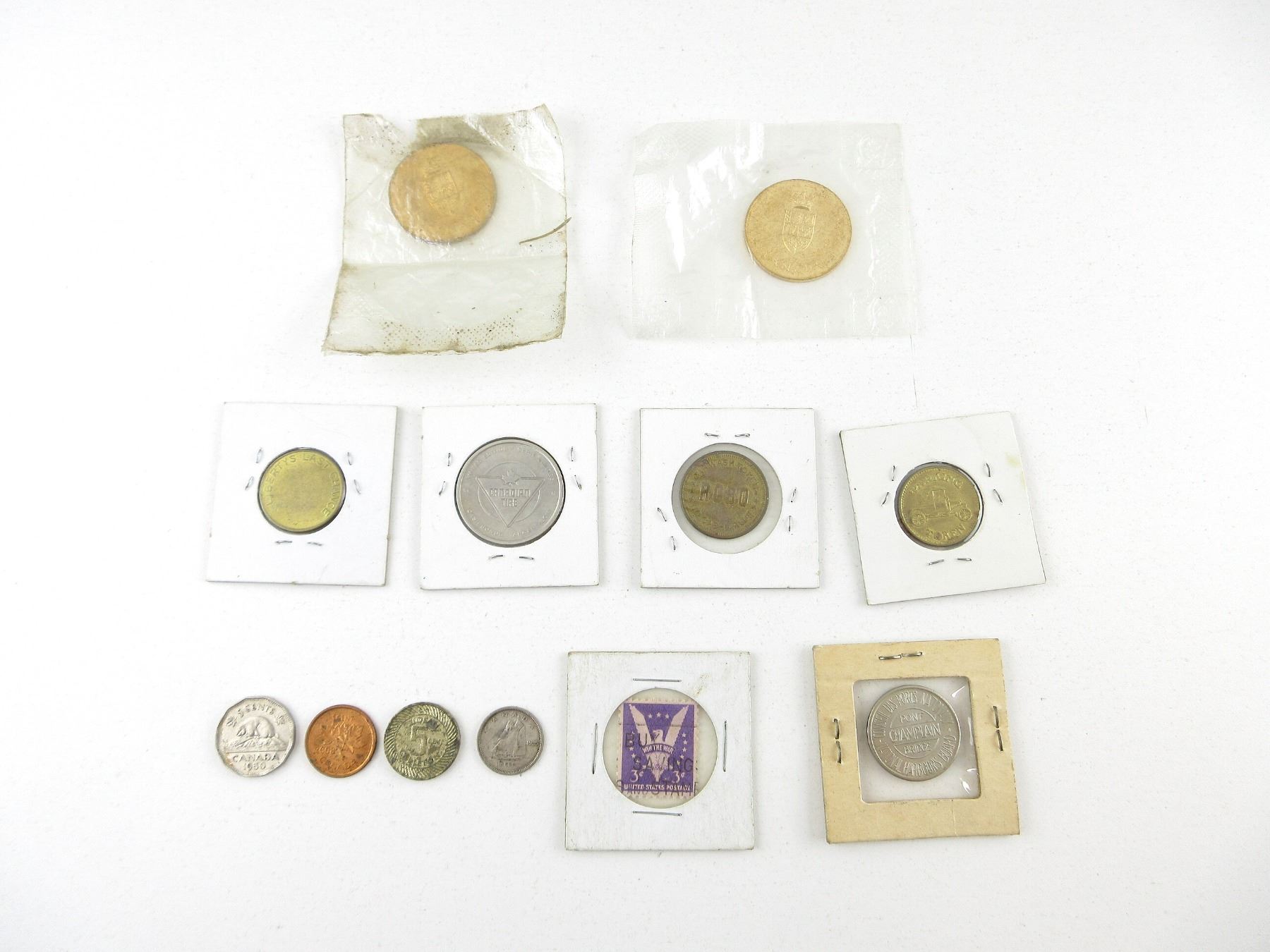 LOT INCLUDES; (2) COMMEMORATIVE CONFEDERATION 1867-1967 COINS, NOS, (2) U.S. TOKENS, CAR WASH / PARKING, (1) 2010 CANADIAN TIRE COIN, (1) U.S. NO CASH VALUE COIN, VARIOUS MARKINGS, (1) NATIONAL HARBOURS BOARD, PONT CHAMPLAIN BRIDGE COIN, (3) CANADIAN COINS, PENNY DATED: "2008", NICKEL DATED: "1950", DIME DATED: "1939", (1) U.S. STAMP MARKED: "WIN THE WAR" & (1) RIDEAU CARLTON 5 CENT COIN. SEE PHOTOS.