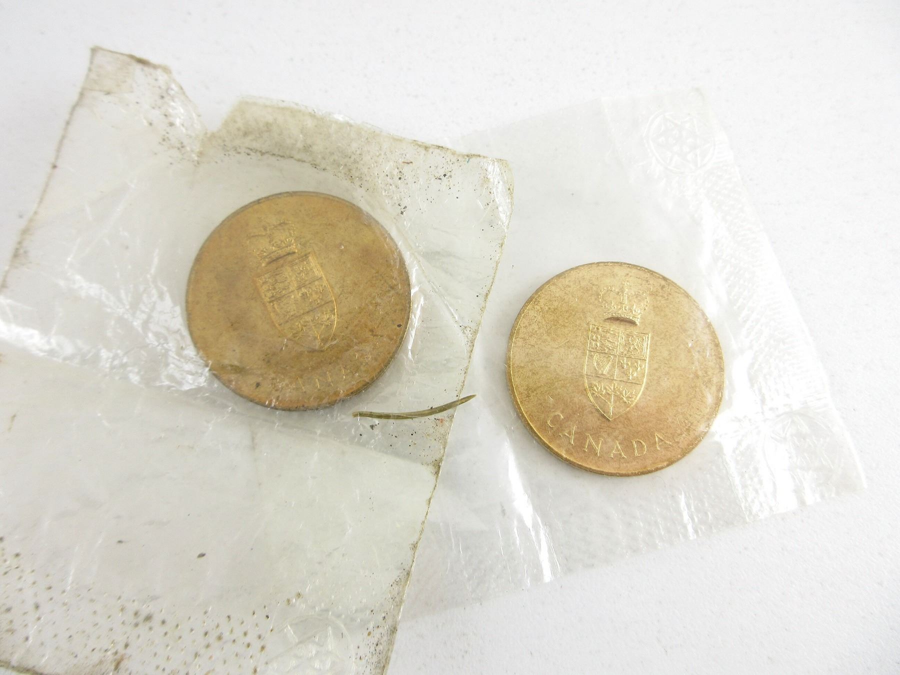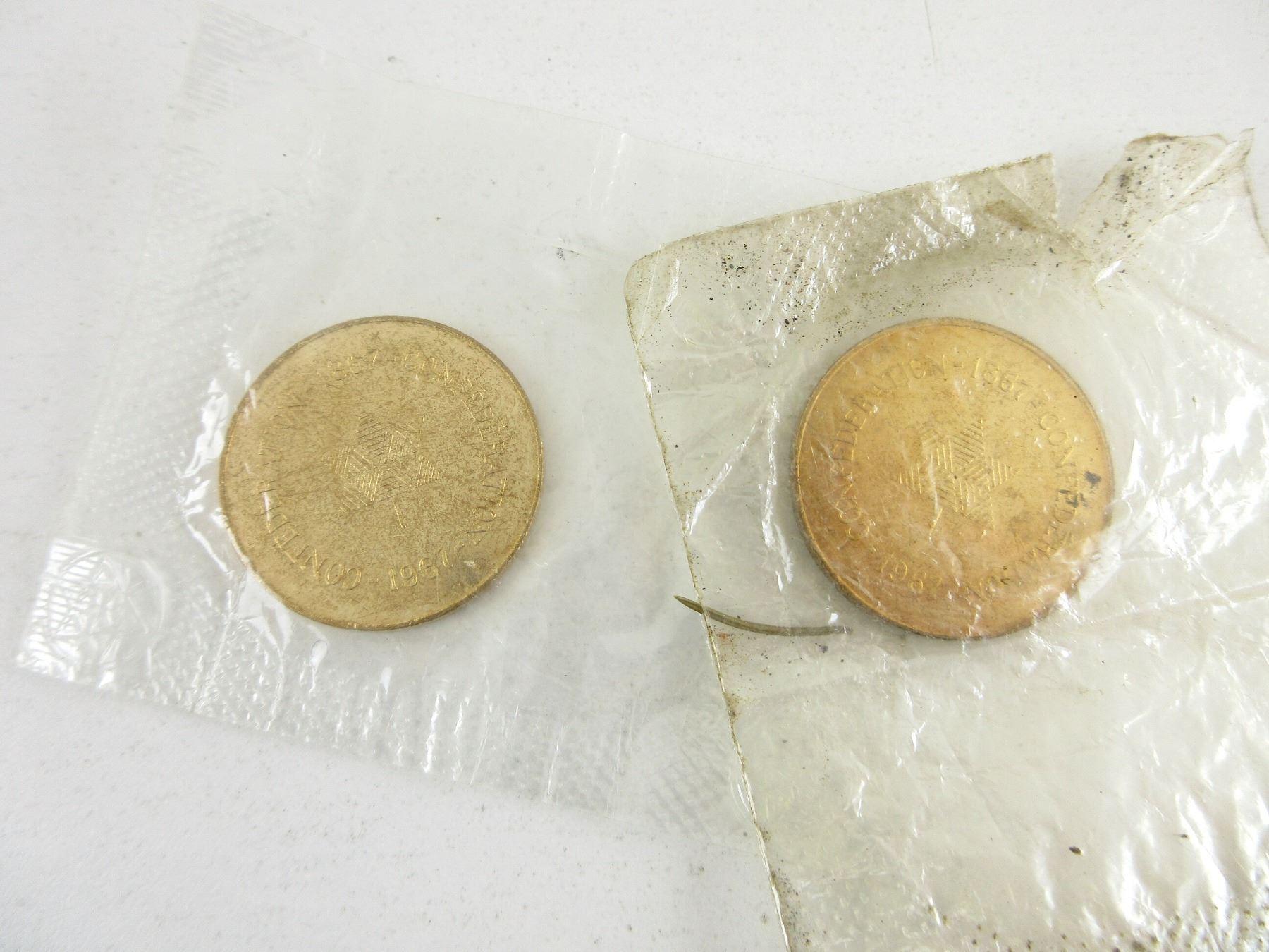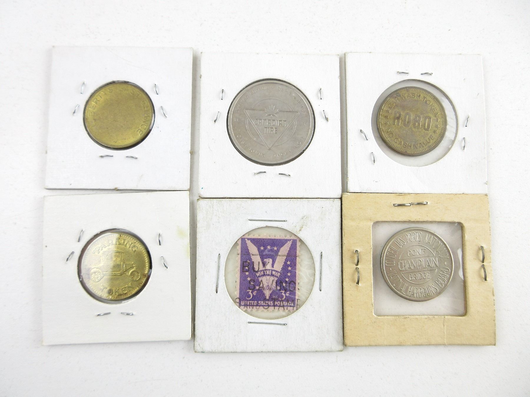 LOT INCLUDES; (2) COMMEMORATIVE CONFEDERATION 1867-1967 COINS, NOS, (2) U.S. TOKENS, CAR WASH / PARKING, (1) 2010 CANADIAN TIRE COIN, (1) U.S. NO CASH VALUE COIN, VARIOUS MARKINGS, (1) NATIONAL HARBOURS BOARD, PONT CHAMPLAIN BRIDGE COIN, (3) CANADIAN COINS, PENNY DATED: "2008", NICKEL DATED: "1950", DIME DATED: "1939", (1) U.S. STAMP MARKED: "WIN THE WAR" & (1) RIDEAU CARLTON 5 CENT COIN. SEE PHOTOS.
