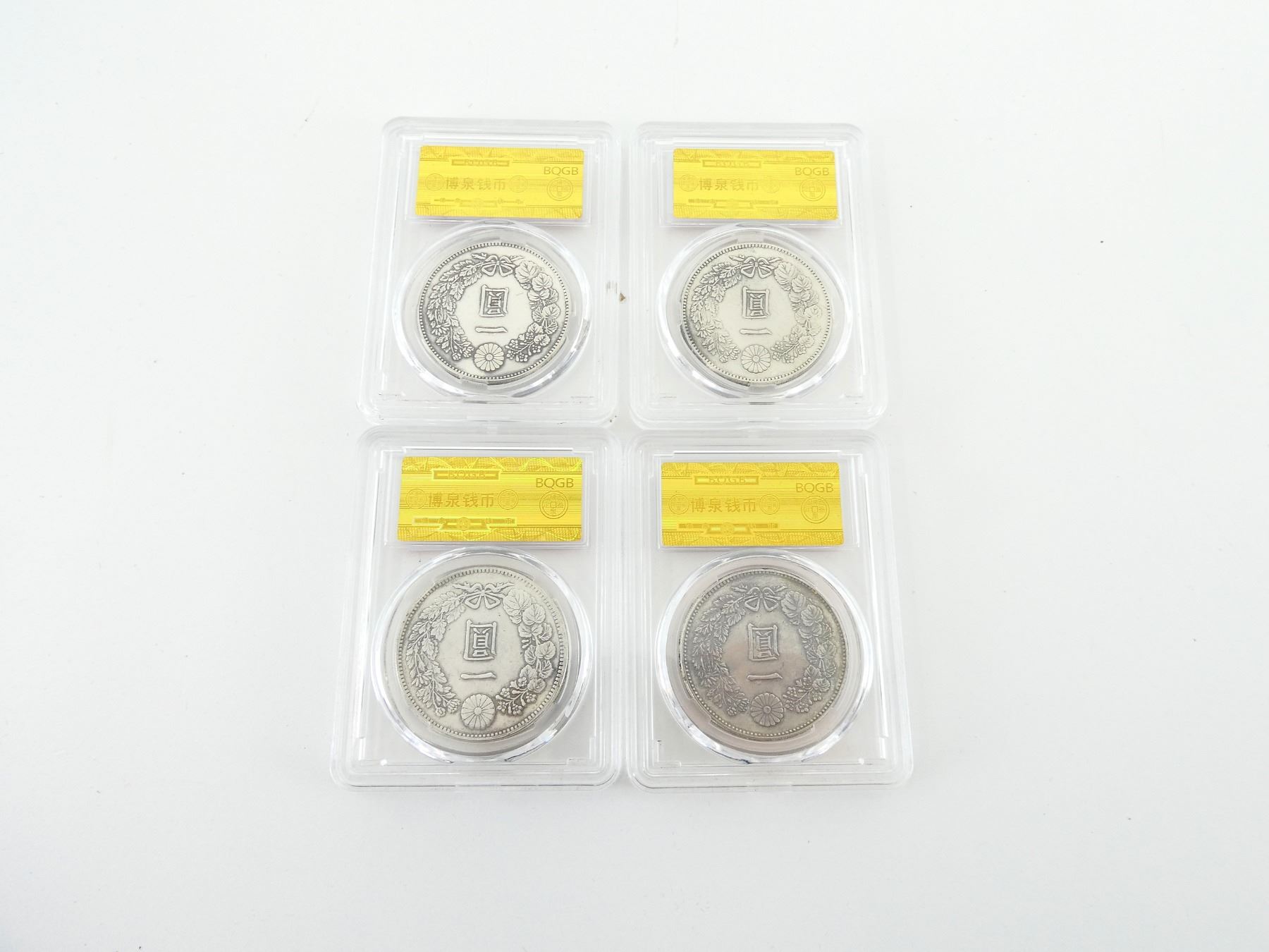 APPROX. (40) COINS IN PLASTIC COVERS, CONSIGNOR STATES: "A COMPLETE CASE OF 40 CHINESE CIRCULATED JAPANESE COINS, CIRCA EARLY 20TH CENTURY", COINS DATING FROM 1870 TO 1914, SOME DATES MISSING / SOME DUPLICATE DATES, INFORMATION / HISTORY SHEET INSIDE CASE, SAMPLE TEMPLATE CHART WITH EACH COIN LISTED, GREEN CASE APPROX. 13.5" X 9.5" X 3.5". SEE PHOTOS.