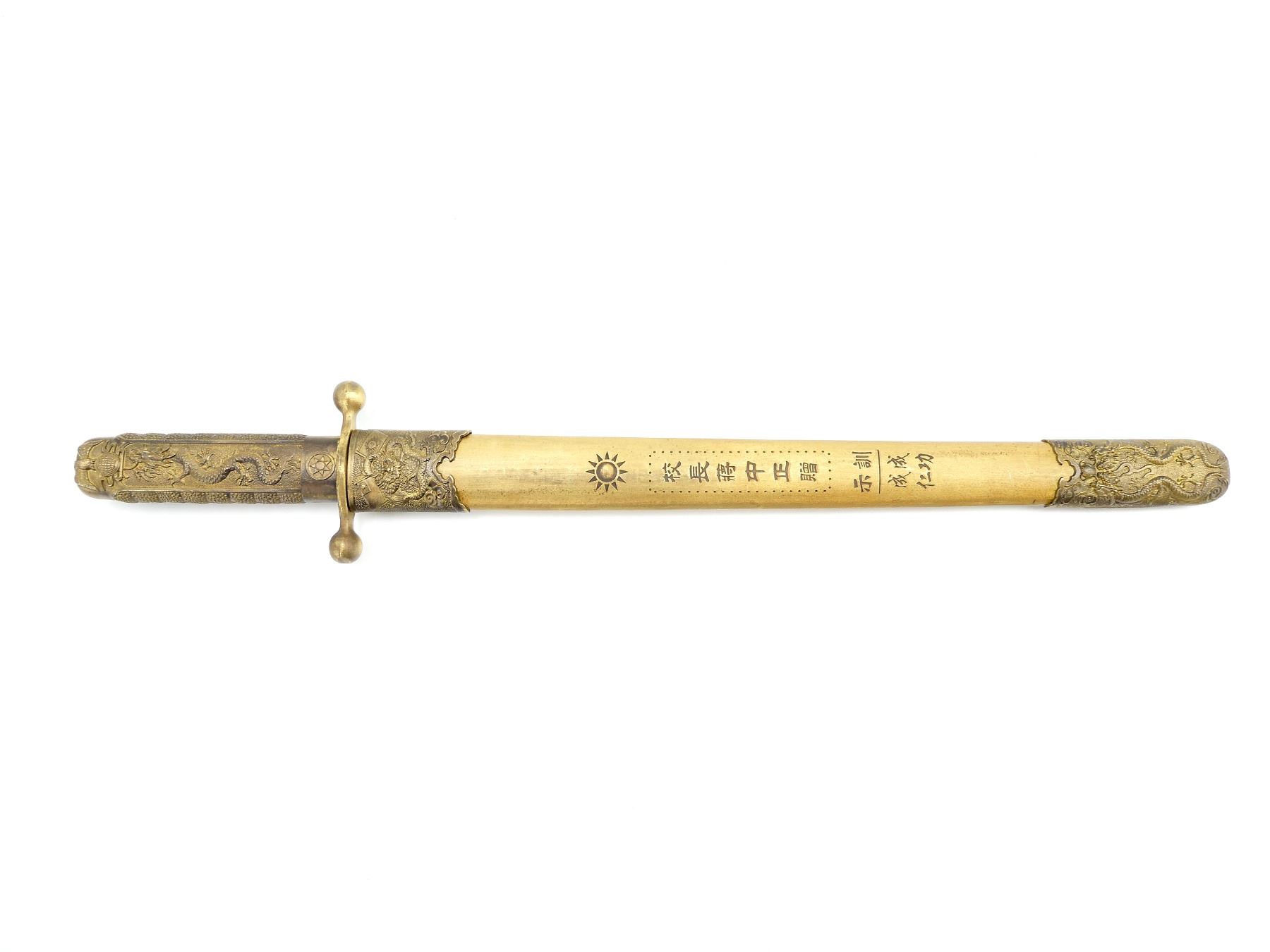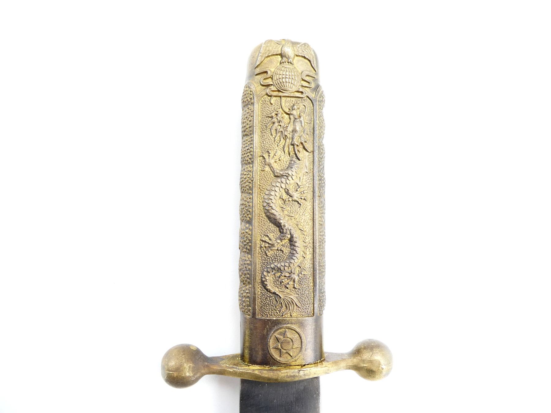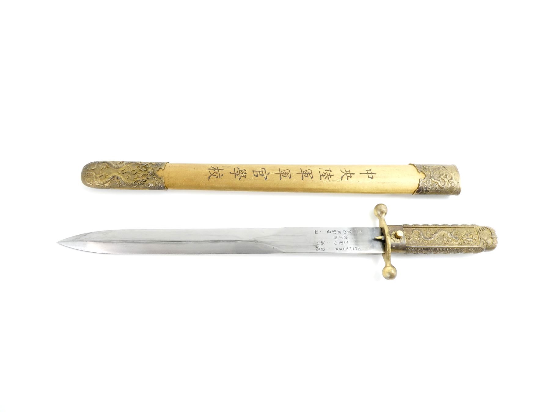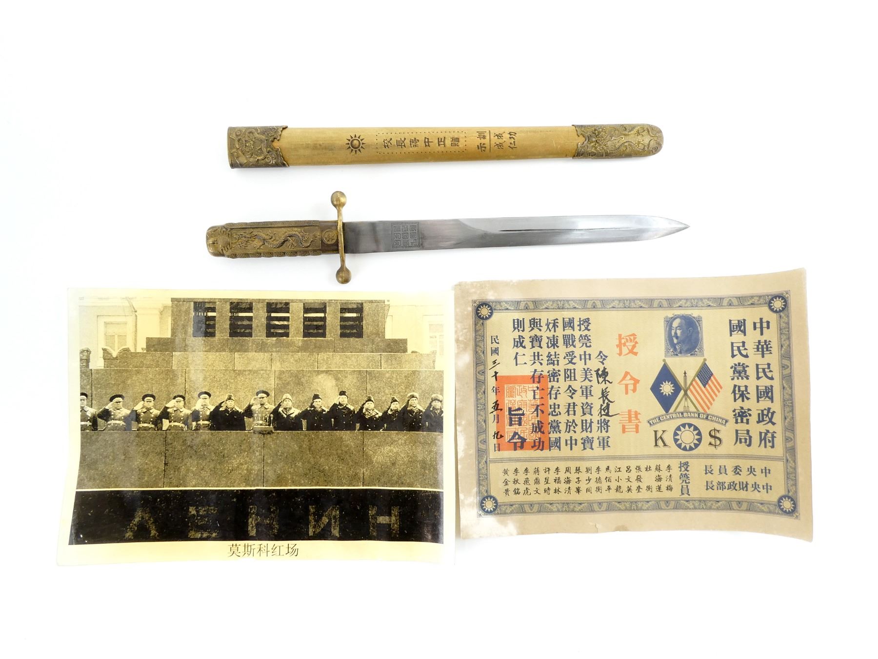 LOT INCLUDES; (1) DOUBLE-EDGED DAGGER, RICASSO MARKED WITH VARIOUS CHINESE CHARACTERS ON EITHER SIDE & "AK083176", BRASS CROSS-GUARD, GRIP & POMMEL, SCABBARD RELEASE BUTTON WITH SUN DESIGN, DECORATIVE DRAGON DESIGN ON EITHER SIDE OF GRIP, DECORATIVE GLOBE WITH EAGLE DESIGN ON POMMEL, PEBBLING ON GRIP, BRASS SCABBARD WITH BRASS ENDS, VARIOUS CHINESE CHARACTERS ON EITHER SIDE OF SCABBARD, DECORATIVE DRAGON WITH FLAGS ON THROAT END, DECORATIVE DRAGON DESIGNS ON TIP, BLADE APPROX. 11 3/8", OAL APPROX. 15 5/8", (1) BLACK / WHITE PHOTO OF VARIOUS CHINESE SOLDIERS MEETING WITH ANOTHER MILITARY GROUP, VARIOUS CHINESE CHARACTERS ALONG BOTTOM OF PHOTO & (1) DOCUMENT MARKED: "THE CENTRAL BANK OF CHINA" WITH CHINESE / AMERICAN FLAGS, VARIOUS CHINESE CHARACTERS. SEE PHOTOS.