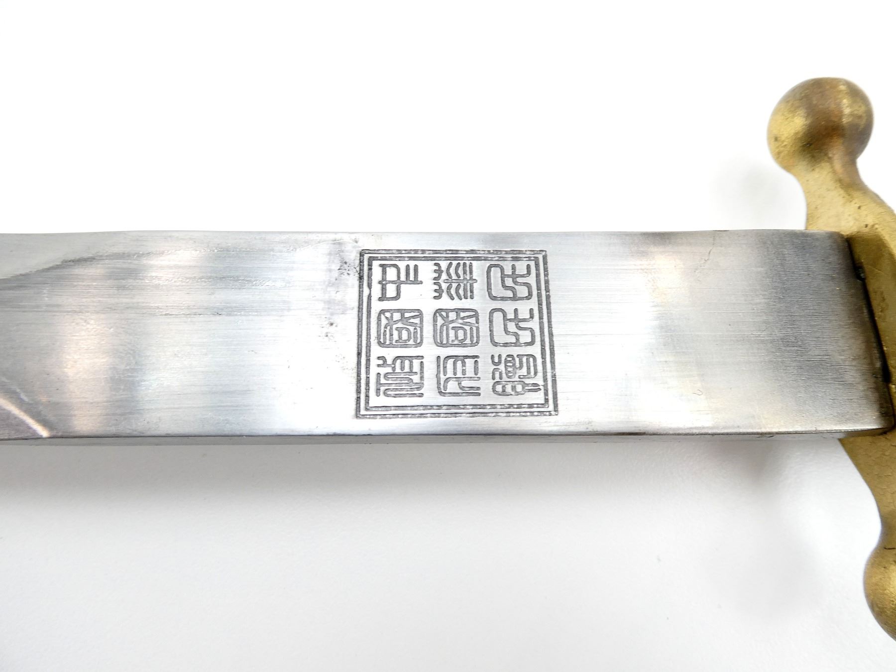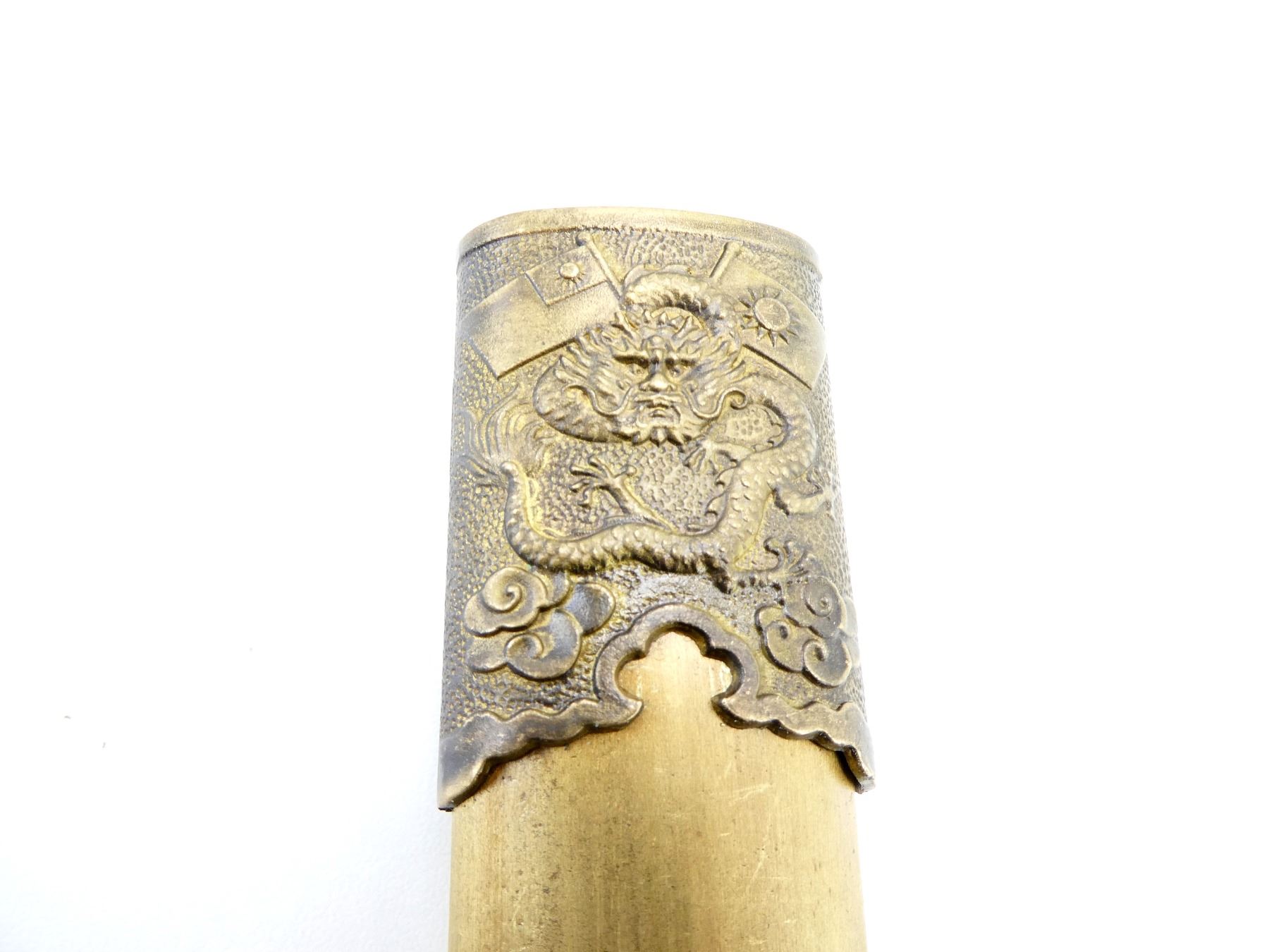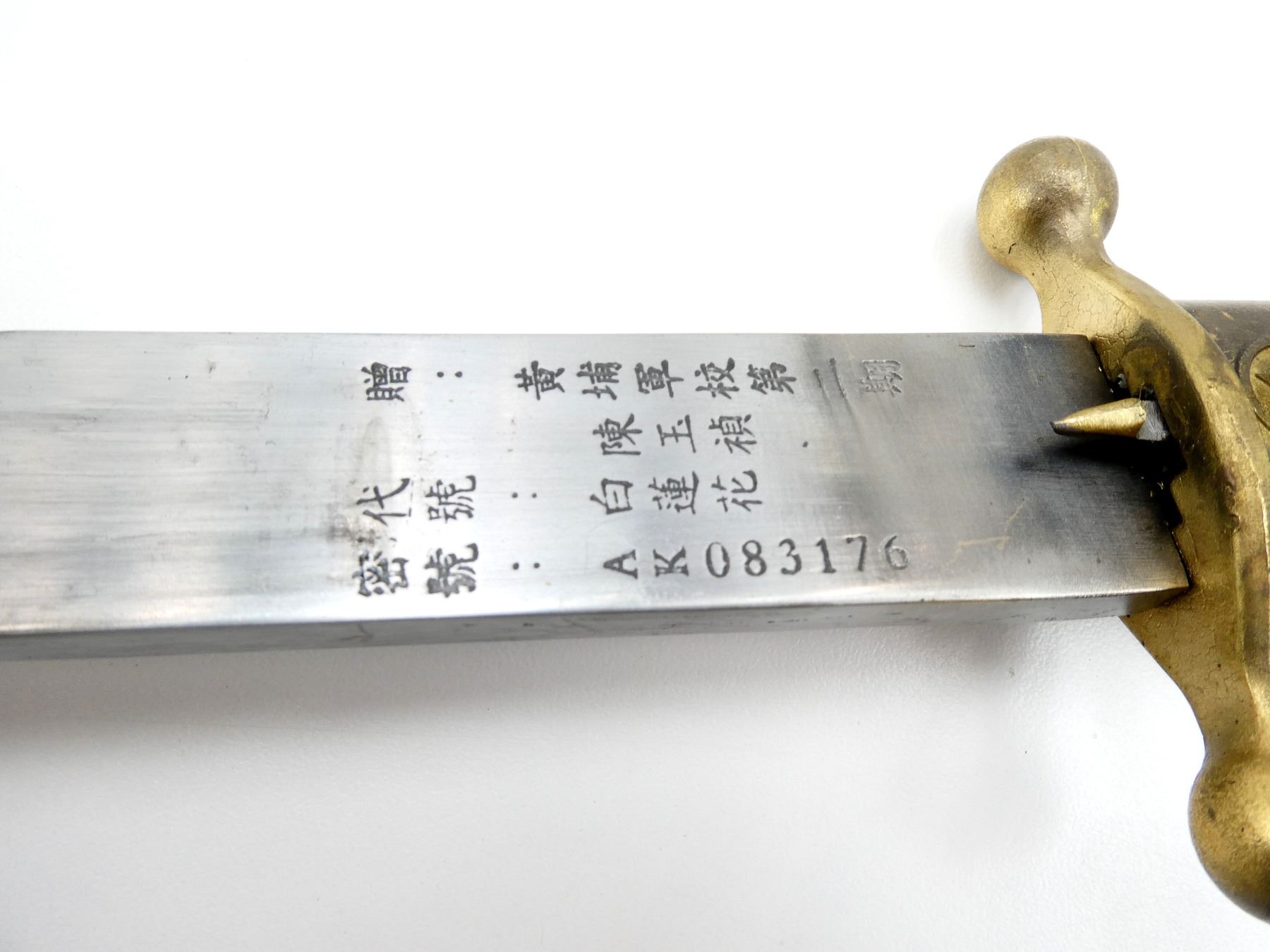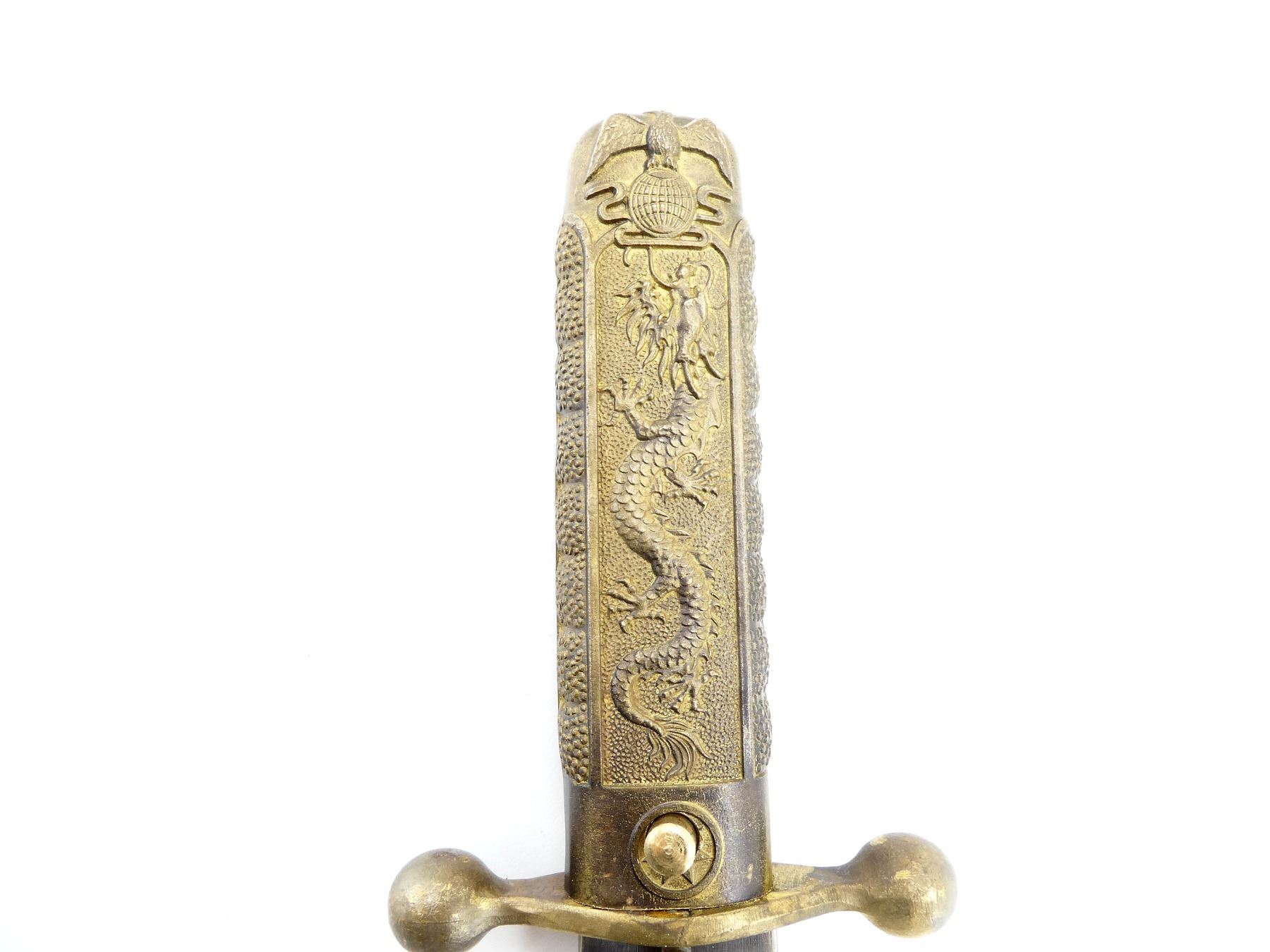 LOT INCLUDES; (1) DOUBLE-EDGED DAGGER, RICASSO MARKED WITH VARIOUS CHINESE CHARACTERS ON EITHER SIDE & "AK083176", BRASS CROSS-GUARD, GRIP & POMMEL, SCABBARD RELEASE BUTTON WITH SUN DESIGN, DECORATIVE DRAGON DESIGN ON EITHER SIDE OF GRIP, DECORATIVE GLOBE WITH EAGLE DESIGN ON POMMEL, PEBBLING ON GRIP, BRASS SCABBARD WITH BRASS ENDS, VARIOUS CHINESE CHARACTERS ON EITHER SIDE OF SCABBARD, DECORATIVE DRAGON WITH FLAGS ON THROAT END, DECORATIVE DRAGON DESIGNS ON TIP, BLADE APPROX. 11 3/8", OAL APPROX. 15 5/8", (1) BLACK / WHITE PHOTO OF VARIOUS CHINESE SOLDIERS MEETING WITH ANOTHER MILITARY GROUP, VARIOUS CHINESE CHARACTERS ALONG BOTTOM OF PHOTO & (1) DOCUMENT MARKED: "THE CENTRAL BANK OF CHINA" WITH CHINESE / AMERICAN FLAGS, VARIOUS CHINESE CHARACTERS. SEE PHOTOS.