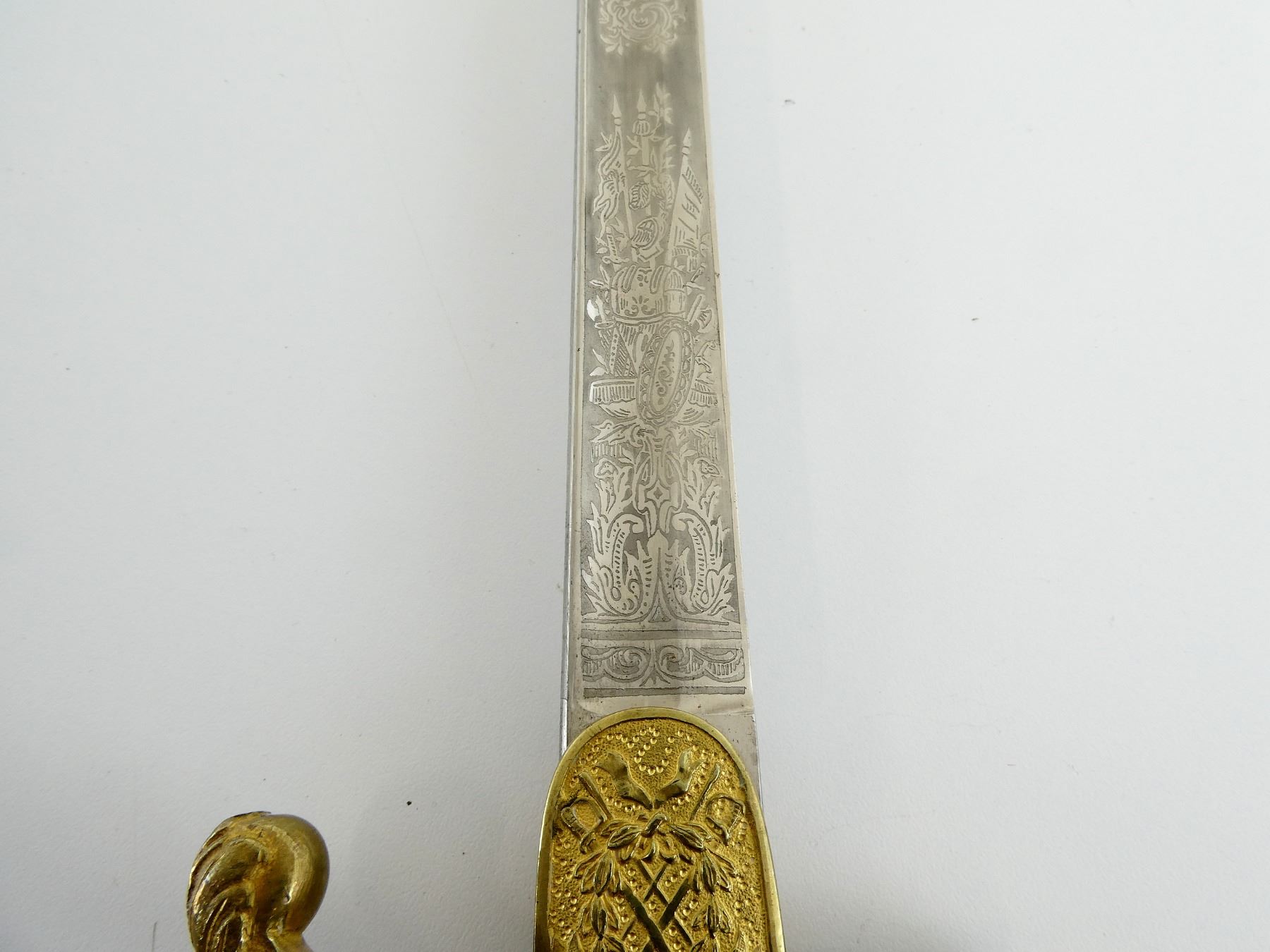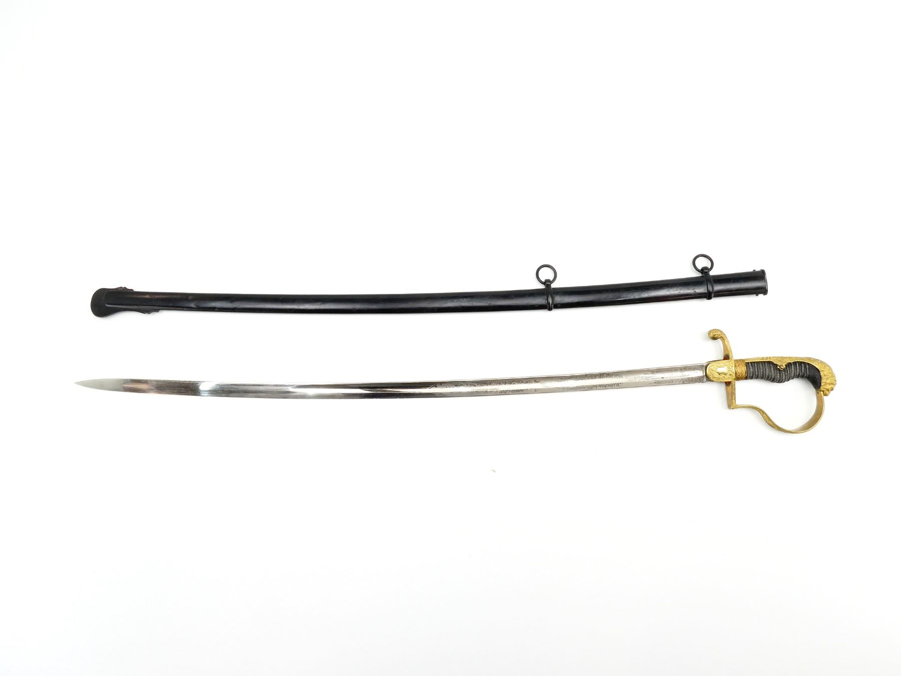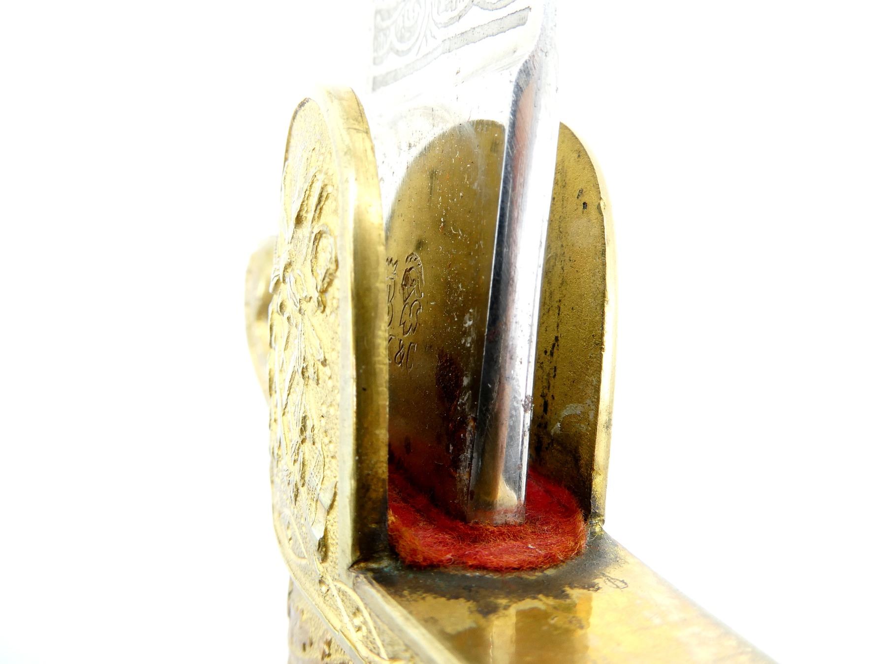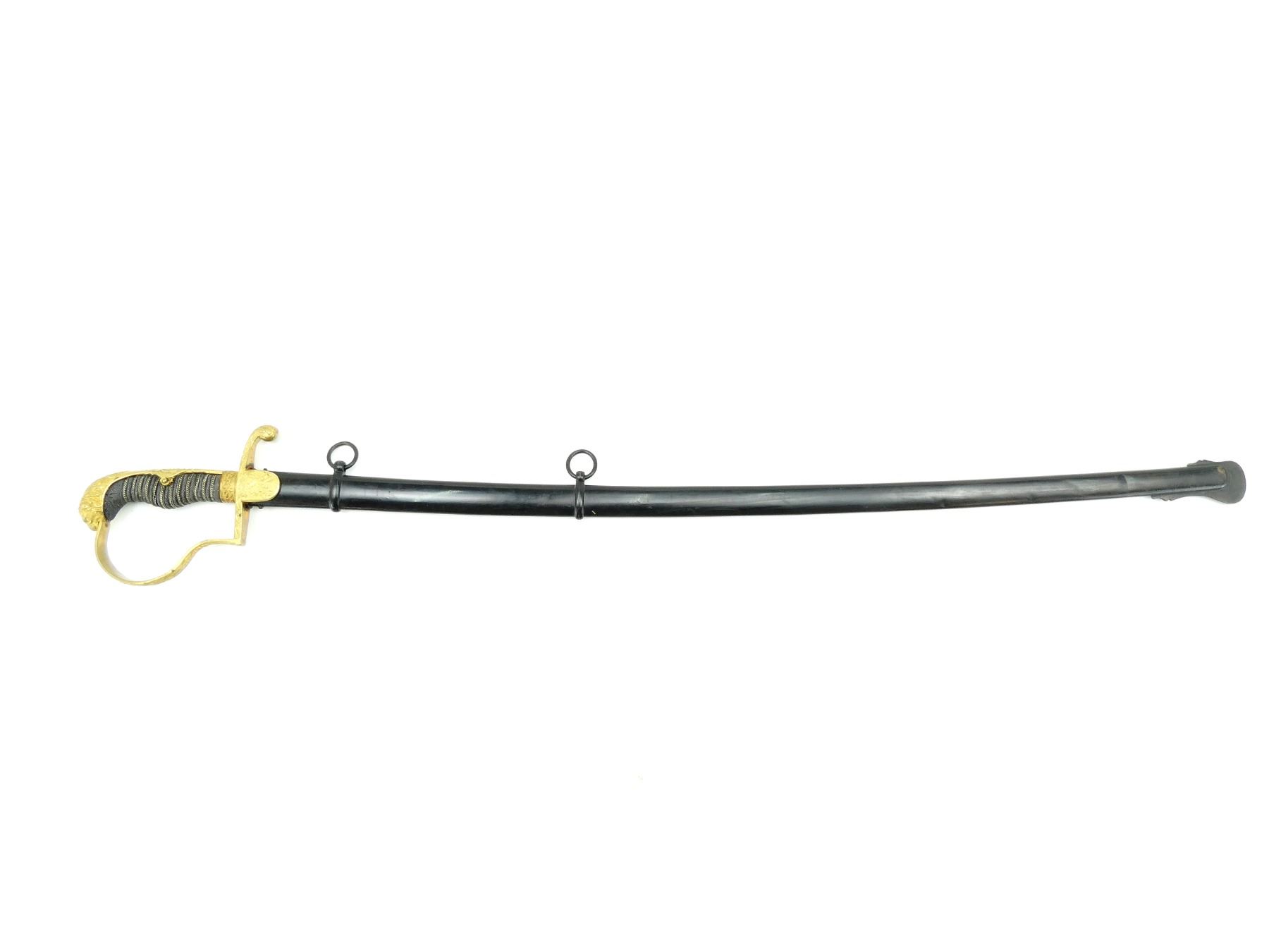 (1) SLIGHTLY CURVED SINGLE-FULLERED BLADE, RICASSO MARKED: KING'S HEAD, KNIGHT'S HEAD OVER "WK&C", EITHER SIDE OF BLADE DECORATIVELY ACID ETCHED, SOME CHIPS / PITTING ON BLADE EDGE, DECORATIVE OAK LEAF ACID ETCHING ON SPINE OF BLADE, DECORATIVE BRASS CROSS-PIECE WITH CROSSED FLAGS / SWORD DESIGN ON ONE SIDE, OTHER-SIDE WITH FLORAL / OAK LEAF DESIGN, OAK LEAF & ACORN PATTERN JUST ABOVE CROSS-GUARD, BLACK TRIPLE WIRE WRAPPED GRIP, ALL WIRE IS TWISTED, SMALL PIECE OF WIRE MISSING FROM ONE OF THE GROOVES, D-SHAPED HILT WITH LEAVES / SWORDS / SHIELD DESIGN, BRASS LION'S HEAD SHAPED POMMEL WITH LEAF / FLORAL DESIGN ALONG BRASS ON BACKSIDE OF GRIP, NO VISIBLE MARKINGS, BLACK PAINTED METAL SCABBARD, TWO HANGERS, NO VISIBLE MARKINGS, BLADE APPROX. 31.25" & OAL APPROX. 36 7/8". SEE PHOTOS.