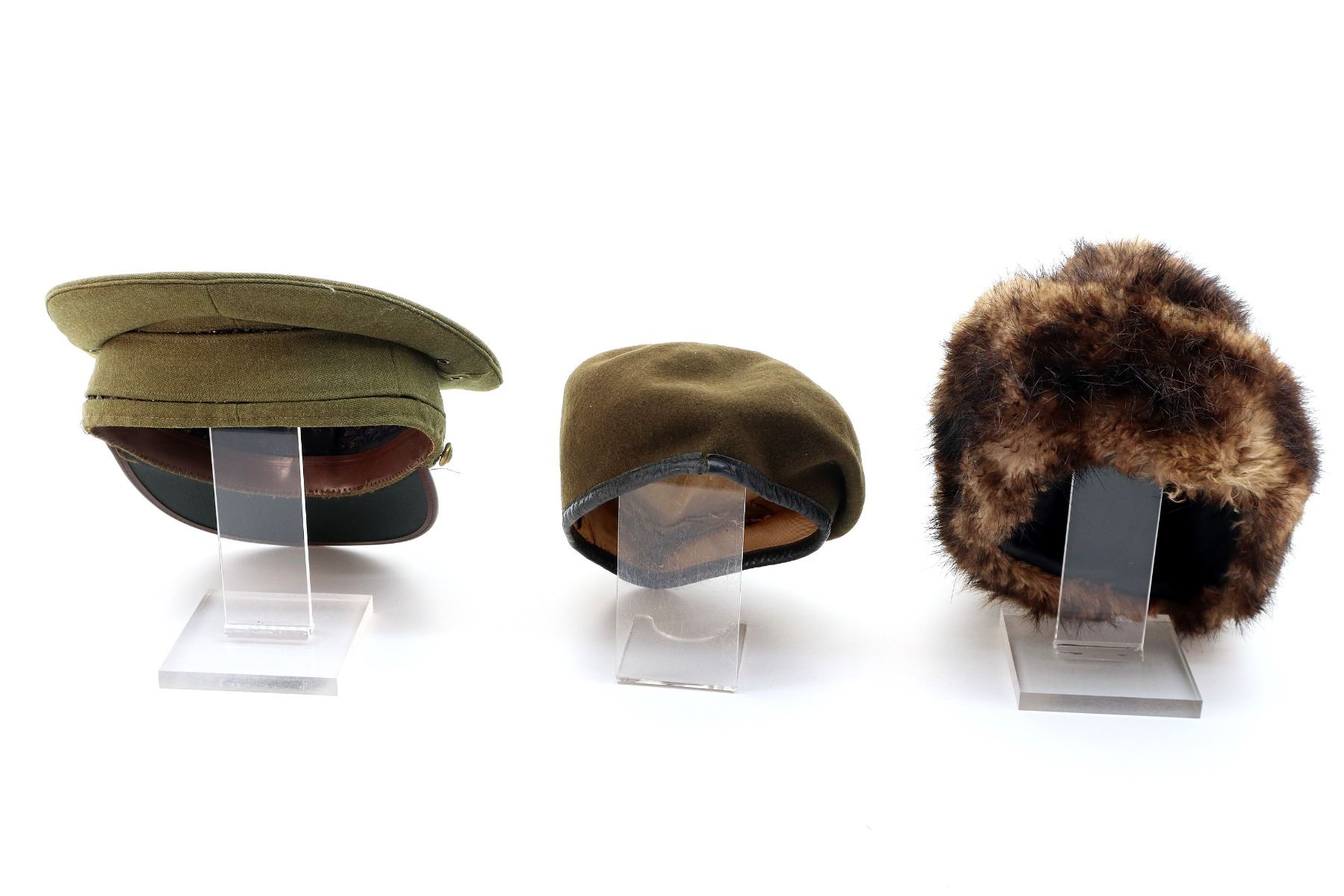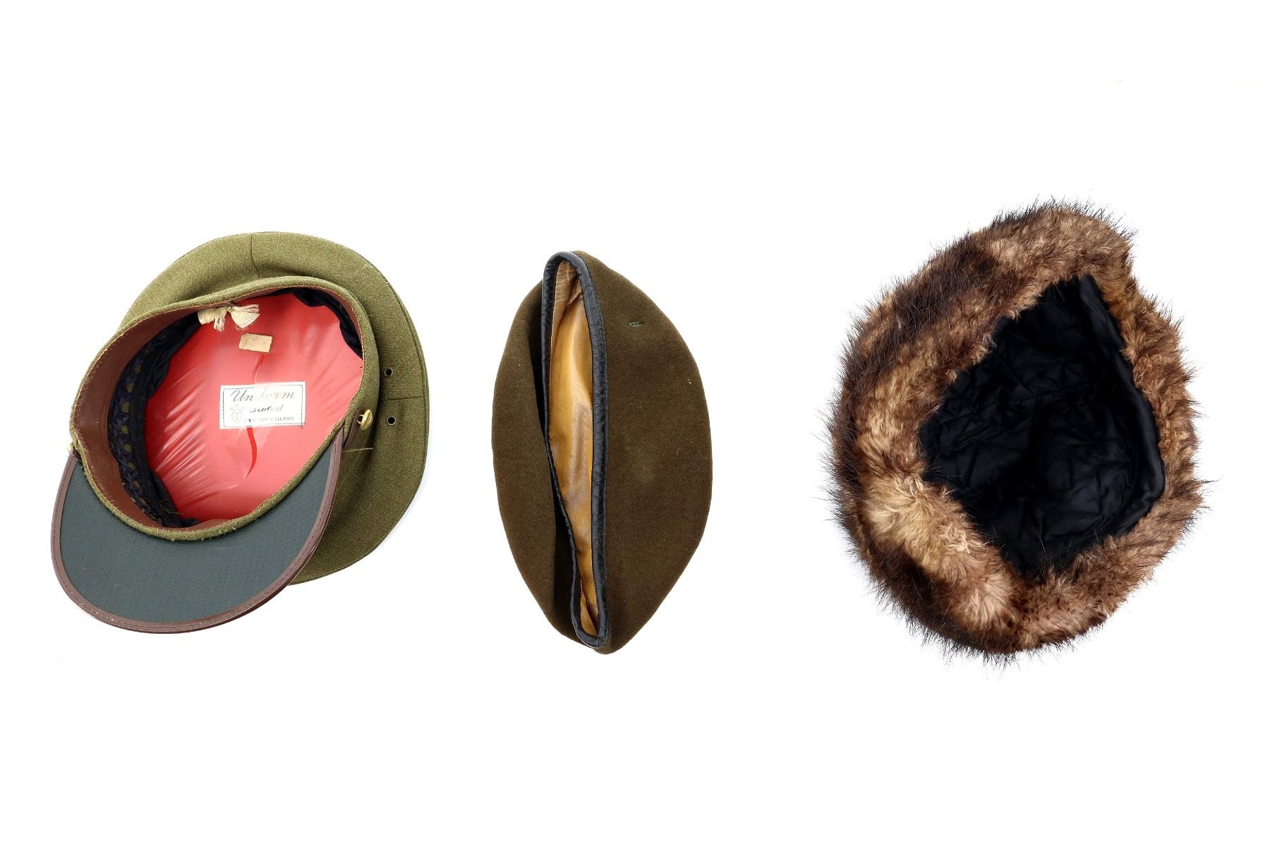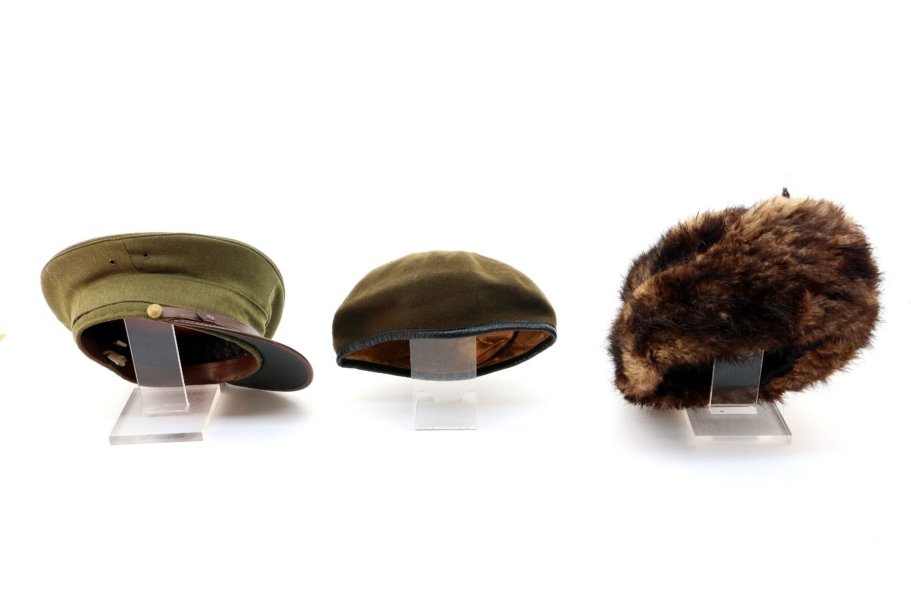 LOT INCLUDES; (1) GREEN WOOL BERET, MARKED: "K.M.A., 1989, 59", SHOWS AGE / WEAR, (1) GREEN WOOL PEAKED CAP, MARKED: "UNIFORM STYLED BY TIP TOP TAILORS, BROWN LEATHER / PLASTIC CHIN STRAP, BRASS QUEEN'S CROWN BUTTONS, SIZE 7 1/4, SHOWS AGE / WEAR & (1) MUSKRAT STYLE FUR WINTER HAT, NO VISIBLE MARKINGS, CANVAS CHIN STRAPS, SIZE UNKNOWN. SEE PHOTOS.