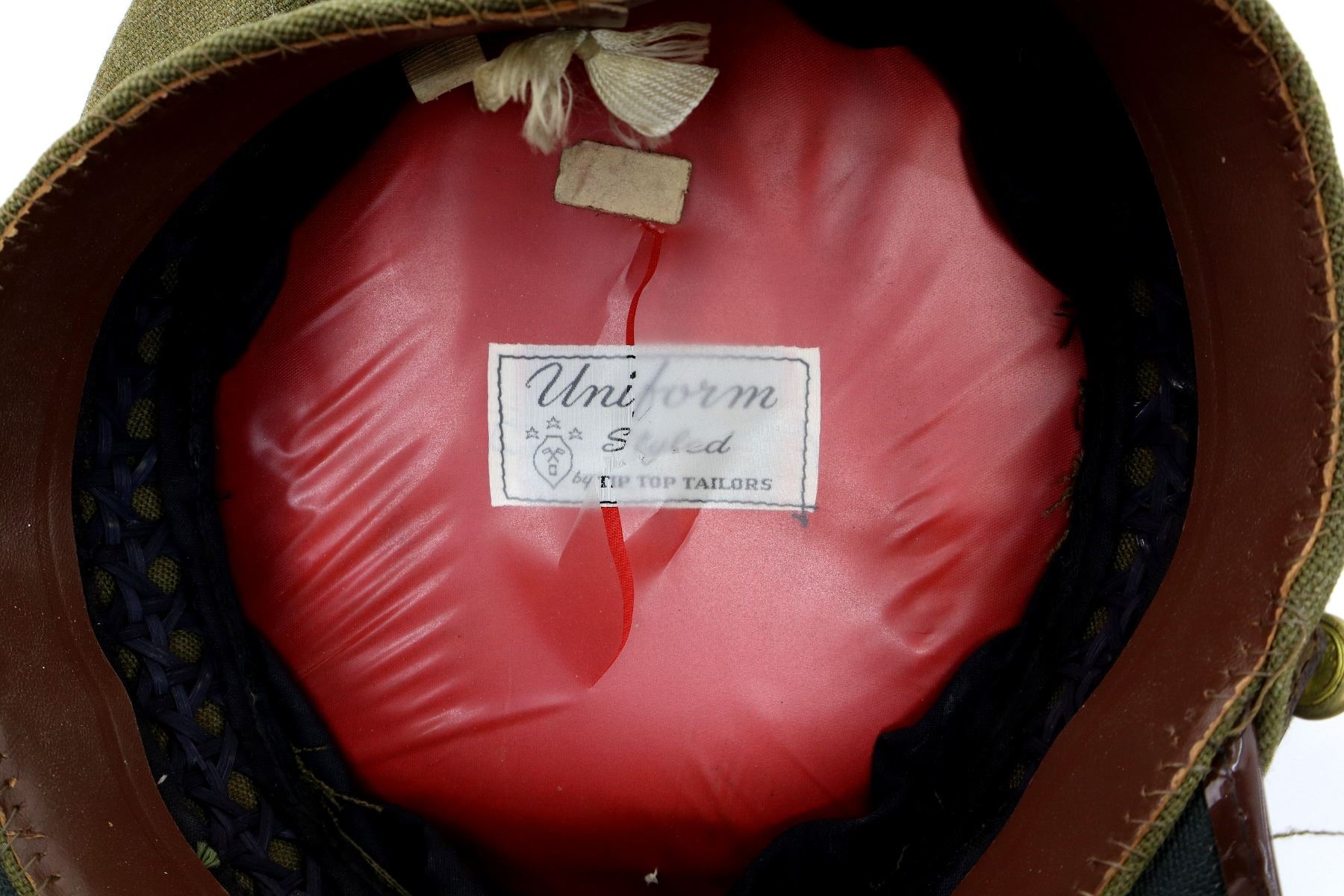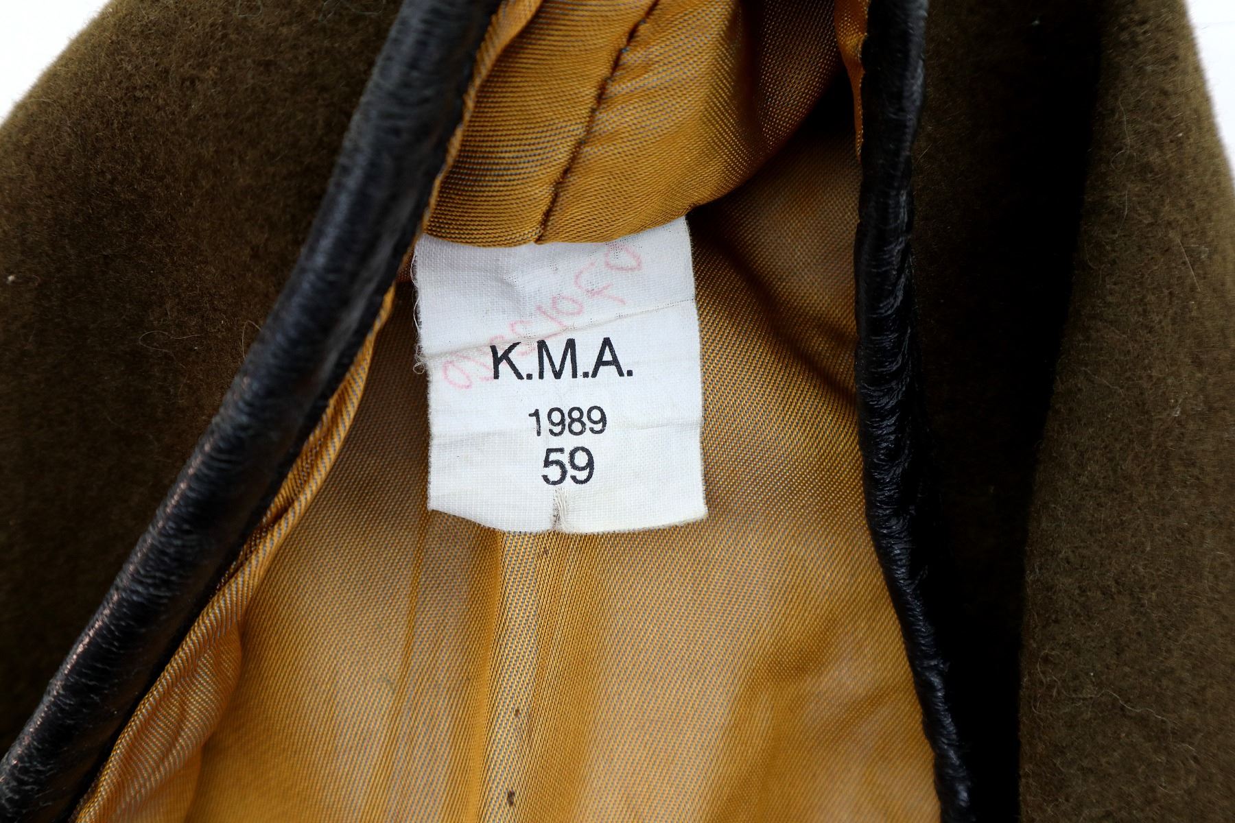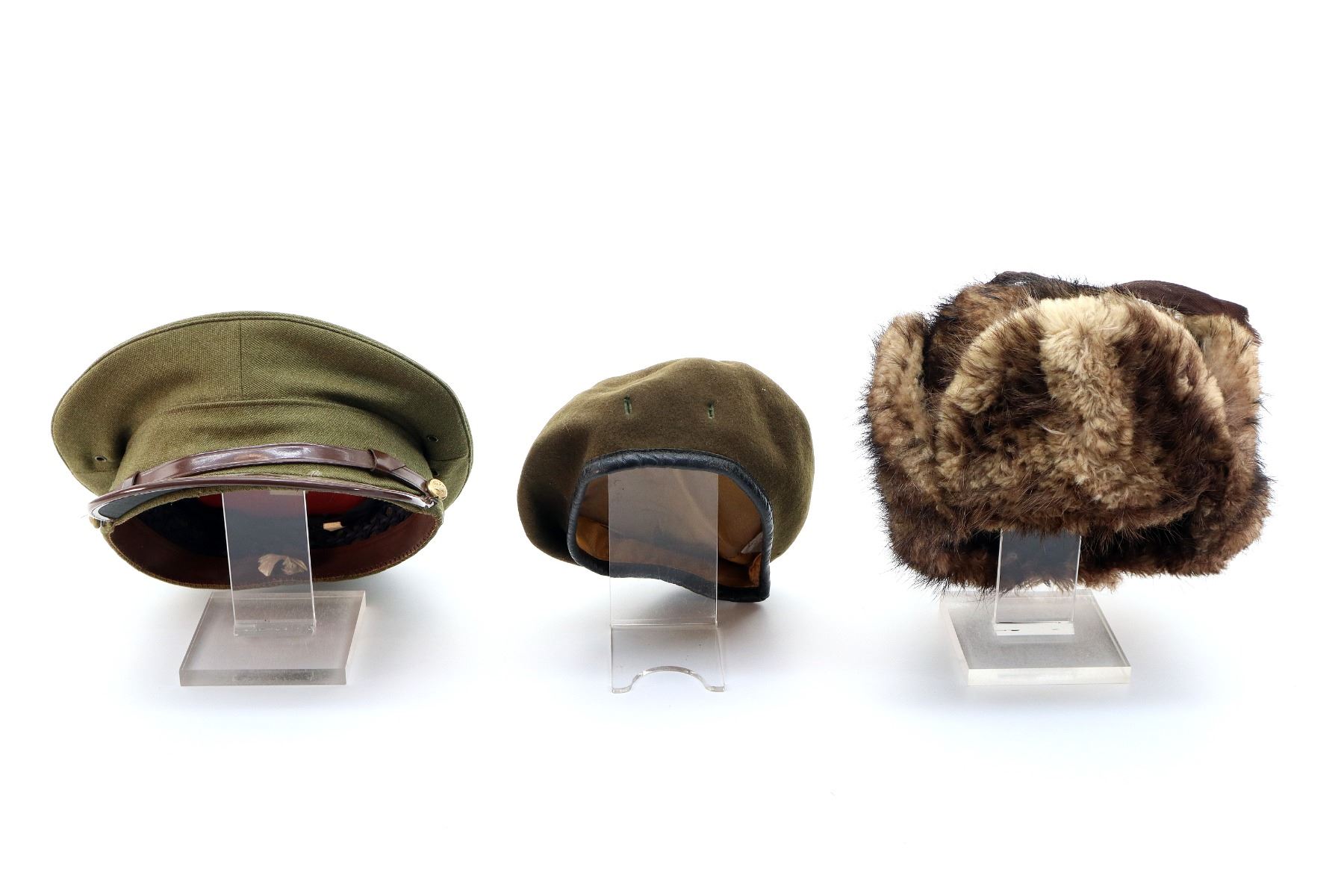 LOT INCLUDES; (1) GREEN WOOL BERET, MARKED: "K.M.A., 1989, 59", SHOWS AGE / WEAR, (1) GREEN WOOL PEAKED CAP, MARKED: "UNIFORM STYLED BY TIP TOP TAILORS, BROWN LEATHER / PLASTIC CHIN STRAP, BRASS QUEEN'S CROWN BUTTONS, SIZE 7 1/4, SHOWS AGE / WEAR & (1) MUSKRAT STYLE FUR WINTER HAT, NO VISIBLE MARKINGS, CANVAS CHIN STRAPS, SIZE UNKNOWN. SEE PHOTOS.