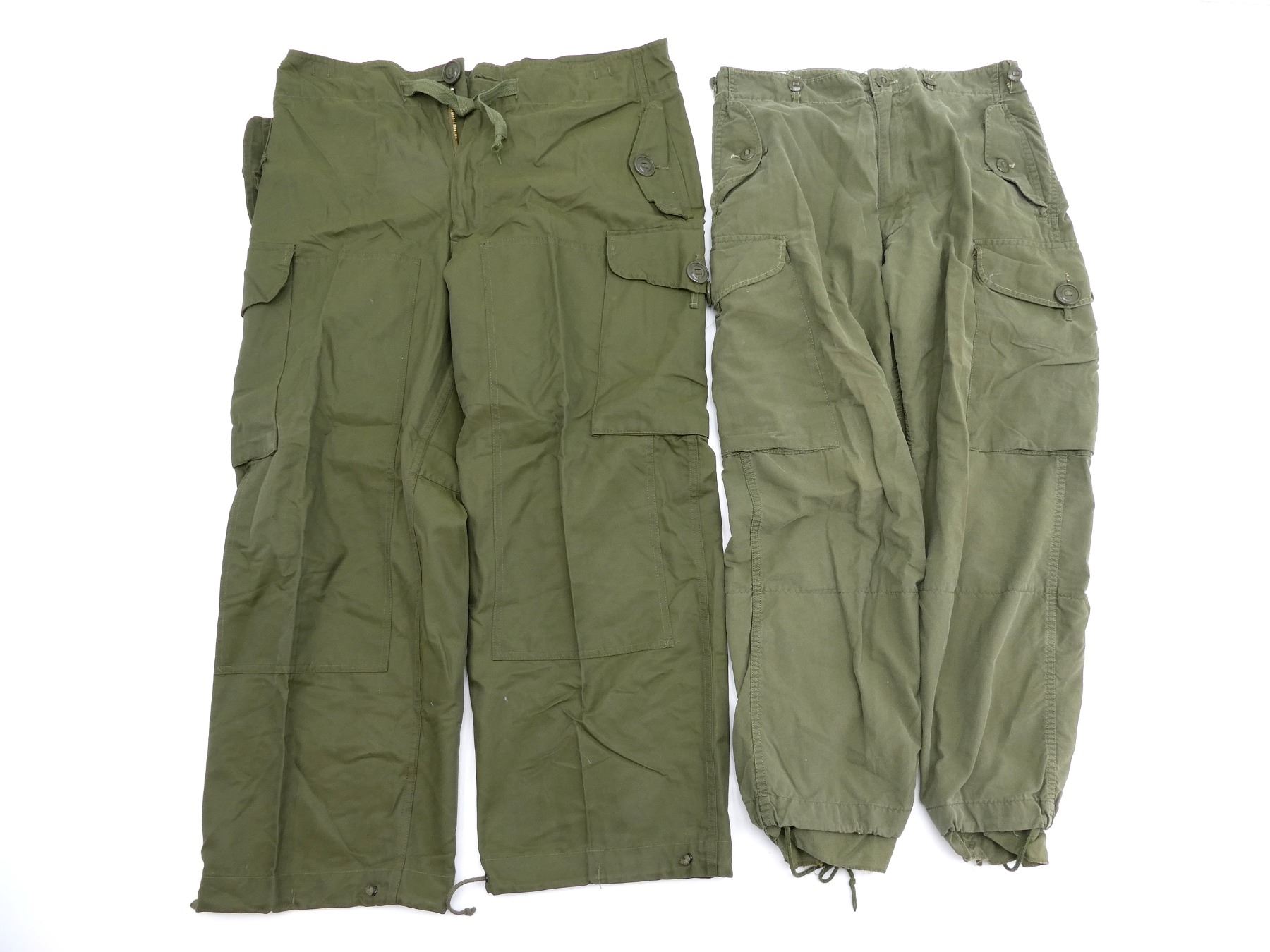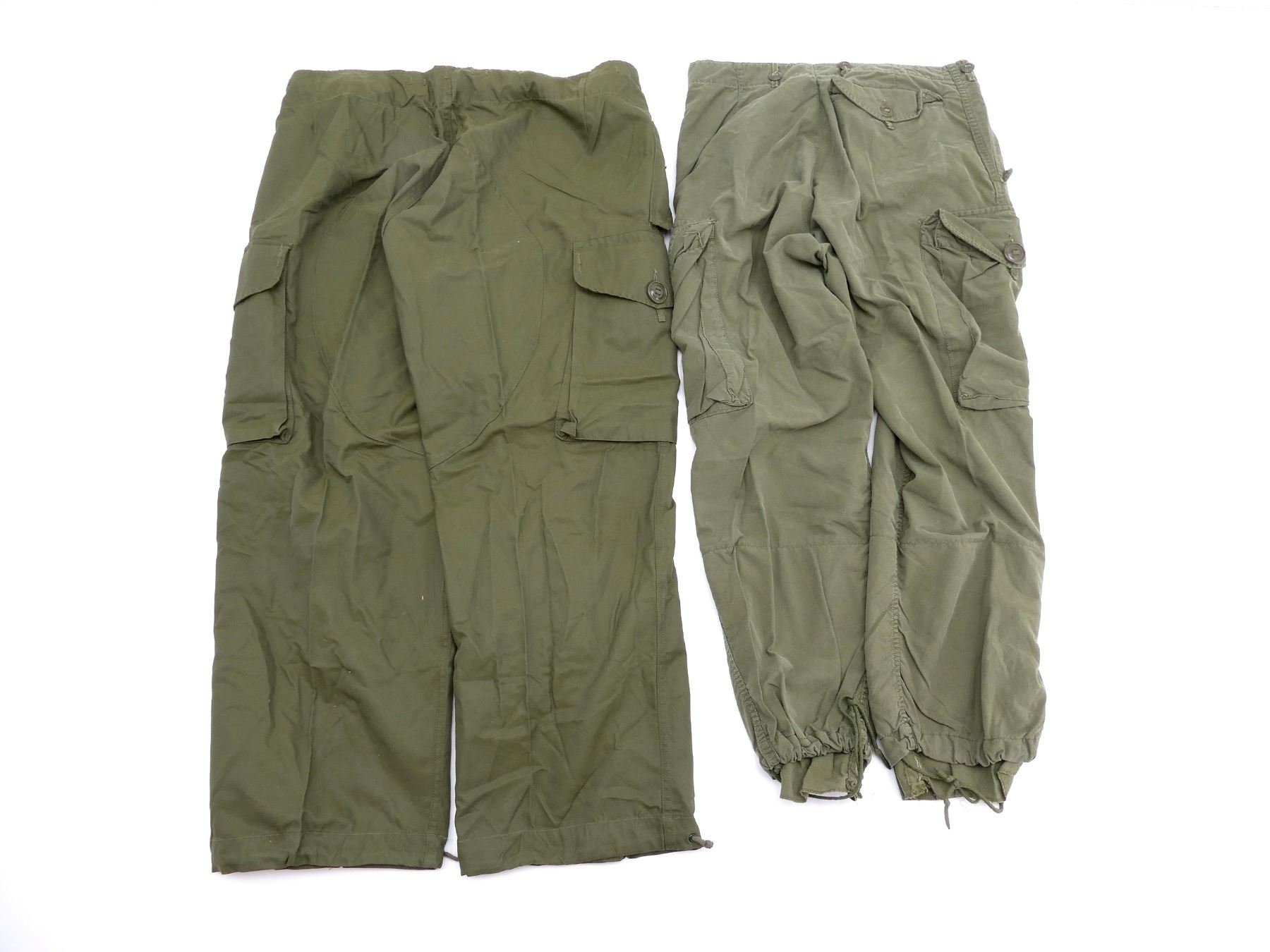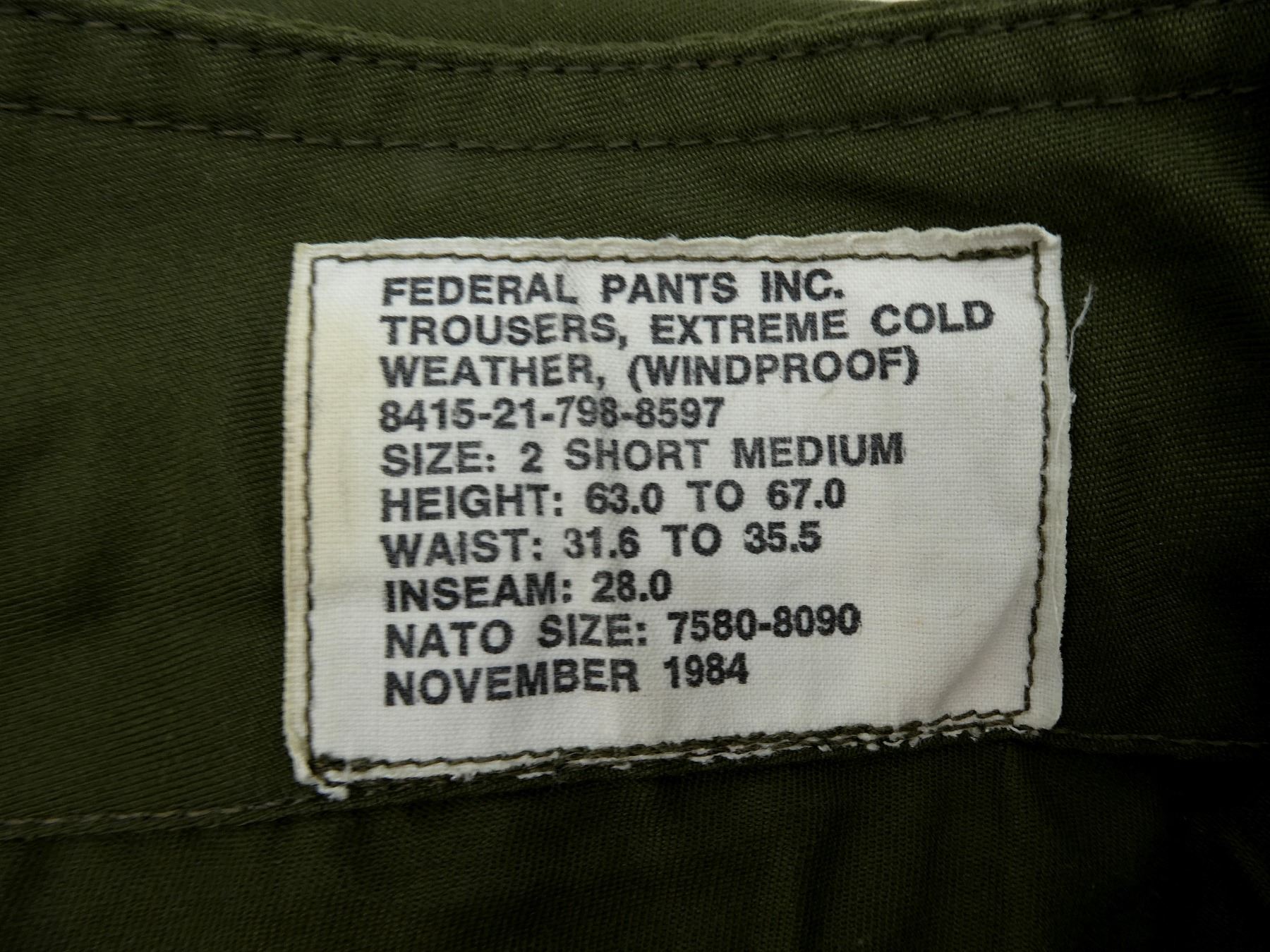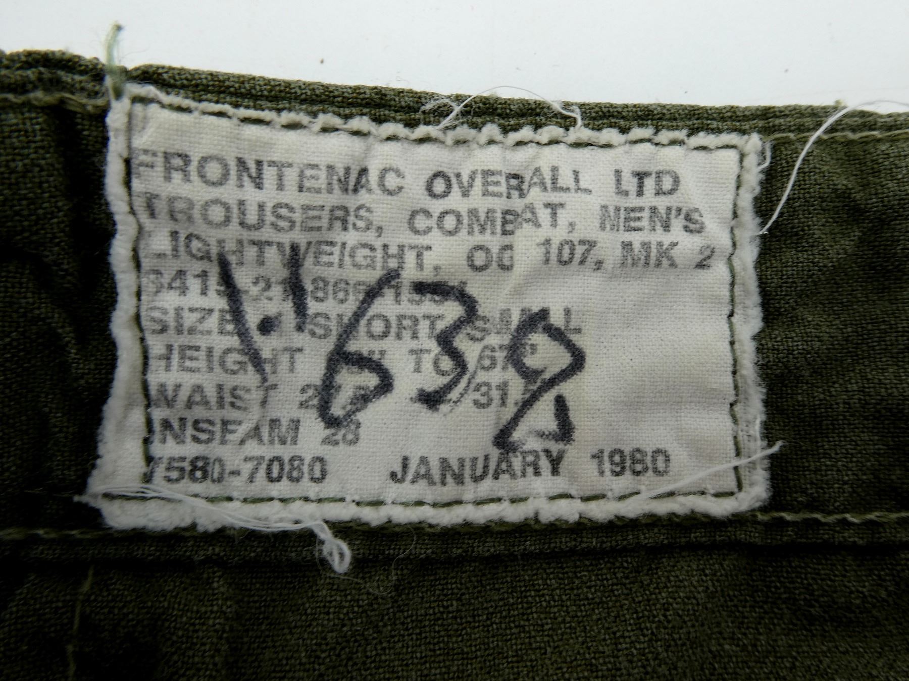 LOT INCLUDES: (1) GREEN CANVAS COMBAT PANTS, MARKED: "FRONTENAC OVERALL LTD TROUSERS, COMBAT, MEN'S LIGHTWEIGHT, OG 107, MK 2, SIZE 2 SHORT SMALL, 63.0 TO 6.7.0, WAIST 31.6 TO 35.5, INSEAM 28, JANUARY 1980" (1) GREEN CANVAS COMBAT PANTS, MARKED: "FEDERAL PANTS INC. TROUSERS, EXTREME COLD WEATHER, (WINDPROOF) 8415-21-798-8597, SIZE: 2 SHORT MEDIUM, HEIGHT 63.0 TO 67.0, WAIST: 31.6 TO 35.5, INSEAM: 28.0, NATO SIZE: 7580-8090, NOVEMBER 1984". SEE PHOTOS.