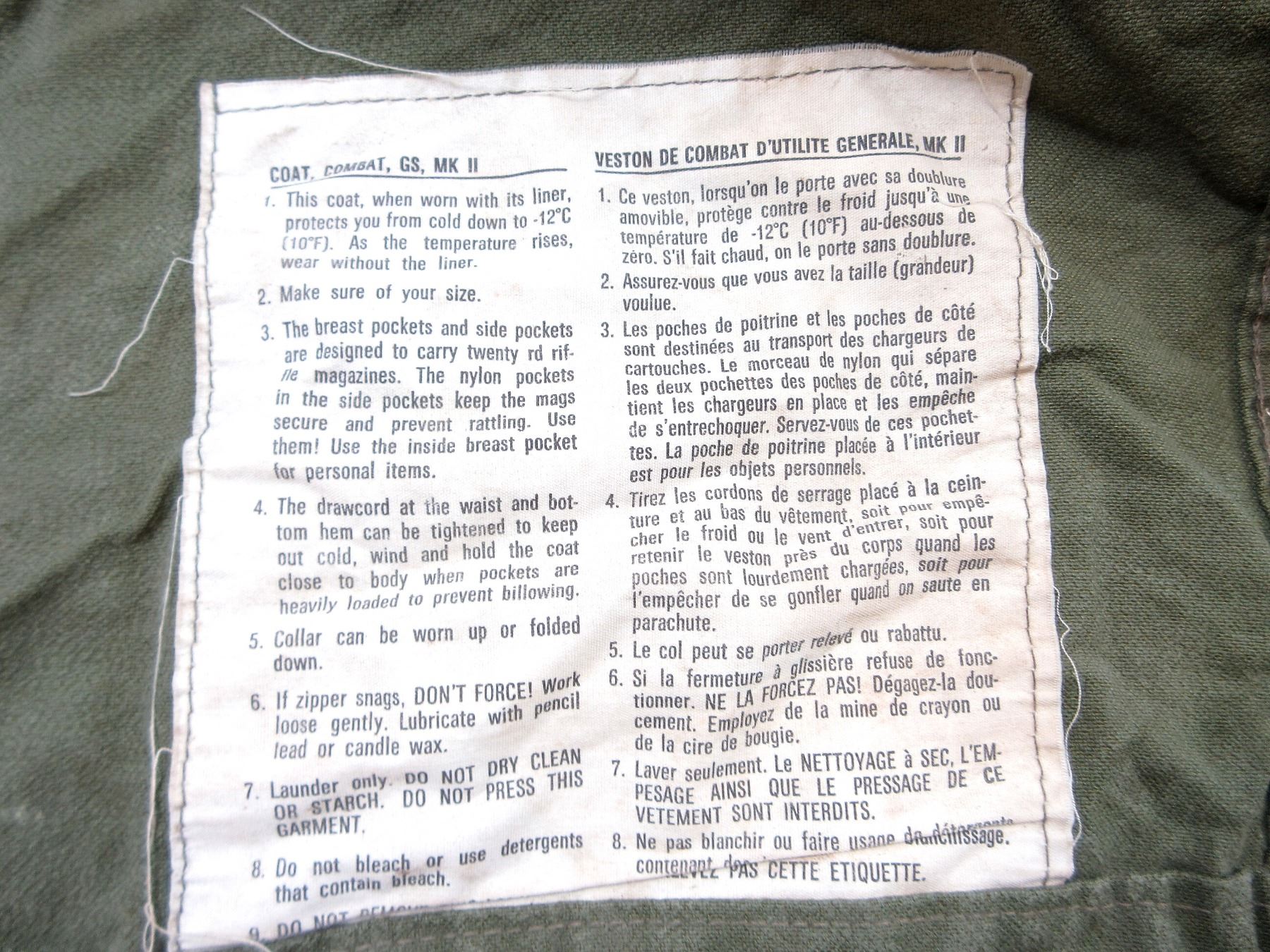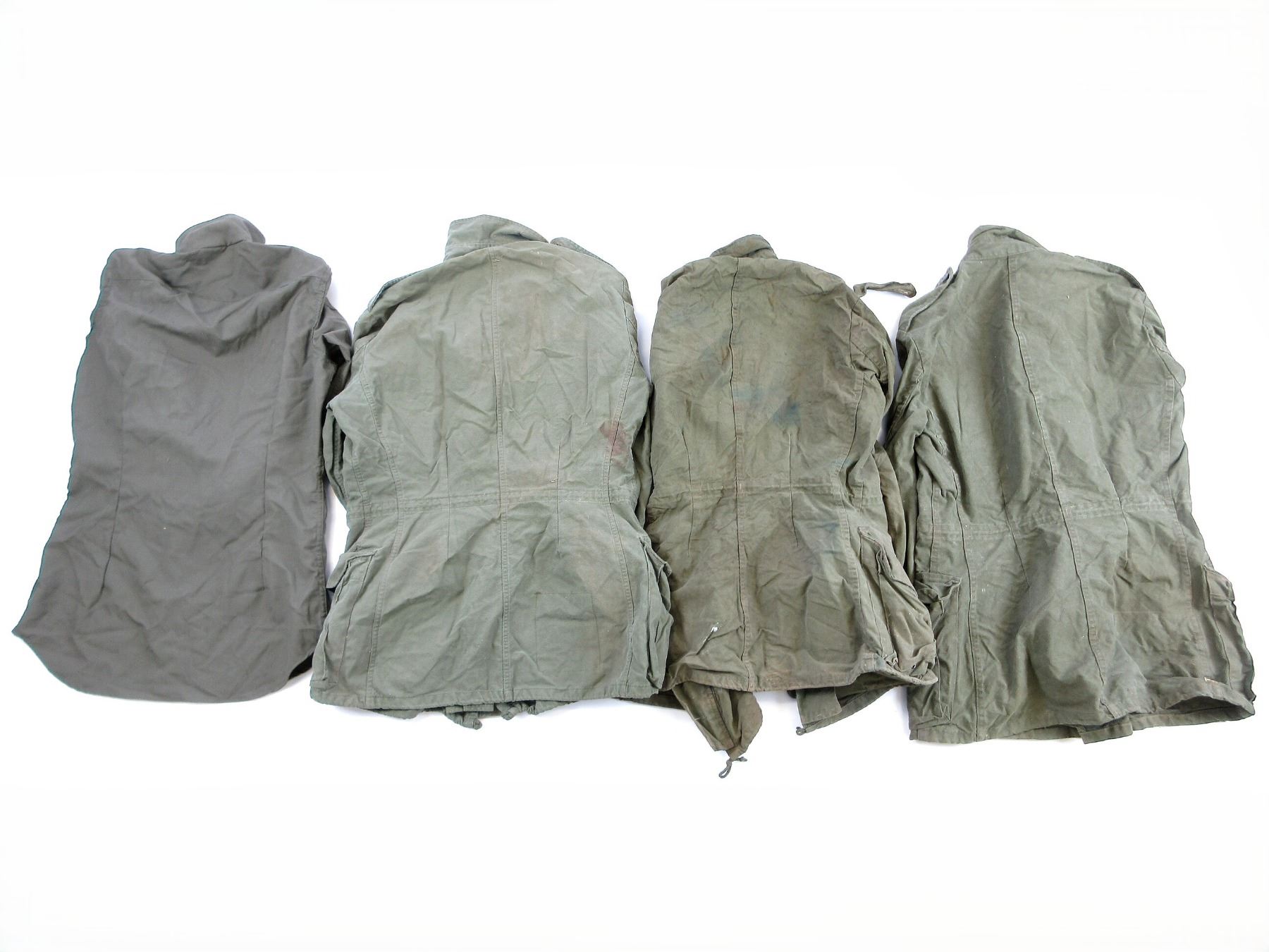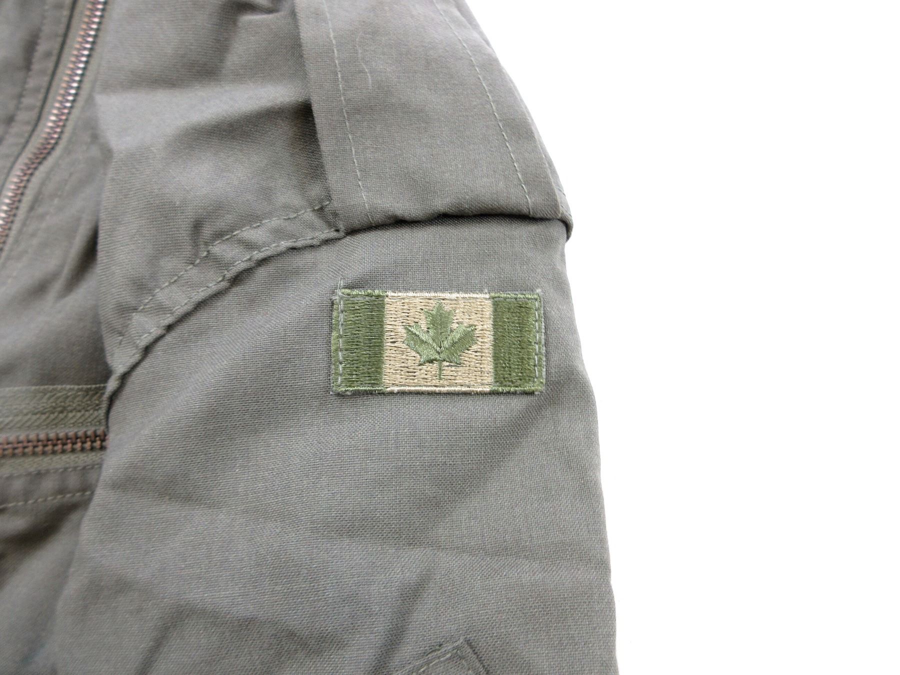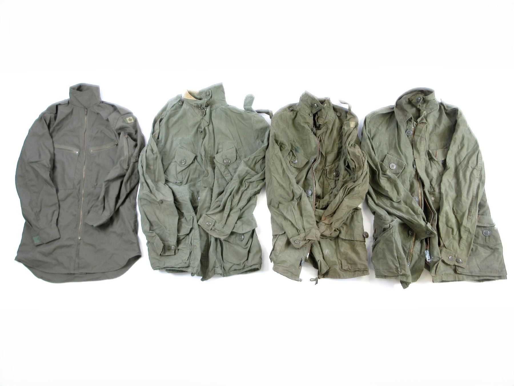 LOT INCLUDES; (1) RCAF GREEN FLIGHT / TACTICAL HELICOPTER SHIRT, MARKED: "SPORTIVE MFG. INC., SHIRT, TACTICAL HELICOPTER, 8415-21-899-2450, SIZE: 7038 REGULAR SMALL" ETC., ZIPPERED-FRONT / VARIOUS ZIPPERS (ALL WORK) & (3) GREEN CANVAS GS MKII COMBAT COATS, SIZES 5 REGULAR-MEDIUM / 8 LONG-MEDIUM, VARIOUS LABELS / MARKINGS ON ALL, BUTTON / ZIPPERED FRONTS, ONE WORKS, TWO DO NOT (CORRODED), ALL SHOW AGE / WEAR / TEAR. SEE PHOTOS.